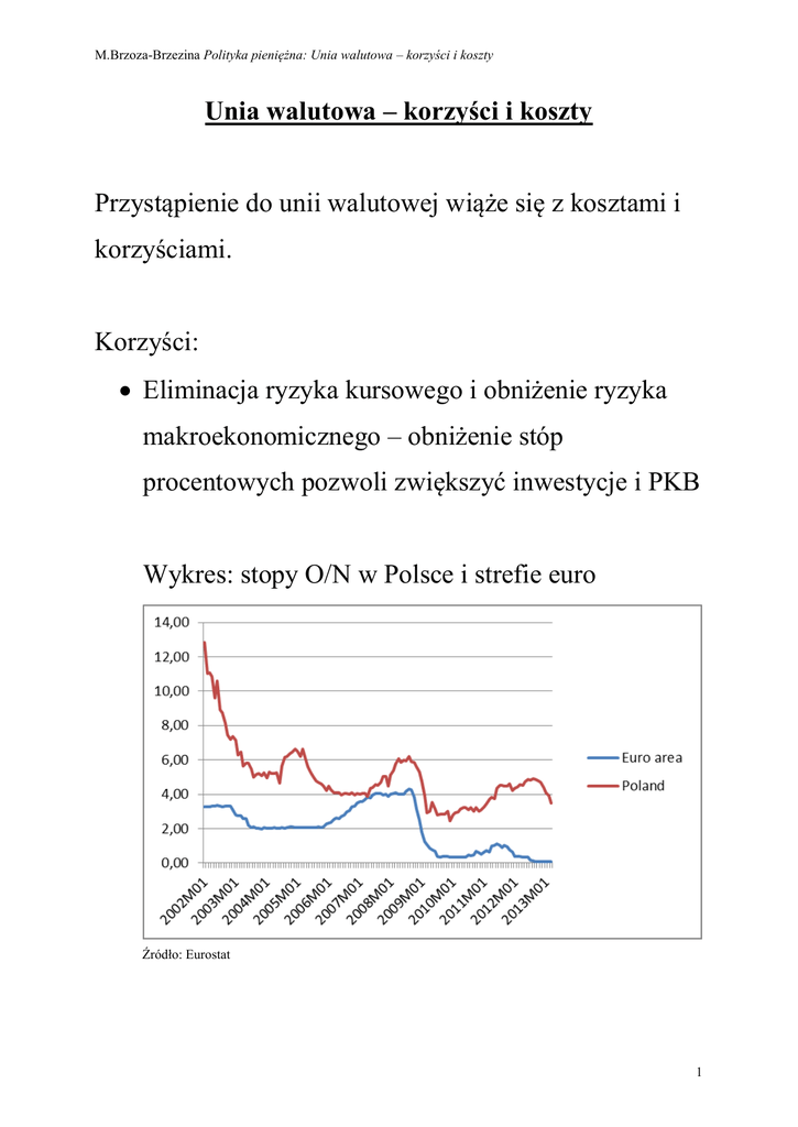 M.Brzoza-Brzezina Polityka pieniężna: Unia walutowa – korzyści i koszty Unia walutowa – korzyści i koszty Przystąpienie do unii walutowej wiąże się z kosztami i korzyściami. Korzyści: Eliminacja ryzyka kursowego i obniżenie ryzyka makroekonomicznego – obniżenie stóp procentowych pozwoli zwiększyć inwestycje i PKB Wykres: stopy O/N w Polsce i strefie euro Źródło: Eurostat 1 M.Brzoza-Brzezina Polityka pieniężna: Unia walutowa – korzyści i koszty Wykres: rentowność 10-letnich obligacji skarbowych w Polsce i strefie euro Źródło: Eurostat Eliminacja kosztów transakcyjnych – szacowane na 0,1-0,2% PKB. Eliminacja wahań kursowych – stabilizacja warunków sprzyja kreacji handlu. Ale: (i) bardzo nieprecyzyjne szacunki (ii) trade creation vs. trade diversion. 2 M.Brzoza-Brzezina Polityka pieniężna: Unia walutowa – korzyści i koszty Większa przejrzystość cen – pozwala lepiej alokować zasoby. Koszty: Ryzyko przegrzania gospodarki (boom-bust cycle) – obniżenie stóp procentowych może doprowadzić do wzrostu popytu, boomu kredytowego, wzrostu inflacji, utraty konkurencyjności i spowolnienia. Źródło: Brzoza-Brzezina i in. 2010 Wzrost cen w momencie przystąpienia – przeciętnie niewielki (0,1-0,3 pkt. proc.) ale skoncentrowany wśród często kupowanych towarów i usług. 3 M.Brzoza-Brzezina Polityka pieniężna: Unia walutowa – korzyści i koszty Utrata niezależnej polityki pieniężnej – krajowa polityka pieniężna oraz płynny kurs walutowy pozwalają amortyzować wstrząsy. Te mechanizmy znikają wraz z przystąpieniem do unii walutowej. Na symetryczne wstrząsy reaguje wspólny bank centralny. Nie zareaguje on natomiast na wstrząs asymetryczny. Wpływ asymetrycznego wstrząsu popytowego (pochodzącego z wewnątrz Unii) Założenia: 2 kraje tworzą Unię Walutową. Jest zatem jedna waluta, jeden bank centralny, jedna polityka pieniężna. W kraju B wybucha epidemia, konsumenci krajów A i B ograniczają znacząco popyt na produkty pochodzące z kraju B. 4 M.Brzoza-Brzezina Polityka pieniężna: Unia walutowa – korzyści i koszty A B P P AS AD AS AD Y Y W kraju B spada popyt, a tym samym poziom cen i produkcja. Rośnie bezrobocie. W kraju A produkcja zaczyna przekraczać poziom potencjalny (bo popyt został skierowany na dobra krajowe), wzrastają ceny. Inflacja w całej unii walutowej nie ulega zmianie. Gdyby nie było unii walutowej, mechanizm dostosowawczy mógłby wykorzystać następujące elementy: 1. Bank centralny z kraju B luzuje politykę pieniężną. Rośnie popyt wewnętrzny, gospodarka powraca do stanu równowagi. 5 M.Brzoza-Brzezina Polityka pieniężna: Unia walutowa – korzyści i koszty 2. Na skutek spadku eksportu wzrasta deficyt rachunku obrotów bieżących, co przy kursie płynnym powoduje deprecjację waluty krajowej i wzrost popytu. W unii te mechanizmy są wyłączone. Alternatywnie: 1. Przepływ siły roboczej z kraju B do A 2. Spadek cen i płac w kraju B 1) Przepływ siły roboczej Spadek podaży pracy w kraju B zmniejsza potencjał produkcyjny. Natomiast w kraju A potencjał wzrasta. A B P P AS AD Y AS AD Y Ostatecznie, poziom cen w krajach A i B powraca do poziomu wyjściowego, produkcja w kraju trwale A 6 M.Brzoza-Brzezina Polityka pieniężna: Unia walutowa – korzyści i koszty rośnie, w kraju trwale B spada. Produkt per capita nie ulega zmianie. Przeszkody w tego typu dostosowaniu: - niska mobilność siły roboczej - ograniczenia instytucjonalne 2) Spadek cen i płac w kraju B Dostosowanie jak po krajowym wstrząsie popytowym: A B P P AS AD AS Y AD Y Przeszkody w tego typu dostosowaniu: - sztywność płac nominalnych - scentralizowane negocjacje płacowe. 7 M.Brzoza-Brzezina Polityka pieniężna: Unia walutowa – korzyści i koszty Dlatego istotne dla obniżenia kosztów związanych ze wstrząsami asymetrycznymi: zbieżność cykli koniunkturalnych Źródło: NBP wysoka mobilność siły roboczej wysoka elastyczność płac elastyczność i skuteczność polityki fiskalnej Przykład: kontrfaktyczna symulacja cyklu koniunkturalnego w Polsce w przypadku 8 M.Brzoza-Brzezina Polityka pieniężna: Unia walutowa – korzyści i koszty przystąpienia do strefy euro w 2007 r. (BrzozaBrzezina, Makarski, Wesołowski 2012). Pełne oszacowanie korzyści i kosztów jest niezwykle trudne. 9