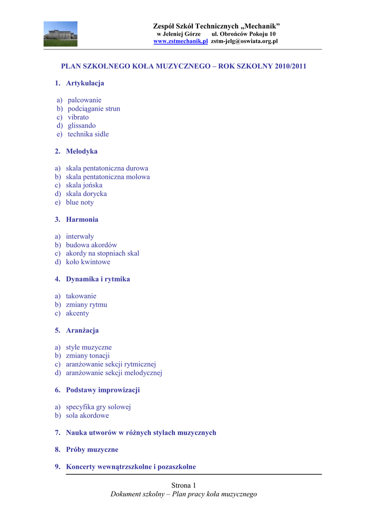 Zespół Szkół Technicznych „Mechanik” w Jeleniej Górze ul. Obrońców Pokoju 10 www.zstmechanik.pl [email protected] PLAN SZKOLNEGO KOŁA MUZYCZNEGO – ROK SZKOLNY 2010/2011 1. Artykulacja a) b) c) d) e) palcowanie podciąganie strun vibrato glissando technika sidle 2. Melodyka a) b) c) d) e) skala pentatoniczna durowa skala pentatoniczna molowa skala jońska skala dorycka blue noty 3. Harmonia a) b) c) d) interwały budowa akordów akordy na stopniach skal koło kwintowe 4. Dynamika i rytmika a) takowanie b) zmiany rytmu c) akcenty 5. Aranżacja a) b) c) d) style muzyczne zmiany tonacji aranżowanie sekcji rytmicznej aranżowanie sekcji melodycznej 6. Podstawy improwizacji a) specyfika gry solowej b) sola akordowe 7. Nauka utworów w różnych stylach muzycznych 8. Próby muzyczne 9. Koncerty wewnątrzszkolne i pozaszkolne Strona 1 Dokument szkolny – Plan pracy koła muzycznego Zespół Szkół Technicznych „Mechanik” w Jeleniej Górze ul. Obrońców Pokoju 10 www.zstmechanik.pl [email protected] 10. Udział w sesjach nagraniowych 11. Udział w warsztatach artystycznych Paweł Wrocławski Nauczyciel ZST „Mechanik” w Jeleniej Górze Strona 2 Dokument szkolny – Plan pracy koła muzycznego Zespół Szkół Technicznych „Mechanik” w Jeleniej Górze ul. Obrońców Pokoju 10 www.zstmechanik.pl [email protected] Strona 3 Dokument szkolny – Plan pracy koła muzycznego