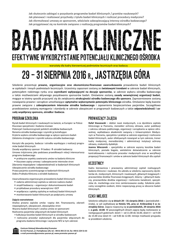 Jak skutecznie zabiegać o pozyskanie programów badań klinicznych / grantów naukowych? Jak planować i realizować przychody z tytułu badań klinicznych i rozliczać procedury medyczne? Jak sformułować umowę ze sponsorem, właściwie zabezpieczającą interesy ośrodka badawczego? Jak przygotować się na kontrole związane z realizacją programów badań klinicznych? badania kliniczne Efektywne wykorzystanie potencjału klinicznego ośrodka warsztaty dla kadry kierowniczej podmiotów leczniczych oraz badaczy 29 – 31 sierpnia 2016 r., jastrzębia Góra Szkolenie prezentuje prawne, organizacyjne oraz ekonomiczno-finansowe uwarunkowania prowadzenia badań klinicznych w szpitalach i innych podmiotach leczniczych. Uczestnicy zapoznani zostaną ze światowymi trendami w zakresie badań klinicznych, potencjałem rodzimego rynku oraz czynnikami wpływającymi na decyzje sponsorów, w zakresie wyboru ośrodka badawczego a także możliwościami aktywnego pozyskiwania sponsorów badań. Omówione zostaną zasady wewnętrznej organizacji badań, mogące w istotny sposób przyczynić się do zwiększenia atrakcyjności ośrodka badawczego dla sponsora. Zaprezentowane zostaną rozwiązania prawne i zarządcze umożliwiające optymalne wykorzystanie potencjału klinicznego ośrodka. Omówione będą kwestie prawne związane z zabezpieczeniem interesów ośrodka badawczego i zapewnienia bezpieczeństwa pacjentów. Szczegółowo przedstawione zostaną wymagania i standardy w zakresie ubezpieczeń w programach badawczych a także odpowiedzialność i zasady współpracy sponsora, ośrodka i badacza. PROGRAM SZKOLENIA PROWADZĄCY ZAJĘCIA Rynek badań klinicznych i naukowych na świecie, w Europie i w Polsce Kluczowe specjalności i badania niszowe Potencjał i konkurencyjność polskich ośrodków badawczych Renoma ośrodka badawczego i czynniki ją kształtujące Kryteria wyboru ośrodka badawczego w optyce sponsora badań Założenia strategiczne i czynniki sukcesu ośrodka badawczego Rafał Staszewski – doktor nauk medycznych, z-ca dyrektora szpitala klinicznego w Poznaniu, menedżer ochrony zdrowia, autor publikacji z zakresu zdrowia publicznego, organizacji i zarządzania w opiece zdrowotnej, wykładowca akademicki związany z Uniwersytetem Medycznym w Poznaniu, specjalista i praktyk w zakresie organizacji i rozliczania badań klinicznych, autor efektywnych rozwiązań w tym zakresie, trener kadry medycznej, menedżerskiej i administracji instytucji ochrony zdrowia, znakomity dydaktyk. Joanna Wieczorek – specjalistka w zakresie wyceny kosztów badań klinicznych, posiada bogate, wieloletnie doświadczenie w zakresie kontraktowania i rozliczania procedur medycznych oraz w weryfikacji propozycji finansowych i umów w zakresie badań klinicznych dla szpitali Korzyści dla pacjenta, badacza i ośrodka wynikające z realizacji programów badań klinicznych Zasady współpracy sponsor badacz ośrodek badawczy Umowa trójstronna jako podstawa prawidłowych relacji interesariuszy programu badawczego • praktyczne aspekty zawierania umów na badania kliniczne • kluczowe zapisy umowy i zabezpieczenie interesów stron Zdarzenia niepożądane i odpowiedzialność w badaniach klinicznych Ubezpieczenie ośrodka badawczego Prawa pacjenta uczestniczącego w badaniach klinicznych Dobra Praktyka Kliniczna a ośrodek badawczy Uwarunkowania organizacyjne prowadzenia badań klinicznych • zadania administracji szpitala w zakresie nadzoru badań • zespół badawczy – organizacja i dokumentowanie badań • przykładowe procedury wewnętrzne i GCP • współpraca z apteką szpitalną w realizacji badań klinicznych • monitorowanie badań klinicznych po podpisaniu umowy Zajęcia warsztatowe Analiza prawna zapisów umów –zapisy dot. finansowania, zdarzeń niepożądanych, ubezpieczeń, obowiązków stron Wycena badań klinicznych i analiza umów ze sponsorami Rozliczenia pacjentów włączonych do badań klinicznych • kalkulacja kosztów badań klinicznych w ośrodku badawczym • rozliczania procedur wykonanych dla pacjentów włączonych do programu badania klinicznego i wytyczne NFZ w tym zakresie Centrum Edukacji Menedżerskiej Promotor 61-512 Poznań, ul. Pamiątkowa 2/8, tel. +48 61 855 23 14, fax +48 61 224 51 63 e-mail [email protected], www.promotor.poznan.pl UCZESTNICY Kadra kierownicza i pracownicy administracji szpitali realizujących badania kliniczne i naukowe. Do udziału w szkoleniu zapraszamy dyrektorów ds. medycznych, klinicznych i naukowych, głównych księgowych i pracowników działów finansowo-księgowych, lekarzy – głównych badaczy, pracowników działów organizacji i rozliczania świadczeń, specjalistów ds. marketingu oraz inne zainteresowane osoby. Szkolenie polecamy szczególnie osobom, które rozpoczynają pracę w obszarze badań klinicznych. CZAS I MIEJSCE Szkolenie odbędzie się w dniach 29 – 31 sierpnia 2016 r. (poniedziałek środa), w sali wykładowej w Hotelu VIS, przy ul. Królewskiej 5 w Jastrzębiej Górze. Zajęcia rozpoczną się w poniedziałek, 29 sierpnia 2016 r. o godz. 10.00. W poszczególnych dniach zajęcia będą realizowane w następujących godzinach: dzień I – od 11.00 do 16.00, dzień II – od 9.00 do 15.00 oraz dzień III – od 9.00 do 12.00. Istnieje możliwość przyjazdu w przeddzień szkolenia. BADANIA KLINICZNE – WYKORZYSTANIE potencjału ośrodka WARUNKI UCZESTNICTWA Cena uczestnictwa jednej osoby w szkoleniu wynosi 980,- PLN netto*. Cena obejmuje zajęcia warsztatowe, konsultacje, bogate materiały szkoleniowe, w tym wzorcowe dokumenty, przybory do pisania, imienny certyfikat ukończenia szkolenia, poczęstunek, obiady. Cena nie obejmuje zakwaterowania. Istnieje możliwość uzyskania zniżki w przypadku zgłoszenia na szkolenie więcej niż jednej osoby z jednostki. Warunkiem przyjęcia na listę uczestników jest przesłanie do biura CEM Promotor karty zgłoszenia udziału w szkoleniu. Organizator zastrzega sobie p