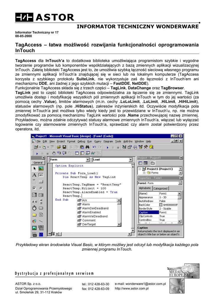 INFORMATOR TECHNICZNY WONDERWARE Informator Techniczny nr 17 08-05-2000 TagAccess – łatwa moŜliwość rozwijania funkcjonalności oprogramowania InTouch TagAccess dla InTouch’a to dodatkowa biblioteka umoŜliwiająca programistom szybkie i wygodne tworzenie programów lub komponentów współdziałających z bazą zmiennych aplikacji wizualizacyjnej InTouch. Zaletą biblioteki TagAccess jest to, Ŝe umoŜliwia szybką łączność sieciową własnego programu ze zmiennymi aplikacji InTouch’a znajdującej się w sieci lub na lokalnym komputerze (TagAccess korzysta z szybkiego protokołu SuiteLink, nie wykorzystuje zaś do łączności z InTouch’em ani mechanizmu DDE, ani Ŝadnej z jego szybkich mutacji – FastDDE, NetDDE). Funkcjonalnie TagAccess składa się z trzech części – TagLink, DataChange oraz TagBrowser. TagLink jest to część biblioteki TagAccess odpowiedzialna za łączenie się ze zmiennymi. TagLink umoŜliwia dostęp i modyfikację wszystkich pól zmiennych aplikacji InTouch w tym do jej wartości (za pomocą cechy .Value), limitów alarmowych (m.in. cechy .LoLoLimit, .LoLimit, .HiLimit, .HiHiLimit), statusów alarmowych (np. pole .HiStatus), zakresów inŜynierskich itd. Oczywiście modyfikacja pola zmiennej InTouch’a jest moŜliwa tylko wtedy kiedy jest to przewidziane w InTouch’u, np. nie moŜna zmodyfikować za pomocą mechanizmu TagLink wartości pola .Name przechowującej nazwę zmiennej. Przykładowo, moŜna zdalnie odczytywać statusy alarmowe zmiennych InTouch’a, włączać lub wyłączać logowanie czy alarmowanie zmiennych InTouch’a, sprawdzać czy alarm został potwierdzony przez operatora, itd. Przykładowy ekran środowiska Visual Basic, w którym moŜliwy jest odczyt lub modyfikacja kaŜdego pola zmiennej programu InTouch. ASTOR Sp. z o.o. Dział Oprogramowania Przemysłowego ul. Smoleńsk 29, 31-112 Kraków tel.: 012 428-63-30 fax: 012 428-63-09 e-mail: [email protected] http://www.astor.com.pl DataChange jest to części biblioteki TagAccess odpowiedzialna za automatyczne informowanie zewnętrznego programu o zmianie wartości zmiennej aplikacji InTouch, zmianie statusu alarmowego lub o potwierdzeniu alarmu przez operatora. Kontrolka DataChange jest przydatna do tworzenia programów reagujących na zdarzenia (event-based programming), a nie cyklicznie odczytujących stany zmiennych (polling-based programming). RóŜnica pomiędzy TagLink a DataChange polega na tym, Ŝe twórca aplikacji zewnętrznej nie musi cyklicznie sprawdzać czy nastąpiła zmiana zmiennej albo alarm tej zmiennej. Zewnętrzna aplikacja jest automatycznie informowana o zmianie wtedy kiedy ona nastąpi. DataChange moŜe monitorować do 100 zmiennych InTouch’a i automatycznie generuje zdarzenia programowe ValueChanged (generowane w przypadku zmiany wartości zmiennej), AlarmStatusChanged (generowane w przypadku zmiany statusu alarmowego zmiennej) lub AckStatusChanged (generowane w przypadku potwierdzenia alarmu). Sposób obsługi tych zdarzeń zaleŜy juŜ od programisty. Tekst przykładowego programu w języku VisualBasic, który będzie się automatycznie wykonywał w przypadku kaŜdej zmiany wartości zmiennych aplikacji InTouch o nazwach ReactLevel i ReactTemp i będzie podawał aktualne wartości tych zmiennych. Trzecią częścią biblioteki TagAccess jest kontrolka ActiveX o nazwie TagBrowser. Jest to przeglądarka zmiennych aplikacji InTouch. UmoŜliwia ona wskazywanie zmiennych przez uŜytkownika zewnętrznej aplikacji bądź teŜ samej aplikacji InTouch, np. w ramach aplikacji uruchomieniowej InTouch operator wskazuje zmienne, dla których w danym momencie naleŜy wyłączyć alarmowanie lub logowanie (np. wskutek awarii czujnika pomiarowego). Kontrolka przydatna jest równieŜ do wyświetlania zmiennych InTouch’a spełniających określony warunek (np. zmienne znajdujące się w określonej grupie alarmowej lub kanale komunikacyjnym AccessName, zawierające w nazwie określony ciąg znaków, zmienne które są logowane albo dla których są logowane zdarzenia itd.). Biblioteka TagAccess moŜe być wykorzystywana do tworzenia rozszerzeń do InTouch’a na dwa róŜne sposoby: • moŜe słuŜyć do tworzenia samodzielnych aplikacji, które integrują się z InTouch’em, takich jak własne programy do logowania danych, ładowania nastaw, analiz statystycznych czy numerycznych, aplikacje oprogramowania InTrack, itd. • moŜe słuŜyć do tworzenia własnych kontrolek lub serwerów ActiveX, które mogą być uŜywane w ramach InTouch’a. Kontrolki te mogą korzystać z całej szybkości i elastyczności Visual Basic’a 2 (lub innych języków zgodnych z ActiveX) i mogą np. realizować skomplikowane animacje, wykresy czy teŜ własne obiekty graficzne, które będą związane z wartościami zmiennych InTouch’a. MoŜna w ten sposób wykonać moduły integrujące InTouch’a i inne komponenty FactorySuite z programami do obliczeń inŜynierskich, modułami finansowymi itd. Kontrolka ActiveX TagBrowser umieszczona w ramach InTouch’a lub programu w Visual Basic przedstawiająca spis zmiennych aplikacji InTouch znajdującej na zdalnym komputerze (uŜytkownik po wybraniu zmiennej moŜe się dowiedzieć jaka jest jej wartość, status alarmowy, zakres wartości itd.). TagAccess wykorzystuje standard ActiveX, w związku z tym moŜe pomagać w tworzeniu oprogramowania pisanego za pomocą języków środowisk Visual Basic, Delphi czy C++, jak równieŜ moŜe być wykorzystywany w tworzeniu aplikacji Microsoft Office 97 i 2000, czy teŜ dowolnego środowiska uŜywającego Visual Basic for Applications (VBA). Stwarza to duŜe moŜliwości elastycznego dostosowania wyglądu i funkcjonalności aplikacji do wymagań klienta, a dla firm wdroŜeniowych daje okazję polepszania jakości oferowanych aplikacji. I na koniec istotna informacja – wszyscy klienci firmy Wonderware, którzy przedłuŜyli Kompleksowy Serwis Techniczny Wonderware na rok 2000 (patrz artyku