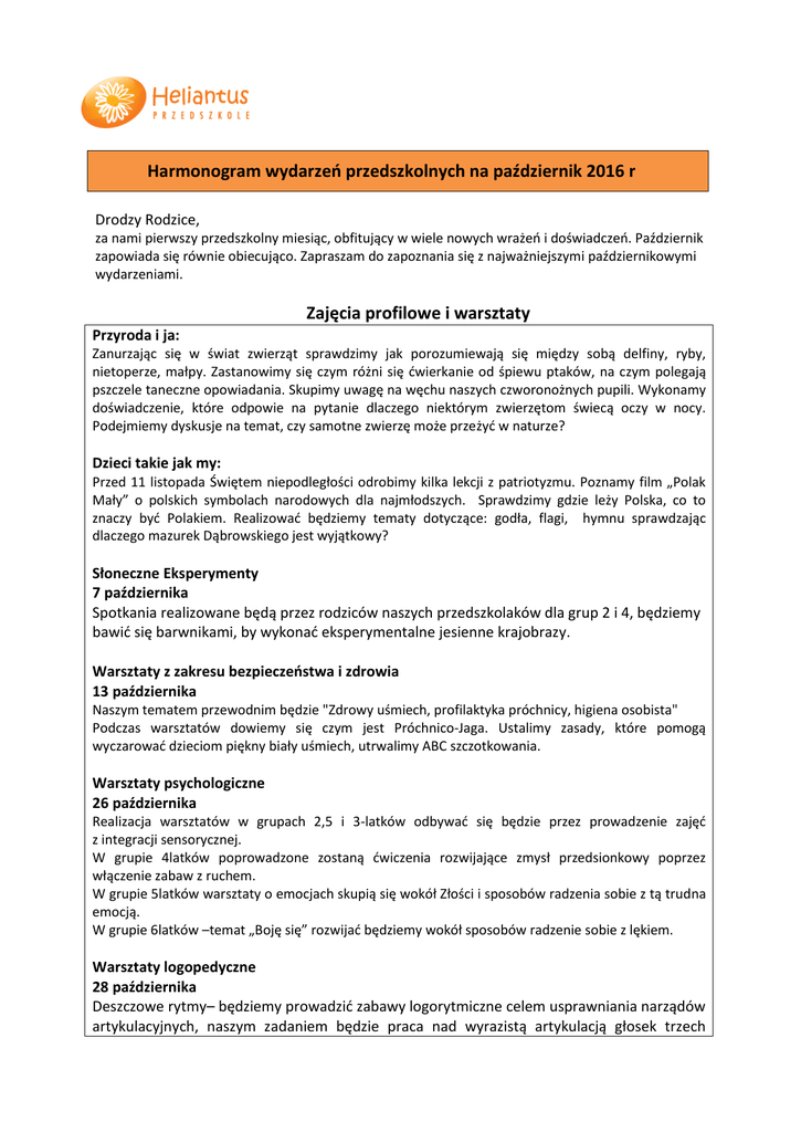Harmonogram wydarzeń przedszkolnych na październik 2016 r Drodzy Rodzice, za nami pierwszy przedszkolny miesiąc, obfitujący w wiele nowych wrażeń i doświadczeń. Październik zapowiada się równie obiecująco. Zapraszam do zapoznania się z najważniejszymi październikowymi wydarzeniami. Zajęcia profilowe i warsztaty Przyroda i ja: Zanurzając się w świat zwierząt sprawdzimy jak porozumiewają się między sobą delfiny, ryby, nietoperze, małpy. Zastanowimy się czym różni się ćwierkanie od śpiewu ptaków, na czym polegają pszczele taneczne opowiadania. Skupimy uwagę na węchu naszych czworonożnych pupili. Wykonamy doświadczenie, które odpowie na pytanie dlaczego niektórym zwierzętom świecą oczy w nocy. Podejmiemy dyskusje na temat, czy samotne zwierzę może przeżyć w naturze? Dzieci takie jak my: Przed 11 listopada Świętem niepodległości odrobimy kilka lekcji z patriotyzmu. Poznamy film „Polak Mały” o polskich symbolach narodowych dla najmłodszych. Sprawdzimy gdzie leży Polska, co to znaczy być Polakiem. Realizować będziemy tematy dotyczące: godła, flagi, hymnu sprawdzając dlaczego mazurek Dąbrowskiego jest wyjątkowy? Słoneczne Eksperymenty 7 października Spotkania realizowane będą przez rodziców naszych przedszkolaków dla grup 2 i 4, będziemy bawić się barwnikami, by wykonać eksperymentalne jesienne krajobrazy. Warsztaty z zakresu bezpieczeństwa i zdrowia 13 października Naszym tematem przewodnim będzie "Zdrowy uśmiech, profilaktyka próchnicy, higiena osobista" Podczas warsztatów dowiemy się czym jest Próchnico-Jaga. Ustalimy zasady, które pomogą wyczarować dzieciom piękny biały uśmiech, utrwalimy ABC szczotkowania. Warsztaty psychologiczne 26 października Realizacja warsztatów w grupach 2,5 i 3-latków odbywać się będzie przez prowadzenie zajęć z integracji sensorycznej. W grupie 4latków poprowadzone zostaną ćwiczenia rozwijające zmysł przedsionkowy poprzez włączenie zabaw z ruchem. W grupie 5latków warsztaty o emocjach skupią się wokół Złości i sposobów radzenia sobie z tą trudna emocją. W grupie 6latków –temat „Boję się” rozwijać będziemy wokół sposobów radzenie sobie z lękiem. Warsztaty logopedyczne 28 października Deszczowe rytmy– będziemy prowadzić zabawy logorytmiczne celem usprawniania narządów artykulacyjnych, naszym zadaniem będzie praca nad wyrazistą artykulacją głosek trzech szeregów oraz ćwiczeniami słuchu fonemowego (różnicowanie głosek szeregu ciszącego, syczącego i szumiącego). Kalendarium pozostałych wydarzeń przedszkolnych 6 października Światowy Dzień Uśmiechu Uśmiech ma wielką moc, działa jak lekarstwo, więc uśmiechajmy się jak najczęściej. Nasze przedszkole opanują zabawne uśmiechy. Muzyka z repertuaru dziecięcego, która będzie rozbrzmiewała we wszystkich salach, wprawi każdego w świetny nastrój. Nasze przedszkole zamieni się w krainę uśmiechu, panie nauczycielki zorganizują dzieciom zajęcia na wesoło, które zapewnią świetny humor na cały dzień. 7 października Spotkanie z jeżem pigmejskim Nasze przedszkole odwiedzi jesienny gość - pigmejski jeż Balbinka. W naturze jeże spędzają większą część dnia pod osłoną krzewów, trawy, skał, w szczelinach i kryjówkach. Są zwierzątkami terytorialnymi, przemieszczają się zwykle biegając po ziemi, jednak jeśli zajdzie potrzeba potrafią się wspinać, a nawet pływać. Balbinka jest bardzo energiczna, dowiemy się co lubi jeść i jak spędzać czas. Poznamy kilka zasad hodowli domowej jeża, być może wiedza ta otworzy niejednemu przedszkolakowi możliwość zrealizowania marzenia o posiadaniu własnego Tuptusia. Przedstawienie teatralne „Pani Jesień dary niesie” 10 października, godz. 11:00 Przedstawione zostaną przygody Świstaka i Pani Jesieni, ukazane zostaną ich codzienne czynności, porządki w gospodarstwie i przygotowania do zimy. Bohaterów spotka ulewna burza, będą mieli sposobność pożegnać ptaki odlatujące do ciepłych krajów i przygotować się do zimowego snu. Interaktywna inscenizacja oprawiona zostanie jesiennymi piosenkami i śpiewem na żywo. Pasowanie Przedszkolaków 14 października godz. 10:00 To ważny dzień dla każdego, kto rozpoczyna swoją przygodę z przedszkolem. W naszym gronie uroczyście powitamy wszystkie dzieci, które dołączyły do grup przedszkolnych. Na uroczystość zapraszamy także rodziców . Sesja zdjęciowa 18 października Zaprosimy dzieci na sesję fotograficzną celem przygotowania kalendarzy na przyszły rok. Dzieci będą fotografowane w całości, prosimy o założenie kolorowych lub pastelowych ubranek. Poprosimy o unikanie koloru białego. Kalendarze będą dostępne w drugiej połowie listopada. Światowy Dzień Mycia Rąk 17 października „Przedszkolaczek mały, duży wie, do czego mydło służy”. Realizując program warsztatów higienicznych zwracamy uwagę na przestrzeganie zasad dbania o nasze zdrowie. Przypomniane zostaną dzieciom formuły prawidłowego mycia rąk, wyjaśnione zostanie dlaczego w ogóle należy to robić. Wykonamy też prosty eksperyment wyjaśniający, dlaczego mydło zmywa brud. Dzień Ziemniaka, spotkanie „Cudaki Kartoflaki” z udziałem Rodziców 19 października godz. 16:00, grupa 1, 4 21 października godz. 16:00, grupa 2, 3, 5 Serdecznie zapraszamy Rodziców do wspólnej zabawy tworzenia zwierzątek, stworków i innych cudaków z jesiennych warzyw. W programie także konkursy, zagadki, bajanie i śpiewanie na kartoflano-ziemniaczaną nutę. Dzień Biblioteki Szkolnej 24 października Wybierzmy się do biblioteki szkolnej na spotkanie czytelnicze. Dzień Kundelka 25 października Nauczycielki zaproszą wszystkie dzieci do krainy piesków. Przedszkolaki zamienią się w małe pieski, na które będzie czekać wiele wyzwań. Nie zabraknie zabaw z chustą animacyjną oraz nauki piosenki ,,Pieski małe dwa”. Podczas tego dnia panie nauczyc