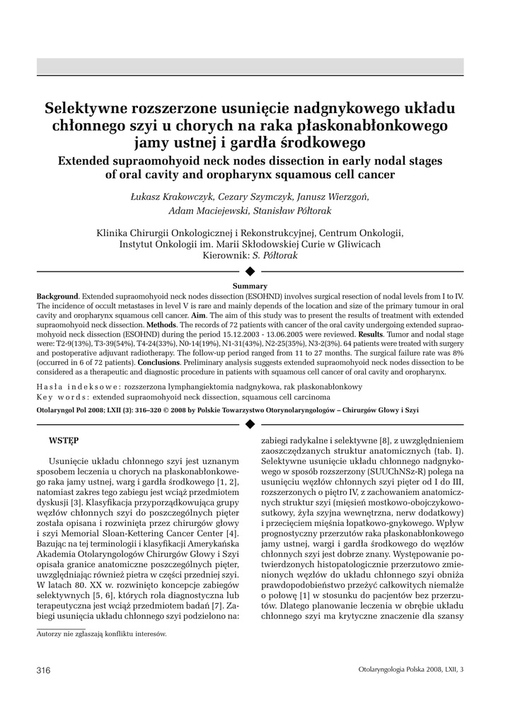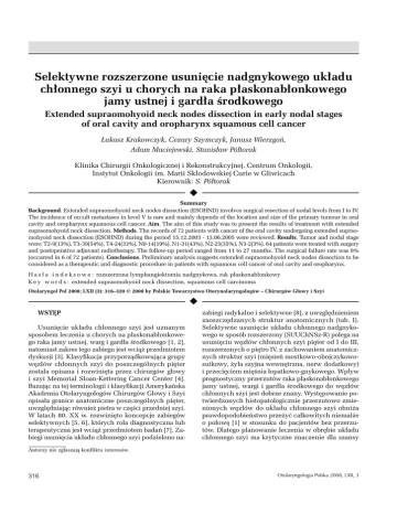 Ł. Krakowczyk i inni PRACE ORYGINALNE Selektywne rozszerzone usunięcie nadgnykowego układu chłonnego szyi u chorych na raka płaskonabłonkowego jamy ustnej i gardła środkowego Extended supraomohyoid neck nodes dissection in early nodal stages of oral cavity and oropharynx squamous cell cancer Łukasz Krakowczyk, Cezary Szymczyk, Janusz Wierzgoń, Adam Maciejewski, Stanisław Półtorak Klinika Chirurgii Onkologicznej i Rekonstrukcyjnej, Centrum Onkologii, Instytut Onkologii im. Marii Skłodowskiej Curie w Gliwicach Kierownik: S. Półtorak Summary Background. Extended supraomohyoid neck nodes dissection (ESOHND) involves surgical resection of nodal levels from I to IV. The incidence of occult metastases in level V is rare and mainly depends of the location and size of the primary tumour in oral cavity and oropharynx squamous cell cancer. Aim. The aim of this study was to present the results of treatment with extended supraomohyoid neck dissection. Methods. The records of 72 patients with cancer of the oral cavity undergoing extended supraomohyoid neck dissection (ESOHND) during the period 15.12.2003 - 13.06.2005 were reviewed. Results. Tumor and nodal stage were: T2-9(13%), T3-39(54%), T4-24(33%), N0-14(19%), N1-31(43%), N2-25(35%), N3-2(3%). 64 patients were treated with surgery and postoperative adjuvant radiotherapy. The follow-up period ranged from 11 to 27 months. The surgical failure rate was 8% (occurred in 6 of 72 patients). Conclusions. Preliminary analysis suggests extended supraomohyoid neck nodes dissection to be considered as a therapeutic and diagnostic procedure in patients with squamous cell cancer of oral cavity and oropharynx. H a s ł a i n d e k s o w e : rozszerzona lymphangiektomia nadgnykowa, rak płaskonabłonkowy K e y w o r d s : extended supraomohyoid neck dissection, squamous cell carcinoma Otolaryngol Pol 2008; LXII (3): 316–320 © 2008 by Polskie Towarzystwo Otorynolaryngologów – Chirurgów Głowy i Szyi WSTĘP Usunięcie układu chłonnego szyi jest uznanym sposobem leczenia u chorych na płaskonabłonkowego raka jamy ustnej, warg i gardła środkowego [1, 2], natomiast zakres tego zabiegu jest wciąż przedmiotem dyskusji [3]. Klasyfikacja przyporządkowująca grupy węzłów chłonnych szyi do poszczególnych pięter została opisana i rozwinięta przez chirurgów głowy i szyi Memorial Sloan-Kettering Cancer Center [4]. Bazując na tej terminologii i klasyfikacji Amerykańska Akademia Otolaryngologów Chirurgów Głowy i Szyi opisała granice anatomiczne poszczególnych pięter, uwzględniając również pietra w części przedniej szyi. W latach 80. XX w. rozwinięto koncepcje zabiegów selektywnych [5, 6], których rola diagnostyczna lub terapeutyczna jest wciąż przedmiotem badań [7]. Zabiegi usunięcia układu chłonnego szyi podzielono na: zabiegi radykalne i selektywne [8], z uwzględnieniem zaoszczędzanych struktur anatomicznych (tab. I). Selektywne usunięcie układu chłonnego nadgnykowego w sposób rozszerzony (SUUChNSz-R) polega na usunięciu węzłów chłonnych szyi pięter od I do III, rozszerzonych o piętro IV, z zachowaniem anatomicznych struktur szyi (mięsień mostkowo-obojczykowosutkowy, żyła szyjna wewnętrzna, nerw dodatkowy) i przecięciem mięśnia łopatkowo-gnykowego. Wpływ prognostyczny przerzutów raka płaskonabłonkowego jamy ustnej, wargi i gardła środkowego do węzłów chłonnych szyi jest dobrze znany. Występowanie potwierdzonych histopatologicznie przerzutowo zmienionych węzłów do układu chłonnego szyi obniża prawdopodobieństwo przeżyć całkowitych niemalże o połowę [1] w stosunku do pacjentów bez przerzutów. Dlatego planowanie leczenia w obrębie układu chłonnego szyi ma krytyczne znaczenie dla szansy Autorzy nie zgłaszają konfliktu interesów. 316 Otolaryngologia Polska 2008, LXII, 3 Selektywne rozszerzone usunięcie nadgnykowego układu chłonnego szyi Tabela I Podział zabiegów węzłowych w zależności od usuwanych pięter węzłów chłonnych szyi i zaoszczędzonych struktur anatomicznych (4) Rodzaj zabiegu usunięcia układu chłonnego szyi 1. Radykalne 2. Zmodyfikowane radykalne Typ I Typ II Typ III 3. Selektywne Nadgnykowa Nadgnykowa rozszerzona Boczna Tylno-boczna Radykalna Typ I Typ II Typ III 4. Rozszerzone Usuwanie piętra układu chłonnego szyi I-V Zaoszczędzane struktury anatomiczne - I-V I-V I-V ND ND, ŻSW ND, ŻSW, MSO I-III I-IV II-IV ND, ŻSW, MSO ND, ŻSW, MSO ND, ŻSW, MSO II-V II-V II-V II-V ND ND, ŻSW ND, ŻSW, MSO ND – Nerw dodatkowy ŻSW – Żyła szyjna wewnętrzna MSO – Mięsień mostkowoobojczykowosutkowy 43% 54% 35% 33% 13% T1 19% 0% T2 T3 T4 3% N0 N1 N2 N3 Ryc. 1. Stopień zaawansowania klinicznego ogniska pierwotnego (T) oraz stopień zaawansowania węzłowego (N) trwałego wyleczenia, a definiowanie i identyfikacja czynników rokowniczych może być istotne w leczeniu raków tego regionu [9]. CEL PRACY Celem pracy była ocena częstości nawrotów węzłowych u chorych leczonych na raka płaskonabłonkowego jamy ustnej i gardła środkowego po selektywnym usunięciu nadgnykowego układu chłonnego szyi rozszerzonego o piętro IV. MATERIAŁ I METODA Analizie klinicznej poddano 100 zabiegów selektywnego rozszerzonego usunięcia układu chłonnego Otolaryngologia Polska 2008, LXII, 3 nadgnykowego szyi (SUUChNSz-R) wykonanych u 72 kolejnych chorych na raka płaskonabłonkowego jamy ustnej i gardła środkowego leczonych chirurgicznie w Klinice Chirurgii Onkologicznej Centrum Onkologii – Instytut im. Marii Skłodowskiej-Curie w Gliwicach w okresie od 15.12.2003 do 13.06.2005. U wszystkich chorych wykonano jednoczasowo zabieg resekcyjny z rekonstrukcją ubytku pooperacyjnego płatami wolnymi lub uszypułowanymi. Minimalny okres obserwacji klinicznej wyniósł 33 miesiące. W badanej grupie 64 chorych leczono w sposób skojarzony (chirurgia z pooperacyjną radioterapią), u 8 chorych było to leczenie ratujące. Lokalizację ogniska pierwotneg