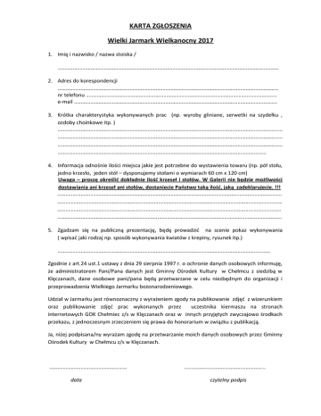 KARTA ZGŁOSZENIA Wielki Jarmark Wielkanocny 2017