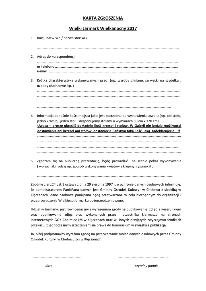 KARTA ZGŁOSZENIA Wielki Jarmark Wielkanocny 2017 1. Imię i nazwisko / nazwa stoiska / ……………………………………………………………………………………………………………………………………………… 2. Adres do korespondencji ……………………………………………………………………………………………………………………………………………… nr telefonu ………………………………………………………………………………………………………………………….. e-mail ………………………………………………………………………………………………………………………………….. 3. Krótka charakterystyka wykonywanych prac (np. wyroby gliniane, serwetki na szydełku , ozdoby choinkowe itp. ) ………………………………………………………………………………………………………………………………………………… ………………………………………………………………………………………………………………………………………………… ………………………………………………………………………………………………………………………………………………… ……………………………………………………………………………………………………………………………………… 4. Informacja odnośnie ilości miejsca jakie jest potrzebne do wystawienia towaru (np. pół stołu, jedno krzesło, jeden stół – dysponujemy stołami o wymiarach 60 cm x 120 cm) Uwaga – proszę określić dokładnie ilość krzeseł i stołów. W Galerii nie będzie możliwości dostawiania ani krzeseł ani stołów, dostaniecie Państwo taką ilość, jaką zadeklarujecie. !!! ………..………………………………………………………………………………….….……..……………………………………….. ………………………………………………………………………………………………………………………………………………… ……………………………………………………………………………………………………………………………………………….. ...……………………………………………………………..……………………………………………………………………………... 5. Zgadzam się na publiczną prezentację, będę prowadzić na scenie pokaz wykonywania ( wpisać jaki rodzaj np. sposób wykonywania kwiatów z krepiny, rysunek itp.) ………………………………………………………………………………………………………………………………………… Zgodnie z art.24 ust.1 ustawy z dnia 29 sierpnia 1997 r. o ochronie danych osobowych informuję, że administratorem Pani/Pana danych jest Gminny Ośrodek Kultury w Chełmcu z siedzibą w Klęczanach, dane osobowe pani/pana będą przetwarzane w celu niezbędnym do organizacji i przeprowadzenia Wielkiego Jarmarku bożonarodzeniowego. Udział w Jarmarku jest równoznaczny z wyrażeniem zgody na publikowanie zdjęć z wizerunkiem oraz publikowanie zdjęć prac wykonanych przez uczestnika kiermaszu na stronach internetowych GOK Chełmiec z/s w Klęczanach oraz w innych przyjętych zwyczajowo środkach przekazu, z jednoczesnym zrzeczeniem się prawa do honorarium w związku z publikacją. Ja, niżej podpisana/ny wyrażam zgodę na przetwarzanie moich danych osobowych przez Gminny Ośrodek Kultury w Chełmcu z/s w Klęczanach. ………………………………………………… data ………………………………………………….. czytelny podpis