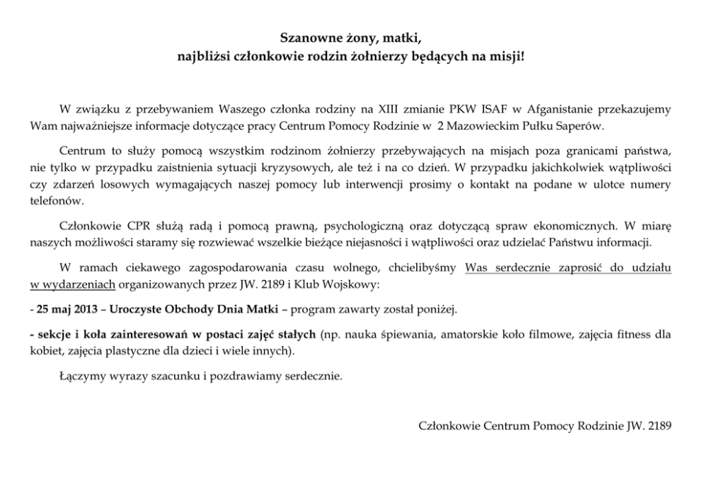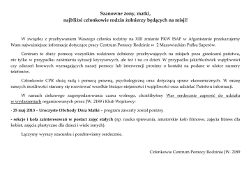 Szanowne żony, matki, najbliżsi członkowie rodzin żołnierzy będących na misji! W związku z przebywaniem Waszego członka rodziny na XIII zmianie PKW ISAF w Afganistanie przekazujemy Wam najważniejsze informacje dotyczące pracy Centrum Pomocy Rodzinie w 2 Mazowieckim Pułku Saperów. Centrum to służy pomocą wszystkim rodzinom żołnierzy przebywających na misjach poza granicami państwa, nie tylko w przypadku zaistnienia sytuacji kryzysowych, ale też i na co dzień. W przypadku jakichkolwiek wątpliwości czy zdarzeń losowych wymagających naszej pomocy lub interwencji prosimy o kontakt na podane w ulotce numery telefonów. Członkowie CPR służą radą i pomocą prawną, psychologiczną oraz dotyczącą spraw ekonomicznych. W miarę naszych możliwości staramy się rozwiewać wszelkie bieżące niejasności i wątpliwości oraz udzielać Państwu informacji. W ramach ciekawego zagospodarowania czasu wolnego, chcielibyśmy Was serdecznie zaprosić do udziału w wydarzeniach organizowanych przez JW. 2189 i Klub Wojskowy: - 25 maj 2013 – Uroczyste Obchody Dnia Matki – program zawarty został poniżej. - sekcje i koła zainteresowań w postaci zajęć stałych (np. nauka śpiewania, amatorskie koło filmowe, zajęcia fitness dla kobiet, zajęcia plastyczne dla dzieci i wiele innych). Łączymy wyrazy szacunku i pozdrawiamy serdecznie. Członkowie Centrum Pomocy Rodzinie JW. 2189 HARMONOGRAM ZAJĘĆ STAŁYCH KLUBU WOJSKOWEGO JW 2189 WAŻNY OD: 20.05.2013 r. L.p. 1 Dzień tygodnia Rodzaj zajęć Podział na grupy Godz. zajęć Instruktor Poniedziałek Sekcja Śpiewu Amatorskie Koło Filmowe Nauka gry na gitarze Grupy Wokalne Osoby Dorosłe Zaj. Indywidualne 16:00-19:00 19:00-22:00 13:00-17:00 19:00-22:00 W PRZYGOTOWANIU W PRZYGOTOWANIU D. Taraszkiewicz Zaj. Indywidualne Dzieci i Młodzież Dzieci i Młodzież Osoby Dorosłe 13:00-15:00 17:00-19:00 17:00-18:30 19:30-21:00 J. Worobiej J. Maj P. Nowakowska E. Gałecka 2 Wtorek Sekcja Śpiewu Kółko Biblioteczne Koło Bilardu Indyjskiego Taniec Towarzyski dla Dorosłych 3 Środa Zajęcia Plastyczne dla Dzieci Zajęcia Fitness dla Kobiet Dzieci i Młodzież Bez ograniczeń 15:00-20:00 18:00-19:30 Ł. Radziszewski W PRZYGOTOWANIU 4 Czwartek Sekcja Śpiewu Nauka gry na pianinie Nauka gry na gitarze Zaj. Indywidualne Zaj. Indywidualne Zaj. Indywidualne 13:00-15:00 13:00-17:00 19:00-22:00 J. Worobiej D. Taraszkiewicz D. Taraszkiewicz 5 Piątek Zajęcia Plastyczne dla Dzieci Sekcja Śpiewu Nauka gry na gitarze Dzieci i Młodzież Zaj. Indywidualne Zaj. Indywidualne 15:00-20:00 14:00-20:00 11:00-17:00 Ł. Radziszewski J. Worobiej D. Taraszkiewicz KONTAKT Z KLUBEM WOJSKOWYM 2psap TELEFON: 22 686-12-10 E-MAIL: [email protected]