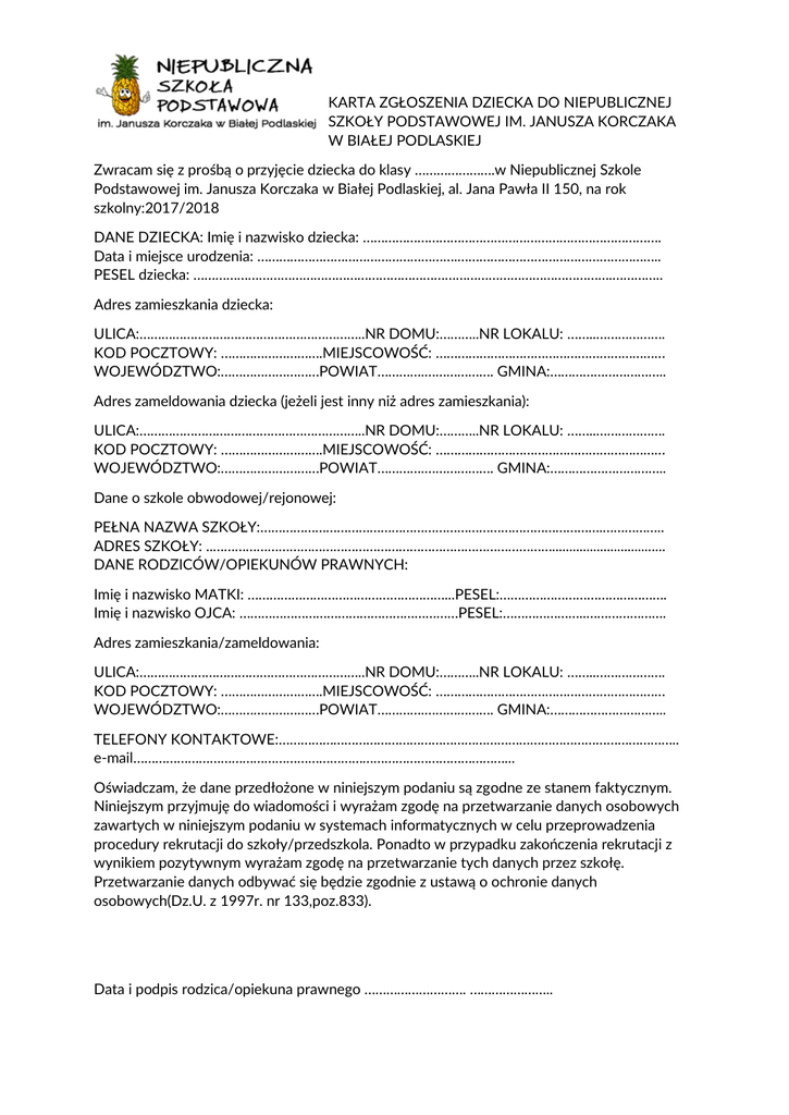 KARTA ZGŁOSZENIA DZIECKA DO NIEPUBLICZNEJ SZKOŁY PODSTAWOWEJ IM. JANUSZA KORCZAKA W BIAŁEJ PODLASKIEJ Zwracam się z prośbą o przyjęcie dziecka do klasy ………………….w Niepublicznej Szkole Podstawowej im. Janusza Korczaka w Białej Podlaskiej, al. Jana Pawła II 150, na rok szkolny:2017/2018 DANE DZIECKA: Imię i nazwisko dziecka: ………………………………………………………………………. Data i miejsce urodzenia: ……………………………………………….……………………………………………….. PESEL dziecka: …………………………………………………………………………………………………….………….. Adres zamieszkania dziecka: ULICA:……………………………………………………..NR DOMU:………..NR LOKALU: ……..………………. KOD POCZTOWY: ……………………….MIEJSCOWOŚĆ: ……………………………………………………… WOJEWÓDZTWO:………………………POWIAT………….………………. GMINA:………………………….. Adres zameldowania dziecka (jeżeli jest inny niż adres zamieszkania): ULICA:……………………………………………………..NR DOMU:………..NR LOKALU: ……..………………. KOD POCZTOWY: ……………………….MIEJSCOWOŚĆ: ……………………………………………………… WOJEWÓDZTWO:………………………POWIAT………….………………. GMINA:………………………….. Dane o szkole obwodowej/rejonowej: PEŁNA NAZWA SZKOŁY:………………………………………………………………………………….…………….. ADRES SZKOŁY: ..…………………………………………………………………………………................................. DANE RODZICÓW/OPIEKUNÓW PRAWNYCH: Imię i nazwisko MATKI: ………………………………………………...PESEL:………………………………………. Imię i nazwisko OJCA: ……………………………………………………PESEL:…………………..…………………. Adres zamieszkania/zameldowania: ULICA:……………………………………………………..NR DOMU:………..NR LOKALU: ……..………………. KOD POCZTOWY: ……………………….MIEJSCOWOŚĆ: ……………………………………………………… WOJEWÓDZTWO:………………………POWIAT………….………………. GMINA:………………………….. TELEFONY KONTAKTOWE:……………………………………………………………………………………………….. e-mail…………………………………………………………………………………………... Oświadczam, że dane przedłożone w niniejszym podaniu są zgodne ze stanem faktycznym. Niniejszym przyjmuję do wiadomości i wyrażam zgodę na przetwarzanie danych osobowych zawartych w niniejszym podaniu w systemach informatycznych w celu przeprowadzenia procedury rekrutacji do szkoły/przedszkola. Ponadto w przypadku zakończenia rekrutacji z wynikiem pozytywnym wyrażam zgodę na przetwarzanie tych danych przez szkołę. Przetwarzanie danych odbywać się będzie zgodnie z ustawą o ochronie danych osobowych(Dz.U. z 1997r. nr 133,poz.833). Data i podpis rodzica/opiekuna prawnego ………………………. …………………..