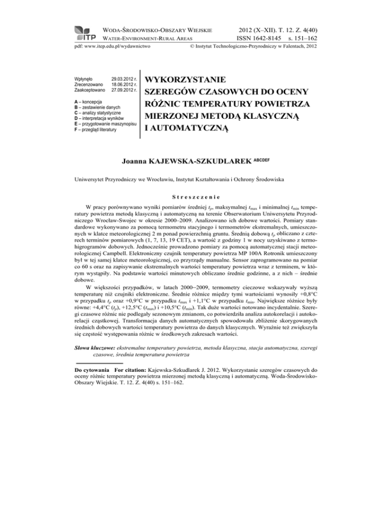 WODA-ŚRODOWISKO-OBSZARY WIEJSKIE WATER-ENVIRONMENT-RURAL AREAS pdf: www.itep.edu.pl/wydawnictwo Wpłynęło Zrecenzowano Zaakceptowano 29.03.2012 r. 18.06.2012 r. 27.09.2012 r. A – koncepcja B – zestawienie danych C – analizy statystyczne D – interpretacja wyników E – przygotowanie maszynopisu F – przegląd literatury 2012 (X–XII). T. 12. Z. 4(40) ISSN 1642-8145 s. 151–162 © Instytut Technologiczno-Przyrodniczy w Falentach, 2012 WYKORZYSTANIE SZEREGÓW CZASOWYCH DO OCENY RÓŻNIC TEMPERATURY POWIETRZA MIERZONEJ METODĄ KLASYCZNĄ I AUTOMATYCZNĄ Joanna KAJEWSKA-SZKUDLAREK ABCDEF Uniwersytet Przyrodniczy we Wrocławiu, Instytut Kształtowania i Ochrony Środowiska Streszczenie W pracy porównywano wyniki pomiarów średniej tp, maksymalnej tmax i minimalnej tmin temperatury powietrza metodą klasyczną i automatyczną na terenie Obserwatorium Uniwersytetu Przyrodniczego Wrocław-Swojec w okresie 2000–2009. Analizowano ich dobowe wartości. Pomiary standardowe wykonywano za pomocą termometru stacyjnego i termometrów ekstremalnych, umieszczonych w klatce meteorologicznej 2 m ponad powierzchnią gruntu. Średnią dobową tp obliczano z czterech terminów pomiarowych (1, 7, 13, 19 CET), a wartość z godziny 1 w nocy uzyskiwano z termohigrogramów dobowych. Jednocześnie prowadzono pomiary za pomocą automatycznej stacji meteorologicznej Campbell. Elektroniczny czujnik temperatury powietrza MP 100A Rotronik umieszczony był w tej samej klatce meteorologicznej, co przyrządy manualne. Sensor zaprogramowano na pomiar co 60 s oraz na zapisywanie ekstremalnych wartości temperatury powietrza wraz z terminem, w którym wystąpiły. Na podstawie wartości minutowych obliczano średnie godzinne, a z nich ‒ średnie dobowe. W większości przypadków, w latach 2000–2009, termometry cieczowe wskazywały wyższą temperaturę niż czujniki elektroniczne. Średnie różnice między tymi wartościami wynosiły +0,8°C w przypadku tp oraz +0,9°C w przypadku tmax i +1,1°C w przypadku tmin. Największe różnice były równe: +4,4°C (tp), +12,5°C (tmax) i +10,5°C (tmin). Tak duże wartości notowano incydentalnie. Szeregi czasowe różnic nie podlegały sezonowym zmianom, co potwierdziła analiza autokorelacji i autokorelacji cząstkowej. Transformacja danych automatycznych spowodowała zbliżenie skorygowanych średnich dobowych wartości temperatury powietrza do danych klasycznych. Wyraźnie też zwiększyła się częstość występowania różnic w środkowych zakresach wartości. Słowa kluczowe: ekstremalne temperatury powietrza, metoda klasyczna, stacja automatyczna, szeregi czasowe, średnia temperatura powietrza Do cytowania For citation: Kajewska-Szkudlarek J. 2012. Wykorzystanie szeregów czasowych do oceny różnic temperatury powietrza mierzonej metodą klasyczną i automatyczną. Woda-ŚrodowiskoObszary Wiejskie. T. 12. Z. 4(40) s. 151–162. 152 Woda-Środowisko-Obszary Wiejskie. T. 12. Z. 4(40) WSTĘP Obecnie w wielu dziedzinach życia klasyczne rozwiązania są zastępowane przez nowoczesne technologie. W meteorologii od ponad dekady rezygnuje się z pomiarów za pomocą standardowych termometrów rtęciowych, na rzecz pomiarów elektronicznymi czujnikami automatycznymi stacji meteorologicznych, których stosowanie ułatwiło zbieranie, gromadzenie i przetwarzanie danych [ŁOMOTOWSKI, ROJEK 2001; METE 2008]. Istotnym problemem, związanym z automatyzacją sieci meteorologicznej jest inna metodyka pomiarów i obliczania wartości średnich dobowych. W związku z tym powstaje wątpliwość czy całkowite zastąpienie przyrządów klasycznych automatycznymi nie spowoduje zerwania jednorodności wieloletnich serii obserwacyjnych. Jest to niezwykle istotny problem w badaniach nad klimatem i jego zmiennością [LORENC 2006; ŁOMOTOWSKI i in. 2001; PETERSON i in. 1998]. Uważa się, że zachowanie homogeniczności nie jest możliwe bez zastosowania matematycznych formuł, określających współzależność danych standardowych i automatycznych [KUŚMIEREK 2008]. Temperatura powietrza jest najczęściej porównywanym parametrem meteorologicznym mierzonym metodą manualną i czujnikami elektronicznymi. Przyczyn występowania różnic między wynikami klasycznej i automatycznej metody pomiaru temperatury autorzy upatrują w innej metodyce tych pomiarów. Metody te cechuje ponadto różna dokładność i bezwładność (mniejsza czułość termometrów cieczowych). Istnieje również większa możliwość popełnienia błędów odczytu w przypadku stacji klasycznej [KAJEWSKA, ROJEK 2009]. BACIU i in. [2005] oraz BUDZIK i MARSZAŁ [2006] twierdzą, że różnice mogą także być spowodowane odmiennymi właściwościami standardowej klatki Stevensona i osłony radiacyjnej czujnika. Dlatego uważa się, że oba rodzaje przyrządów powinno się instalować w jednej klatce meteorologicznej. Szeregi czasowe (dyskretny proces stochastyczny) to zbiór wartości cechy w następujących po sobie okresach. Ich analiza służy do konstruowania i oceny modeli, które te zmiany opisują, i umożliwia ujawnianie prawidłowości, jakim podlega badany proces. Szeregi czasowe są również wykorzystywane do tworzenia prognoz na przyszłość [ŻĄDŁO, WYWIAŁ 2008]. W niniejszej pracy szereg czasowy tworzą dobowe wartości różnic między wynikami pomiaru temperatury powietrza dwiema metodami w dziesięcioletnim okresie badań 2000–2009. Celem pracy było porównanie wartości temperatury powietrza: średniej dobowej, maksymalnej i minimalnej, otrzymanych na podstawie pomiarów z wykorzystaniem obu rodzajów stacji, analiza różnic między nimi oraz próba opracowania metody transformacji dobowych danych automatycznych i dopasowywania ich do wartości otrzymywanych sposobem klasycznym. Opracowanie metody porównywania danych z obu stacji oraz algorytmów do przeliczania wartości klasycznych na automatyczne i odwrotnie przyczyni się do rozwoju pomiarów meteorologicznych i bada