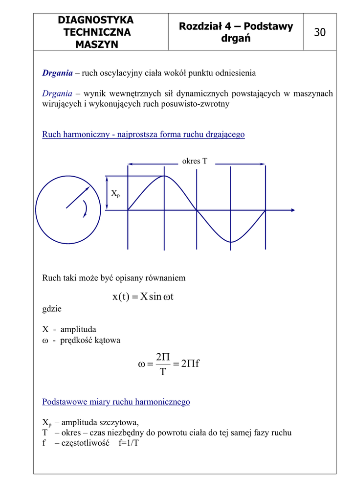 DIAGNOSTYKA TECHNICZNA MASZYN Rozdział 4 – Podstawy drgań 30 Drgania – ruch oscylacyjny ciała wokół punktu odniesienia Drgania – wynik wewnętrznych sił dynamicznych powstających w maszynach wirujących i wykonujących ruch posuwisto-zwrotny Ruch harmoniczny - najprostsza forma ruchu drgającego okres T Xp Ruch taki może być opisany równaniem x ( t ) = X sin ωt gdzie X - amplituda ω - prędkość kątowa ω= 2Π = 2Π f T Podstawowe miary ruchu harmonicznego Xp – amplituda szczytowa, T – okres – czas niezbędny do powrotu ciała do tej samej fazy ruchu f – częstotliwość f=1/T DIAGNOSTYKA TECHNICZNA MASZYN Rozdział 4 – Podstawy drgań 31 inne miary amplitudy XP-P - amplituda międzyszczytowa – różnica pomiędzy maksymalnymi dodatnimi i ujemnymi wartościami sygnału X - wartość średnia 1T X = ∫ x ( t )dt T0 ale !!! - dla ruchu harmonicznego X = 0 x(t) Xav = 0 dla przebiegów symetrycznych wygodniejszą miarą jest bezwzględna 1T X av = ∫ x ( t ) dt T0 x(t) Xav Xav – wartość DIAGNOSTYKA TECHNICZNA MASZYN XRMS Rozdział 4 – Podstawy drgań 32 - wartość średniokwadratowa (RMS) X RMS 1T 2 = ∫ x ( t )dt T0 x(t) Xav XRMS Xp Xp-p wzajemne zależności pomiędzy miarami amplitudy dla sygnału harmonicznego X p−p = 2 X p X av = 0.9 X RMS = 0.637 X p X RMS = 0.707 X p = 1.11 X av * drgania rejestrowane na rzeczywistych obiektach rzadko są czysto harmoniczne * drgania maszyn wirnikowych są kombinacją drgań harmonicznych pochodzących od różnych wymuszeń DIAGNOSTYKA TECHNICZNA MASZYN Rozdział 4 – Podstawy drgań Jaka jest najlepsza miara ruch drgającego ? PEAK RMS PEAK RMS podobne wartości szczytowe, różne wartości skuteczne (RMS) PEAK PEAK podobne wartości skuteczne (RMS, różne wartości szczytowe) 33 DIAGNOSTYKA TECHNICZNA MASZYN Rozdział 4 – Podstawy drgań 34 * Widoczna jest duża różnica w kształcie sygnału zakres stosowania pomiaru wartości szczytowej: – do oceny drgań o charakterze impulsowym (np. drgań łożysk tocznych, drgań przekładni), – do oceny drgań względnych wału zakres stosowania pomiaru wartości RMS: - podstawowa miara wykorzystywana do oceny drgań pokryw, dająca dobre oszacowanie energii sygnału v(t) t [ ] energia procesu ∝ wariancji procesu E v 2 ( t ) energia kinetyczna ∝ wariancji fluktuacji procesu RMS = root mean square value = [ ] E v2(t ) DIAGNOSTYKA TECHNICZNA MASZYN Rozdział 4 – Podstawy drgań 35 Inne miary amplitudy: współczynnik szczytu Fc = współczynnik kształtu Ff = współczynnik K Xp X RMS X RMS X av FK = X RMS ⋅ X p Zależności pomiędzy miarami amplitudy X RMS = Ff X av = Xp Fc = FK Xp Dla sygnałów harmonicznych Ff = Π 2 2 = 1.11 (1 dB) Fc = 2 = 1.41 (3 dB) Jeżeli dla maszyn rzeczywistych współczynnik szczytu przyjmuje wartość na poziomie 1.4 – 1.5 oznacza, że maszyna poddana jest sinusoidalnemu wymuszeniu o jednej, stałej częstotliwości; wartości powyżej 6 oznaczają złożoną charakterystykę wymuszenia DIAGNOSTYKA TECHNICZNA MASZYN Rozdział 4 – Podstawy drgań Parametry ruch drgającego Do opisu drgań używane są następujące parametry: - przemieszczenie X prędkość V przyśpieszenie A [µm], [mm/s], [m/s2] okres T Vp przyśpieszenie prędkość przemieszczenie przemieszczenie x ( t ) = X sin ωt prędkość v( t ) = Π dx ( t ) = ωX p cos ωt = Vp sin(ωt + ) dt 2 przyśpieszenie d 2 x(t) 2 a (t) = = − ω X p sin ωt = A p sin(ωt + Π ) 2 dt 36 DIAGNOSTYKA TECHNICZNA MASZYN Rozdział 4 – Podstawy drgań 37 Uwaga: - prędkość wyprzedza przemieszczenie o kąt równy 90o, przyśpieszenie wyprzedza prędkość o kąt 90o a przemieszczenie o kąt 180o Wektor przemieszczenia Displ.=Dsin(ωt) Wektor prędkości Vel. D ω sin(ωt +π/2) ωt+π/2 ωt CZAS FAZA ωt+π Wektor przyśpieszenia Accel.=D ω2sin(ωt+π) Zależności fazowe pomiędzy wektorami przemieszczenia, prędkości i przyśpieszenia * Kiedy kierunek obrotu zgodny jest z ruchem wskazówek zegara to faza również rośnie zgodnie z ruchem wskazówek zegara * Zrozumienie zależności pomiędzy wektorami jest bardzo ważne dla poprawnej diagnostyki zachowań maszyny Przykład: błędne założenie masy korygującej podczas wyważania może spowodować silny wzrost drgań a nawet uszkodzenie maszyny DIAGNOSTYKA TECHNICZNA MASZYN Rozdział 4 – Podstawy drgań 38 Drgania jako funkcja częstotliwości Można przeliczać amplitudę drgań pomiędzy przemieszczeniem, prędkością i przyśpieszeniem ale tylko dla stałej częstotliwości W maszynach wirujących wysoki poziom drgań może być spowodowany: - wymuszeniem dynamicznym, własnościami struktury, poprzez którą transmitowana jest energia ale * generacja drgań odbywa się tylko poprzez siły wymuszające a nigdy poprzez strukturę maszyny Wpływ struktury na poziom drgań ¾ Energia generowana poprzez wirujące elementy zanim dotrze do czujnika jest modyfikowana przez strukturę (sztywność obudowy, sztywność i dynamika łożysk). ¾ Sygnał mierzony przez czujnik to sygnał generowany przez ruchomy element pomnożony przez amplitudę funkcji odpowiedzi częstotliwościowej (transmitancję) dla określonej częstotliwości wymuszenia ¾ przejście sygnału przez strukturę wprowadza dodatkowe opóźnienie czasowe, które jest widoczne w postaci przesunięcia fazowego sygnału. MASA C (TŁUMIENIE) K (STAŁA SPRĘŻYSTOŚCI) Prosty model układu o jednym stopniu swobody DIAGNOSTYKA TECHNICZNA MASZYN Rozdział 4 – Podstawy drgań 39 Układ o jednym stopniu swobody – masa może się przemieszczać tylko w jednym kierunku Siła jako funkcja czasu może być obliczona jako: • •• f (t) = k ⋅ x(t) + c ⋅ x(t) + m ⋅ x(t) gdzie k c m - stała sprężystości - tłumienie - masa 0 SPRĘŻYNA 90 TŁUMIK MASA MASS 180 TŁUMIK MASA TŁUMIK SPRĘŻYNA MASA SPRĘŻYNA WZBUDZENIE ODPOWIEDŹ ¾ Statyczne odkształcenie jest kontrolowane tylko przez sprężynę ¾ Dla niskich częstotliwości odpowiedź (d