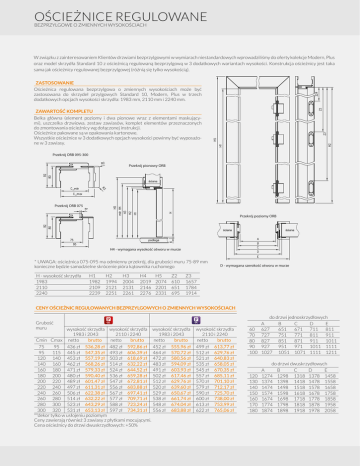 OŚCIEŻNICE REGULOWANE BEZPRZYLGOWE O ZMIENNYCH WYSOKOŚCIACH W związku z zainteresowaniem Klientów drzwiami bezprzylgowymi w wymiarach niestandardowych wprowadziliśmy do oferty kolekcje Modern, Plus oraz model skrzydła Standard 10 z ościeżnicą regulowaną bezprzylgową w 3 dodatkowych wariantach wysokości. Konstrukcja ościeżnicy jest taka sama jak ościeżnicy regulowanej bezprzylgowej (różnią się tylko wysokością). ZASTOSOWANIE Ościeżnica regulowana bezprzylgowa o zmiennych wysokościach może być zastosowana do skrzydeł przylgowych Standard 10, Modern, Plus w trzech dodatkowych opcjach wysokości skrzydła: 1983 mm, 2110 mm i 2240 mm. ZAWARTOŚĆ KOMPLETU Belka główna (element poziomy i dwa pionowe wraz z elementami maskującymi), uszczelka drzwiowa, zestaw zawiasów, komplet elementów przeznaczonych do zmontowania ościeżnicy wg dołączonej instrukcji. Ościeżnice pakowane są w opakowania kartonowe. Wszystkie ościeżnice w 3 dodatkowych opcjach wysokości powinny być wyposażone w 3 zawiasy. Przekrój ORB 095-300 Przekrój pionowy ORB Przekrój ORB 075 Przekrój poziomy ORB H4 - wymagana wysokość otworu w murze * UWAGA: ościeżnica 075-095 ma odmienny przekrój, dla grubości muru 75-89 mm konieczne będzie samodzielne skrócenie pióra kątownika ruchomego H - wysokość skrzydła 1983 2110 2240 H1 1982 2109 2239 H2 1994 2121 2251 H3 2004 2131 2261 H4 2019 2146 2276 H5 2074 2201 2331 Z2 610 651 695 D - wymagana szerokość otworu w murze Z3 1657 1784 1914 CENY OŚCIEŻNIC REGULOWANYCH BEZPRZYLGOWYCH O ZMIENNYCH WYSOKOŚCIACH Grubość muru CPL CELL wysokość skrzydła wysokość skrzydła 1983 i 2043 2110 i 2240 Cmin Cmax netto brutto netto brutto wysokość skrzydła 1983 i 2043 netto brutto 75 95 436 zł 536,28 zł 482 zł 592,86 zł 452 zł 95 115 445 zł 547,35 zł 493 zł 606,39 zł 464 zł 120 140 453 zł 557,19 zł 503 zł 618,69 zł 472 zł 140 160 462 zł 568,26 zł 514 zł 632,22 zł 483 zł 160 180 471 zł 579,33 zł 524 zł 644,52 zł 491 zł 180 200 480 zł 590,40 zł 536 zł 659,28 zł 502 zł 200 220 489 zł 601,47 zł 547 zł 672,81 zł 512 zł 220 240 497 zł 611,31 zł 556 zł 683,88 zł 520 zł 240 260 506 zł 622,38 zł 567 zł 697,41 zł 529 zł 260 280 514 zł 632,22 zł 577 zł 709,71 zł 538 zł 280 300 523 zł 643,29 zł 588 zł 723,24 zł 548 zł 300 320 531 zł 653,13 zł 597 zł 734,31 zł 556 zł **dekor tylko w usłojeniu poziomym Ceny zawierają również 3 zawiasy z płytkami mocującymi. Cena ościeżnicy do drzwi dwuskrzydłowych: +50% 555,96 zł 570,72 zł 580,56 zł 594,09 zł 603,93 zł 617,46 zł 629,76 zł 639,60 zł 650,67 zł 661,74 zł 674,04 zł 683,88 zł wysokość skrzydła 2110 i 2240 netto brutto 499 zł 512 zł 521 zł 535 zł 545 zł 557 zł 570 zł 579 zł 590 zł 600 zł 613 zł 622 zł 613,77 zł 629,76 zł 640,83 zł 658,05 zł 670,35 zł 685,11 zł 701,10 zł 712,17 zł 725,70 zł 738,00 zł 753,99 zł 765,06 zł do drzwi jednoskrzydłowych A B C D E 60 627 651 671 711 811 70 727 751 771 811 911 80 827 851 871 911 1011 90 927 951 971 1011 1111 100 1027 1051 1071 1111 1211 120 130 140 150 160 170 180 do drzwi dwuskrzydłowych A B C D E 1274 1298 1318 1378 1458 1374 1398 1418 1478 1558 1474 1498 1518 1578 1658 1574 1598 1618 1678 1758 1674 1698 1718 1778 1858 1774 1798 1818 1878 1958 1874 1898 1918 1978 2058