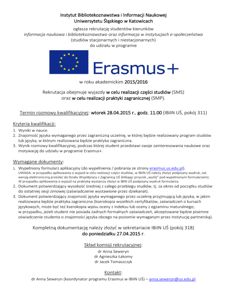 Instytut Bibliotekoznawstwa i Informacji Naukowej Uniwersytetu Śląskiego w Katowicach ogłasza rekrutację studentów kierunków informacja naukowa i bibliotekoznawstwo oraz informacja w instytucjach e-społeczeństwa (studiów stacjonarnych i niestacjonarnych) do udziału w programie w roku akademickim 2015/2016 Rekrutacja obejmuje wyjazdy w celu realizacji części studiów (SMS) oraz w celu realizacji praktyki zagranicznej (SMP). Termin rozmowy kwalifikacyjnej: wtorek 28.04.2015 r., godz. 11.00 (IBiIN UŚ, pokój 311) Kryteria kwalifikacji: 1. Wyniki w nauce. 2. Znajomość języka wymaganego przez zagraniczną uczelnię, w której będzie realizowany program studiów lub języka, w którym realizowana będzie praktyka zagraniczna. 3. Wynik rozmowy kwalifikacyjnej, podczas której student przedstawi swoje zainteresowania naukowe oraz motywację do udziału w programie Erasmus+. Wymagane dokumenty: 1. Wypełniony formularz aplikacyjny (do wypełnienia / pobrania ze strony erasmus.us.edu.pl). UWAGA: w przypadku aplikowania o wyjazd w celu realizacji części studiów, w IBiIN UŚ należy złożyć podpisany wydruk, zaś wersję elektroniczną przesłać do Działu Współpracy z Zagranicą UŚ (klikając przycisk „wyślij” pod wypełnionym formularzem). W przypadku aplikowania o wyjazd na praktykę wystarczy złożyć w IBIN UŚ podpisany wydruk formularza. 2. Dokument potwierdzający wysokość średniej z całego przebiegu studiów, tj. za okres od początku studiów do ostatniej sesji zimowej (zaświadczenie wystawione przez dziekanat). 3. Dokument potwierdzający znajomość języka wymaganego przez uczelnię przyjmującą lub języka, w jakim realizowana będzie praktyka zagraniczna (kserokopia wszelkich certyfikatów, zaświadczeń o kursach językowych, może być też kserokopia wpisu oceny z indeksu lub oceny z egzaminu maturalnego; w przypadku, jeżeli student nie posiada żadnych formalnych zaświadczeń, akceptowane będzie pisemne oświadczenie studenta o znajomości języka obcego na poziomie wymaganym przez instytucję partnerską). Kompletną dokumentację należy złożyć w sekretariacie IBiIN UŚ (pokój 318) do poniedziałku 27.04.2015 r. Skład komisji rekrutacyjnej: dr Anna Seweryn dr Agnieszka Łakomy dr Jacek Tomaszczyk Kontakt: dr Anna Seweryn (koordynator programu Erasmus w IBiIN UŚ) – [email protected] Oferta uczelni partnerskich na rok 2015/2016: uczelnia Latvijas Universitate, Sociālo zinātņu fakultāte, Informācijas un bibliotēku studiju nodaļa (http://www.lu.lv/eng/faculties/fss/structural-units/the-departmentof-information-and-library-studies-prospects-for-the-future/) Fachhochschule Köln, Institut für Informationswissenschaft (http://www.fbi.fh-koeln.de/) Hochschule für Technik, Wirtschaft und Kultur Leipzig, Fakultät Medien (http://www.htwk-leipzig.de; http://www.fbm.htwk-leipzig.de/index.php?id=fakultaet-medien) Univerza v Ljubljani, Oddelek za Bibliotekarstvo, Informacijsko Znanost in Knjigarstvo (http://wff1.ff.uni-lj.si/oddelki/biblio/en/index.html) Univerzita Komenského v Bratislave, Katedra knižničnej a informačnej vedy ** kraj (miasto) szacowana poziom liczba wymagany wysokość studiów miejsc język stypendium* Łotwa (Ryga) I, II, III Niemcy (Kolonia) I 2 Niemcy (Lipsk) I, II 2 Słowenia (Lublana) I 1 łotewski lub angielski 300€ / m-c (B1) Słowacja I, II, III (http://fphil.uniba.sk/kkiv; http://fphil.uniba.sk/en/katedry-a-odborne- (Bratysława) pracoviska/department-of-library-and-information-science) 3 niemiecki (B1) niemiecki (B1/B2) 400€ / m-c 400€ / m-c słoweński lub angielski 400€ / m-c (B2) 2 słowacki lub angielski 300€ / m-c (B2) * studenci uprawnieni do otrzymywania stypendium socjalnego otrzymają stypendium podwyższone o dodatkowe 200€ (dotyczy to wyłącznie wyjazdów w celu zrealizowania części studiów w zagranicznej uczelni partnerskiej) ** realizacja wyjazdu do Bratysłąwy będzie możliwa tylko pod warunkiem finalizacji stosownej umowy bilateralnej W ramach programu Erasmus+ studenci mogą się ubiegać o wyjazdy na studia i na praktyki w innych krajach uczestniczących w programie. Na każdym z trzech poziomów studiów (licencjackie, magisterskie, doktoranckie) można skorzystać z wyjazdu lub wyjazdów trwających łącznie do 12 miesięcy. Minimalny czas pobytu na studiach za granicą wynosi 3 miesiące, a na praktyce – 2 miesiące. Pobyt na stypendium musi zostać rozpoczęty i zakończony pomiędzy 1.06.2015 r. a 30.09.2016 r.; stypendium początkowo wypłacane jest przez okres maksymalnie 5 miesięcy i nie pokrywa wszystkich kosztów utrzymania studenta za granicą. Jeśli pozwolą na to środki finansowe, możliwe będzie przyznanie dofinansowania na kolejne miesiące pobytu. Okres pobytu na stypendium będzie ustalany z dokładnością do jednego dnia (miesiąc = 30 dni). Okres studiów zrealizowanych w ramach programu Erasmus+ w uczelni partnerskiej jest traktowany jako równoważny z okresem studiów w Uniwersytecie Śląskim; praktyka zrealizowana w ramach programu Erasmus+ jest traktowana jako równoważna z praktyką zrealizowaną w kraju. Wyjazd w ramach programu Erasmus+ nie może spowodować przedłużenia okresu studiów. W momencie wyjazdu na studia kandydat powinien być studentem Uniwersytetu Śląskiego (co najmniej drugiego roku studiów pierwszego stopnia). W momencie wyjazdu na zagraniczną praktykę lub staż kandydat powinien być studentem lub absolwentem Uniwersytetu Śląskiego. Wyjazd absolwenta uczelni może się odbyć w ciągu jednego roku od ukończenia studiów, a jego długość jest wliczana do łącznego czasu trwania mobilności na tym poziomie studiów, na którym student został zakwalifikowany na wyjazd (rekrutacja odbywa się na ostatnim roku studiów). Zagraniczna praktyka studencka w ramach programu Erasmus+ może być realizowana w dowolnie wybranej instytucji znajdującej się na terenie kraju uczestniczącego w programie Erasmus+ (z w