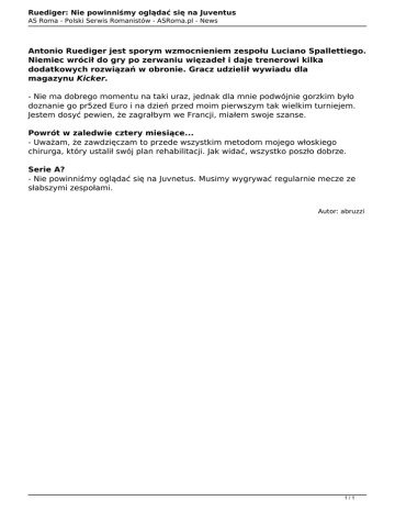 Ruediger: Nie powinniśmy oglądać się na Juventus AS Roma - Polski Serwis Romanistów - ASRoma.pl - News Antonio Ruediger jest sporym wzmocnieniem zespołu Luciano Spallettiego. Niemiec wrócił do gry po zerwaniu więzadeł i daje trenerowi kilka dodatkowych rozwiązań w obronie. Gracz udzielił wywiadu dla magazynu Kicker. - Nie ma dobrego momentu na taki uraz, jednak dla mnie podwójnie gorzkim było doznanie go pr5zed Euro i na dzień przed moim pierwszym tak wielkim turniejem. Jestem dosyć pewien, że zagrałbym we Francji, miałem swoje szanse. Powrót w zaledwie cztery miesiące... - Uważam, że zawdzięczam to przede wszystkim metodom mojego włoskiego chirurga, który ustalił swój plan rehabilitacji. Jak widać, wszystko poszło dobrze. Serie A? - Nie powinniśmy oglądać się na Juvnetus. Musimy wygrywać regularnie mecze ze słabszymi zespołami. Autor: abruzzi 1/1 Powered by TCPDF (www.tcpdf.org)