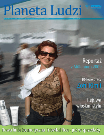Planeta Ludzi Magazyn dla ludzi z wizją w firmie Vision International People Group 3/2009 Reportaż z Millenium 2009 10-lecie pracy Zofii Kimli Rejs we włoskim stylu Nowa linia kosmetyczna Triovital Neo - już w sprzedaży STAR BONUS – SPECJALNY BONUS DLA GWIAZD VISION Weź udział w programie bonusowym, a otrzymasz swój trzynasty czek! Wysokość nagrody Star Bonus jest średnią arytmetyczną kwot widniejących na Państwa czekach w 2010 roku. Warunki udziału w programie bonusowym: 1. Należy osiągnąć kwali ikację VIP 1S lub wyższą w każdym miesiącu w okresie od stycznia 2010 do grudnia 2010 roku włącznie. 2. Należy mieć dodatni przyrost łącznego obrotu na sześciu poziomach organizacji w 2010 roku w porównaniu z łącznym obrotem na sześciu poziomach w 2009 roku. Wymagany jest przyrost na poziomie: • 25% i więcej – dla VIP 1S • 20% i więcej – dla VIP 2S • 15 % i więcej – dla VIP 3S • 10% i więcej – dla VIP 4S i wyższej. Uwaga! Nakładanie się bonusów! Jeśli okresy kwalifikacyjne nakładają się na siebie, przy wyliczaniu Star Bonus, Partner Bonus i Discovery Bonus większy bonus zawsze pochłania mniejszy. Star Bonus to Państwa czek. Jego wysokość określacie Państwo sami! Szanowni Państwo Życie to nieustanny ruch, a więc pewne zmiany są nieuchronne. Już znany grecki filozof Heraklit z Efezu twierdził: panta rehi, wszystko płynie, wszystko na świecie jest zmienne. Dotyczy to również naszej Firmy. Zmiany, o jakich mówił Prezes Dmitrij Buriak podczas ostatniego Millenium, świadczą o tym, że Firma stale się rozwija i idzie w dobrym kierunku, co dotyczy również poziomu zadowolenia dystrybutorów. Nowe technologie internetowe służą podniesieniu jakości prowadzonego przez Państwa biznesu. Nowe produkty, dzięki ciągłym udoskonaleniom, staną się jeszcze bardziej atrakcyjne. Nowe, bardziej symboliczne logo, w którym każde kółko symbolizuje zarówno człowieka, jak i wspólnotę oznacza stale powiększające się grono dystrybutorów. Trójkąt tym razem skierowany jest w prawą stronę, co można zinterpretować jako ruch do przodu, w przyszłość. O tym, że czas biegnie zbyt szybko, uświadamia nam reportaż z wydarzenia, które miało miejsce we Wrocławiu. W październiku ubiegłego roku VIP 4S Zofia Kimla razem z liderami świętowała swoje dziesięciolecie pracy w firmie Vision. Upłynęło już dziesięć lat, a ja pamiętam początki Vision w Polsce tak dobrze, jakby to było wczoraj. Aż łza się kręci w oku. Dla mnie osobiście to wielki bagaż doświadczeń i wspaniali ludzie, od których można się wiele nauczyć. W bieżącym numerze oprócz relacji z imprez możecie Państwo zapoznać się również z historiami liderów, którzy zdobyli swoje pierwsze wysokie kwalifikacje. Wszystkim należą się wielkie gratulacje. Aby przybliżyć większości z Państwa nowe technologie, publikujemy w tym numerze artykuły poświęcone dwóm systemom: GPS i GOS. Dla większości osób Internet to czarna magia, lecz jak mówi polskie przysłowie, nie taki diabeł straszny, jak go malują. Mam nadzieję, że po lekturze bieżącego numeru praca przy wykorzystaniu zasobów internetowych będzie zdecydowanie łatwiejsza. W naszej „Planecie Ludzi” nie może zabraknąć artykułów poświęconych nowym produktom. Na rynek powracają w udoskonalonej formie kosmetyki Triovital Neo, dzięki którym nasza skóra zyska zdrowy i piękny wygląd. Korzystając z okazji, pragnę złożyć Państwu życzenia z okazji nadchodzącego 2010 roku. Niech ten Nowy Rok będzie dla Państwa dobry pod każdym względem; niech spełniają się wszystkie najskrytsze marzenia. Tego wszystkiego z całego serca Państwu życzę. Katarzyna Wolska Vision Polska Sp. z o.o. Dział zamówień: ul. Czerniakowska 131/1 00-720 Warszawa Tel.: +48-22-55-88-999 Fax: +48-22-55-88-998 [email protected] Adres strony: Godziny otwarcia (zmiany od lutego): Sklep internetowy: Poniedziałek Wtorek Środa Czwartek Piątek www.visioneurope.net 9.00 – 17.00 9.00 – 17.00 9.00 – 17.00 10.00 – 18.00 8.00 – 16.00 3/2009 | Planeta Ludzi | aktualności Dział DRD: [email protected] www.vision-polska.pl Zamówienia oraz kontrakty do zarejestrowania są przyjmowane: • na miejscu w dziale sprzedaży, • faksem pod numerem +48-22-55-88-998 • Formularz zamówienia można otrzymać w biurze. Zamówienia na dany miesiąc będą przyjmowane nie później niż do godz. 12.00 przedostatniego roboczego dnia miesiąca. Firma nie ponosi odpowiedzialności za zamówienia nieczytelne oraz przesłane na zwykłych kartkach. Wpłaty za produkty należy dokonać na poniższy numer konta Vision Polska: Bank: PEKAO SA XIII O/Warszawa, Filia Nr 2, ul. Płocka 17 Nr konta: 21 1240 2034 1111 0000 0307 8187 VISION VOYAGE 2010 Kwalifikacja: – HAJNAN Okres kwali ikacyjny: wrzesień 2009 – maj 2010 Aby wziąć udział w VV2010, należy w okresie kwali ikacyjnym spełnić jeden z warunków: Grupa VIP4S i wyżej • Należy posiadać kwali ikację VIP 4S lub wyższą w każdym miesiącu od września 2009 roku do maja 2010 roku włącznie albo po raz pierwszy osiągnąć kwali ikację VIP 4S lub wyższą w okresie kwali ikacyjnym. Grupa VIP3S • Należy posiadać kwali ikację VIP 3S w każdym miesiącu od września 2009 roku do maja 2010 roku włącznie i zgromadzić nie mniej niż 7000 SV* i 8000 NGV**. Grupa VIP2S • Należy posiadać kwali ikację VIP 2S w każdym miesiącu od września 2009 roku do maja 2010 roku włącznie i zgromadzić nie mniej niż 7000 SV i 10000 NGV. Grupa VIP1S • Należy mieć kwali ikację VIP 1S w każdym miesiącu od września 2009 roku do maja 2010 roku włącznie. Wymagana jest kwali ikacja VIP 2S przynajmniej w jednym miesiącu należącym do okresu kwali ikacyjnego oraz zgromadzenie nie mniej niż 7000 SV i 17 000 NGV. Grupa VIP • Należy mieć kwali ikację VIP w każdym miesiącu od września 2009 roku do maja 2010 roku włączn