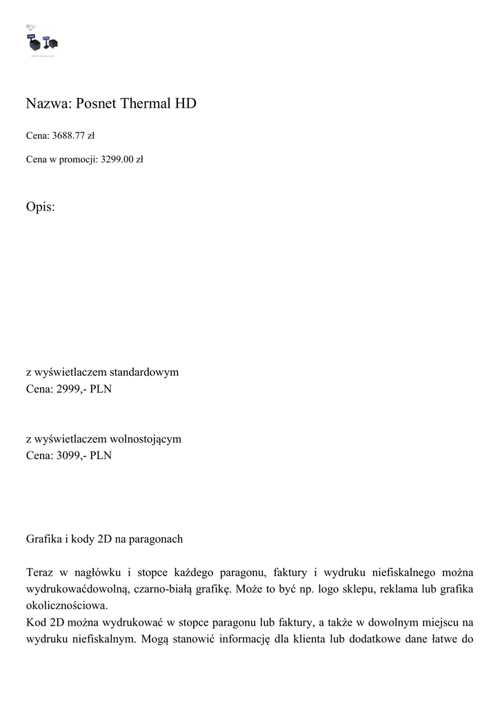 Nazwa: Posnet Thermal HD Cena: 3688.77 zł Cena w promocji: 3299.00 zł Opis: z wyświetlaczem standardowym Cena: 2999,- PLN z wyświetlaczem wolnostojącym Cena: 3099,- PLN Grafika i kody 2D na paragonach Teraz w nagłówku i stopce każdego paragonu, faktury i wydruku niefiskalnego można wydrukowaćdowolną, czarno-białą grafikę. Może to być np. logo sklepu, reklama lub grafika okolicznościowa. Kod 2D można wydrukować w stopce paragonu lub faktury, a także w dowolnym miejscu na wydruku niefiskalnym. Mogą stanowić informację dla klienta lub dodatkowe dane łatwe do wprowadzenia do systemu. Obsługiwane standardy kodów 2D: QR Code, Aztec, Data Matrix, PDF 417. Różne wersje wyświetlacza Drukarka fiskalna Posnet Thermal występuje w dwóch wersjach konstrukcyjnych, z wyświetlaczami: standardowym LCD 4x20 znaków wolnostojącym LCD 4x20 znaków. Istnieje możliwość przedłużenia ramienia wyświetlacza, aby uczynić go bardziej widocznym dla klientów. Wyjątkowy mechanizm drukujący Nowoczesny i bardzo wytrzymały mechanizm drukujący (żywotoność 150 km) z ceramicznym obcinaczem papieru w standardzie, pozwala na wydruk z prędkością do 47 linii/s, a wrzutowy system drop in zapewnia wymianę papieru w kilka sekund. Drukarka obsługuje rolkę o długości 100m oraz dwie szerokości papieru: 80 mm 57mm (po założeniu przystawki). Drukarka może pracować w trzech trybach wydruku: 56 znaków / 80mm, 40 znaków/80mm 40znaków/57mm. Drukarka wyposażona jest ponado w czujnik bliskości końca papieru. Pomarańczowa dioda informuje o zbliżającym się końcu rolki. Istnieje możliwość regulacji czujnika. Generuj dowolne wydruki niefiskalne 56 znaków w wierszu, możliwości formatowania czcionek oraz szeroki wybór formatek, w tym m.in. potwierdzenia płatności kartą, raporty, wydruki do systemów lojalnościowych, bony rabatowe, doładowania GSM, pozwalają generować dowolne wydruki niefiskalne, dopasowane do potrzeb klienta. Ethernet i porty komunikacyjne Komunikacja przez Ethernet z równoczesną obsługą kilku usług na różnych portach TCPumożliwia jednoczesną pracę z systemem sprzedażowym, odczyt kopii elektronicznej i komunikację z systemem videomonitoringu. Ponadto funkcja tunelowania portów COM umożliwa bezpośrednie podłączenie do drukarki dodatkowych urządzeń - skanera kodów kreskowych, drukarki paragonowej, dodatkowego wyświetlacza itp. Thermal HD ma również 2 porty RS232 oraz 1 port USB. Kompatybilność z większością szuflad Konfigurowane napięcie sterowania szufladą pozwala na współpracę z szufladami z różnymi interfejsami napięciowymi: 6V, 12V, 18V, oraz 24V. Dzięki temu, drukarka współpracuje z większością szuflad dostępnych na rynku również starszymi modelami. Wydruk faktur VAT Drukarki Thermal HD posiadają funkcję wydruku faktur VAT bezpośrednio na rolce kasowej. Dane techniczne Kopia elektroniczna (Informatyczny Nośnik Danych) Karta SD/SDHC Eurofiskalizacja Możliwość zaprogramowania dowolnej waluty w jakiej moduł fiskalny będzie rejestrował sprzedaż. Bazy danych baza towarowa (PLU) : 250 000 nazwa towaru: do 56 znaków stawki VAT: 7 (A...G) Mechanizm drukujący typ: jeden, termiczny typu "drop in" szybkość wydruku: do 47 linii/s ilość znaków w wierszu: dostępne 3 tryby wydruku: - 56 znaków (papier 80mm) - 40 znaków (papier 80mm) - 40 znaków (papier 57mm) szerokość papieru: 80 lub 57 mm długość rolki papieru: 100 m obcinacz: ceramiczny (w standardzie) Wyświetlacze wyświetlacz operatora: wspólny z wyświetlaczem klienta wyświetlacz klienta: Alfanumeryczny LCD 4x20 znaków w dwóch wersjach: -standardowy (zintegrowany z obudową drukarki) - wolnostojący Interfejsy / komunikacja Ethernet 1 x USB 2 x RS232 tylko nowy protokół komunikacyjny POSNET szuflada: interfejs 6V, 12V, 18V, 24V Zasilanie zasilacz zewnętrzny: 230V / 24V wbudowany akumulator: zapewniający wydruk min. 6000 linii Wymiary, waga Wymiary: 143 x 144 x 81 mm (szer. x wys. x dł.) bez wyświeltacza klienta 158 x 242 x 242 mm (szer. x wys. x dł.) z wyświeltaczem klienta Waga: ~ 2,6 kg (z papierem) Wszystkie podane ceny, są cenami netto do których należy doliczyć podatek VAT. Cennik nie stanowi oferty handlowej w rozumieniu art. 66 par.1 Kodeksu Cywilnego