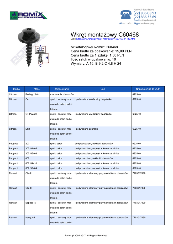 Wkręt montażowy C60468 Link: http://www.romix.pl/wkret-montazowy-c60468-p1440.html Nr katalogowy Romix: C60468 Cena brutto za opakowanie: 15,00 PLN Cena brutto za 1 sztukę: 1,50 PLN Ilość sztuk w opakowaniu: 10 Wymiary: A 16, B 9,2 C 4,8 H 24 Marka Model Zastosowanie Citroen Berlingo '08- mocowania zderzaków Citroen C4 spinki i zestawy moc Opis Nr zamiennika do OEM 6925N0 i podwoziem, wykładziny bagażnika 6925N0 i podwoziem, wykładziny bagażnika 6925N0 i podwoziem, zderzaki 6925N0 owań do osłon pod si lnikiem Citroen C4 Picasso spinki i zestawy moc owań do osłon pod si lnikiem Citroen DS4 spinki i zestawy moc owań do osłon pod si lnikiem Peugeot 207 spinki osłon pod podwoziem, nakładki zderzaków 6925N0 Peugeot 307 '01-'05 spinki osłon pod podwoziem, osprzęt w komorze silnika 6925N0 Peugeot 307 '05-'08 spinki osłon pod podwoziem, osprzęt w komorze silnika 6925N0 Peugeot 407 spinki osłon pod podwoziem, nakładki zderzaków 6925N0 Peugeot 607 '04-'10 spinki osłon pod podwoziem, osprzęt w komorze silnika 6925N0 Peugeot 607 '99-'04 spinki osłon pod podwoziem, osprzęt w komorze silnika 6925N0 Renault Clio II spinki i zestawy moc i podwoziem, elementy przy nakładkach zderzaków 7703017090 i podwoziem, elementy przy nakładkach zderzaków 7703017090 i podwoziem, elementy przy nakładkach zderzaków 7703017090 i podwoziem, elementy przy nakładkach zderzaków 7703017090 owań do osłon pod si lnikiem Renault Clio III spinki i zestawy moc owań do osłon pod si lnikiem Renault Espace IV spinki i zestawy moc owań do osłon pod si lnikiem Renault Kangoo I spinki i zestawy moc owań do osłon pod si Romix.pl 2005-2017. All Rights Reserved. lnikiem Renault Laguna II spinki i zestawy moc i podwoziem, elementy przy nakładkach zderzaków 7703017090 i podwoziem, elementy przy nakładkach zderzaków 7703017090 i podwoziem, elementy przy nakładkach zderzaków 7703017090 i podwoziem, elementy przy nakładkach zderzaków 7703017090 i podwoziem, elementy przy nakładkach zderzaków 7703017090 i podwoziem, elementy przy nakładkach zderzaków 7703017090 owań do osłon pod si lnikiem Renault Master I spinki i zestawy moc owań do osłon pod si lnikiem Renault Megane II spinki i zestawy moc owań do osłon pod si lnikiem Renault Megane Scenic spinki i zestawy moc owań do osłon pod si lnikiem Renault Modus spinki i zestawy moc owań do osłon pod si lnikiem Renault Vel Satis spinki i zestawy moc owań do osłon pod si lnikiem Romix.pl 2005-2017. All Rights Reserved.