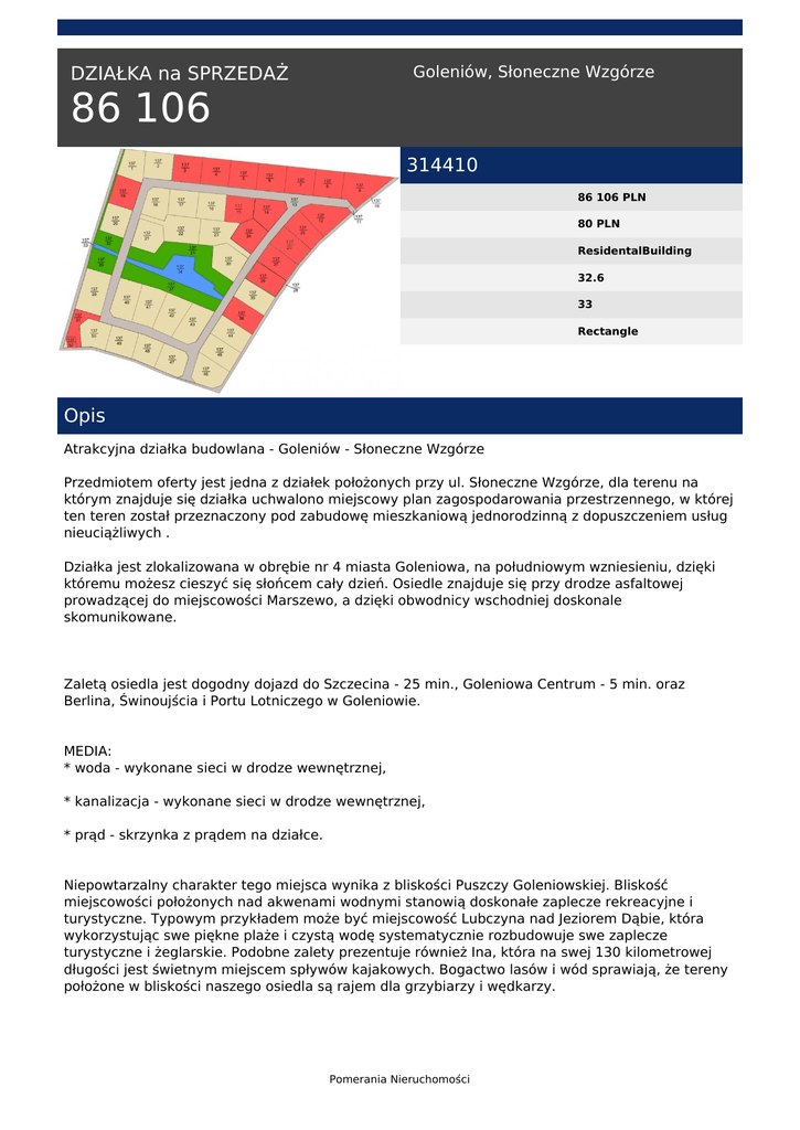 Goleniów, Słoneczne Wzgórze DZIAŁKA na SPRZEDAŻ 86 106 314410 86 106 PLN 80 PLN ResidentalBuilding 32.6 33 Rectangle Opis Atrakcyjna działka budowlana - Goleniów - Słoneczne Wzgórze Przedmiotem oferty jest jedna z działek położonych przy ul. Słoneczne Wzgórze, dla terenu na którym znajduje się działka uchwalono miejscowy plan zagospodarowania przestrzennego, w której ten teren został przeznaczony pod zabudowę mieszkaniową jednorodzinną z dopuszczeniem usług nieuciążliwych . Działka jest zlokalizowana w obrębie nr 4 miasta Goleniowa, na południowym wzniesieniu, dzięki któremu możesz cieszyć się słońcem cały dzień. Osiedle znajduje się przy drodze asfaltowej prowadzącej do miejscowości Marszewo, a dzięki obwodnicy wschodniej doskonale skomunikowane. Zaletą osiedla jest dogodny dojazd do Szczecina - 25 min., Goleniowa Centrum - 5 min. oraz Berlina, Świnoujścia i Portu Lotniczego w Goleniowie. MEDIA: * woda - wykonane sieci w drodze wewnętrznej, * kanalizacja - wykonane sieci w drodze wewnętrznej, * prąd - skrzynka z prądem na działce. Niepowtarzalny charakter tego miejsca wynika z bliskości Puszczy Goleniowskiej. Bliskość miejscowości położonych nad akwenami wodnymi stanowią doskonałe zaplecze rekreacyjne i turystyczne. Typowym przykładem może być miejscowość Lubczyna nad Jeziorem Dąbie, która wykorzystując swe piękne plaże i czystą wodę systematycznie rozbudowuje swe zaplecze turystyczne i żeglarskie. Podobne zalety prezentuje również Ina, która na swej 130 kilometrowej długości jest świetnym miejscem spływów kajakowych. Bogactwo lasów i wód sprawiają, że tereny położone w bliskości naszego osiedla są rajem dla grzybiarzy i wędkarzy. Pomerania Nieruchomości Chcesz zostać właścicielem działki budowlanej w Goleniowie, a nie masz gotówki na zapłatę całej ceny ? Właściciel umożliwia opcje skredytowania twoich marzeń ! - wystarczy wkład własny 30% ceny - raty od 814 zł/miesięcznie - do 48 miesięcy. UWAGA! NAJBARDZIEJ ATRAKCYJNA OFERTA W GOLENIOWIE!!! Zapytaj naszego maklera o BEZPŁATNE doradztwo przy uzyskaniu KREDYTU. Współpracujemy z wieloma bankami i mamy doświadczenie w przeprowadzaniu transakcji z uwzględnieniem warunków kredytowych. Dane nie stanowią oferty handlowej w rozumieniu art. 66,§ 1 Kodeksu Cywilnego. Szczegółowych informacji udziela Biuro Nieruchomości Pomerania . Pomerania Nieruchomości tel. Lewobrzeże: 914894242 | Prawobrzeże: 913508888 email: [email protected] Pomerania Nieruchomości Powered by TCPDF (www.tcpdf.org)