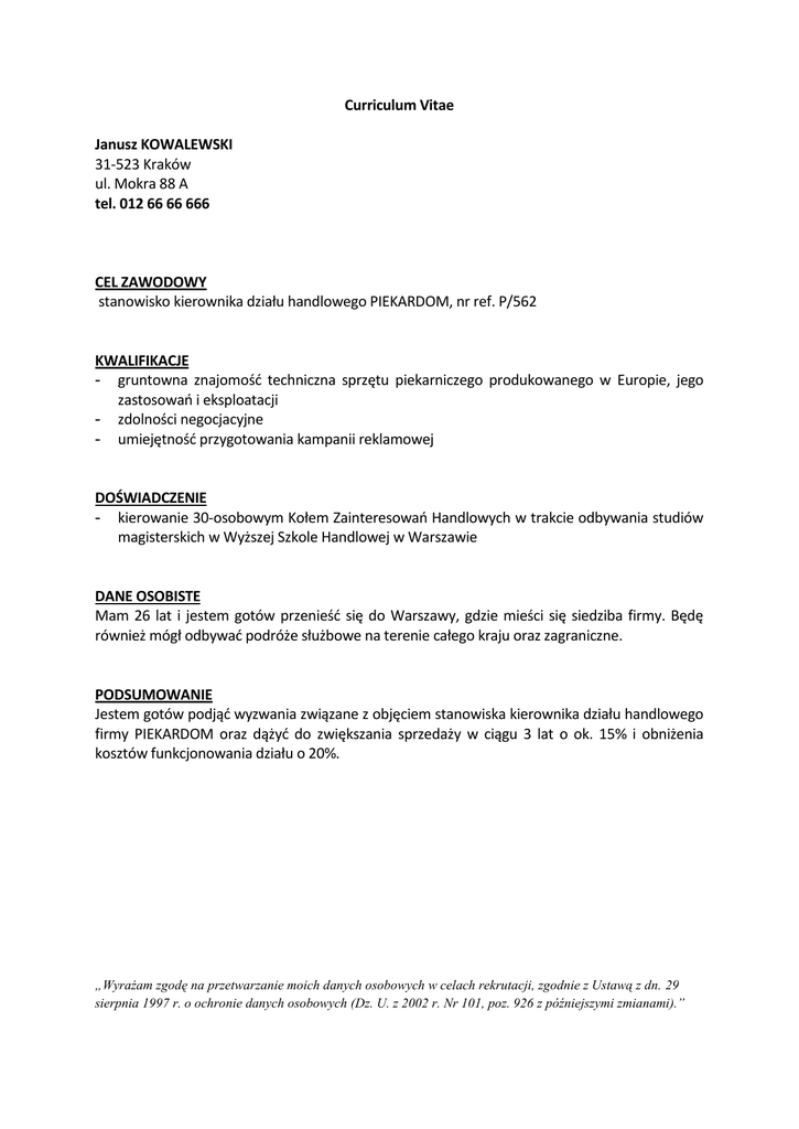 Curriculum Vitae Janusz KOWALEWSKI 31-523 Kraków ul. Mokra 88 A tel. 012 66 66 666 CEL ZAWODOWY stanowisko kierownika działu handlowego PIEKARDOM, nr ref. P/562 KWALIFIKACJE - gruntowna znajomośd techniczna sprzętu piekarniczego produkowanego w Europie, jego zastosowao i eksploatacji - zdolności negocjacyjne - umiejętnośd przygotowania kampanii reklamowej DOŚWIADCZENIE - kierowanie 30-osobowym Kołem Zainteresowao Handlowych w trakcie odbywania studiów magisterskich w Wyższej Szkole Handlowej w Warszawie DANE OSOBISTE Mam 26 lat i jestem gotów przenieśd się do Warszawy, gdzie mieści się siedziba firmy. Będę również mógł odbywad podróże służbowe na terenie całego kraju oraz zagraniczne. PODSUMOWANIE Jestem gotów podjąd wyzwania związane z objęciem stanowiska kierownika działu handlowego firmy PIEKARDOM oraz dążyd do zwiększania sprzedaży w ciągu 3 lat o ok. 15% i obniżenia kosztów funkcjonowania działu o 20%. „Wyrażam zgodę na przetwarzanie moich danych osobowych w celach rekrutacji, zgodnie z Ustawą z dn. 29 sierpnia 1997 r. o ochronie danych osobowych (Dz. U. z 2002 r. Nr 101, poz. 926 z późniejszymi zmianami).”