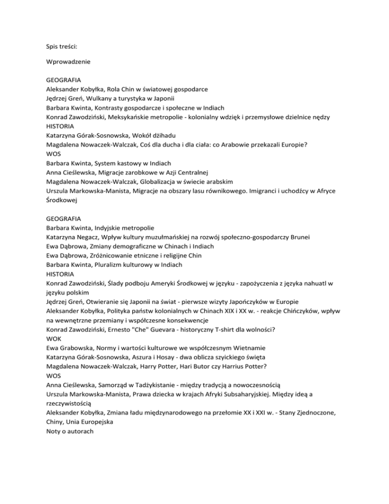 Spis treści: Wprowadzenie GEOGRAFIA Aleksander Kobyłka, Rola Chin w światowej gospodarce Jędrzej Greń, Wulkany a turystyka w Japonii Barbara Kwinta, Kontrasty gospodarcze i społeczne w Indiach Konrad Zawodziński, Meksykańskie metropolie - kolonialny wdzięk i przemysłowe dzielnice nędzy HISTORIA Katarzyna Górak-Sosnowska, Wokół dżihadu Magdalena Nowaczek-Walczak, Coś dla ducha i dla ciała: co Arabowie przekazali Europie? WOS Barbara Kwinta, System kastowy w Indiach Anna Cieślewska, Migracje zarobkowe w Azji Centralnej Magdalena Nowaczek-Walczak, Globalizacja w świecie arabskim Urszula Markowska-Manista, Migracje na obszary lasu równikowego. Imigranci i uchodźcy w Afryce Środkowej GEOGRAFIA Barbara Kwinta, Indyjskie metropolie Katarzyna Negacz, Wpływ kultury muzułmańskiej na rozwój społeczno-gospodarczy Brunei Ewa Dąbrowa, Zmiany demograficzne w Chinach i Indiach Ewa Dąbrowa, Zróżnicowanie etniczne i religijne Chin Barbara Kwinta, Pluralizm kulturowy w Indiach HISTORIA Konrad Zawodziński, Ślady podboju Ameryki Środkowej w języku - zapożyczenia z języka nahuatl w języku polskim Jędrzej Greń, Otwieranie się Japonii na świat - pierwsze wizyty Japończyków w Europie Aleksander Kobyłka, Polityka państw kolonialnych w Chinach XIX i XX w. - reakcje Chińczyków, wpływ na wewnętrzne przemiany i współczesne konsekwencje Konrad Zawodziński, Ernesto "Che" Guevara - historyczny T-shirt dla wolności? WOK Ewa Grabowska, Normy i wartości kulturowe we współczesnym Wietnamie Katarzyna Górak-Sosnowska, Aszura i Hosay - dwa oblicza szyickiego święta Magdalena Nowaczek-Walczak, Harry Potter, Hari Butor czy Harrius Potter? WOS Anna Cieślewska, Samorząd w Tadżykistanie - między tradycją a nowoczesnością Urszula Markowska-Manista, Prawa dziecka w krajach Afryki Subsaharyjskiej. Między ideą a rzeczywistością Aleksander Kobyłka, Zmiana ładu międzynarodowego na przełomie XX i XXI w. - Stany Zjednoczone, Chiny, Unia Europejska Noty o autorach