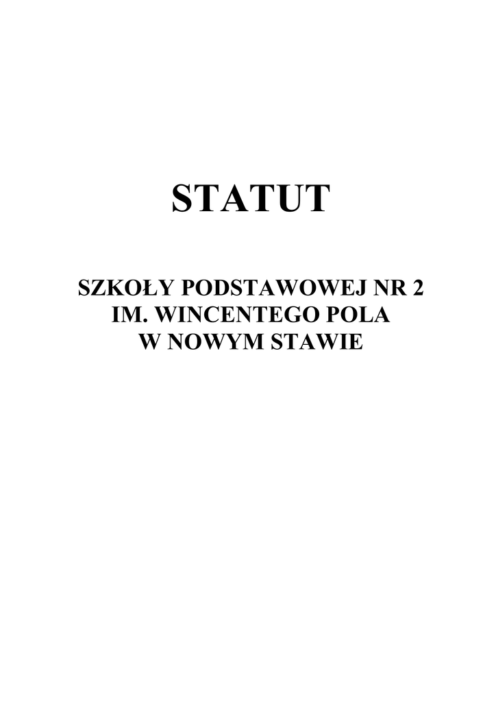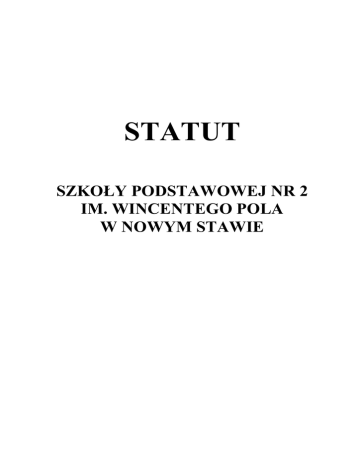 STATUT SZKOŁY PODSTAWOWEJ NR 2 IM. WINCENTEGO POLA W NOWYM STAWIE Szkoła Podstawowa Nr 2 im. Wincentego Pola w Nowym Stawie WYKAZ TREŚCI STATUTU SZKOŁY 1. 2. 3. 4. 5. 6. 7. Postanowienia ogólne Cele i zadania szkoły Organy szkoły Współpraca z rodzicami (opiekunami prawnymi) Organizacja szkoły Nauczyciele i inni pracownicy szkoły Realizacja obowiązku szkolnego przez uczniów i wychowanków oddziałów przedszkolnych 8. Zasady rekrutacji do oddziałów przedszkolnych w Szkole Podstawowej Nr 2 w Nowym Stawie 9. Zasady rekrutacji do klas pierwszych w Szkole Podstawowej Nr 2 w Nowym Stawie 10. Procedura odwoławcza dotycząca rekrutacji do oddziałów przedszkolnych i klas pierwszych 11. Uczniowie szkoły oraz wychowankowie oddziałów przedszkolnych 12. Kary i nagrody 13. Zasady oceniania wewnątrzszkolnego 14. Zasady udzielania i organizacji pomocy psychologiczno-pedagogicznej 15. Organizacja i formy współdziałania z poradnią psychologiczno-pedagogiczną 16. Postanowienia końcowe 2 Szkoła Podstawowa Nr 2 im. Wincentego Pola w Nowym Stawie Postanowienia ogólne §1 l. Pełna nazwa szkoły brzmi: Zespół Szkolno-Przedszkolny Szkoła Podstawowa Nr 2 im. Wincentego Pola w Nowym Stawie. 1.1. Nazwa szkoły jest używana w pełnym brzmieniu. 2. Adres szkoły: ul. Gdańska 53, 82 - 230 Nowy Staw ul. Bankowa 2, 82-230 Nowy Staw. §2 1. Szkoła używa pieczęci o brzmieniu: 1.1. Zespół Szkolno-Przedszkolny 82-230 NOWY STAW ul. Bankowa 2 tel./fax 55271-51-44 REGON 221942857 NIP 579-225-19-20 1.2. Zespół Szkolno-Przedszkolny Szkoła Podstawowa Nr 2 im. Wincentego Pola 82-230 Nowy Staw, ul. Gdańska 53 tel./fax 55 271-56-40 NIP 579-16-17-856 1.3. Zespół Szkolno-Przedszkolny Szkoła Podstawowa Nr 2 im. Wincentego Pola 82-230 Nowy Staw, ul. Bankowa 2 tel./fax 55 271-51-44 REGON 000677731 NIP 579-225-19-20 §3 1. Szkoła jest jednostką budżetową. 2. Organem prowadzącym Zespół Szkolno-Przedszkolny jest Gmina Nowy Staw, zgodnie z Uchwałą nr 277/XXXVIII/2013 Rady Miejskiej w Nowym Stawie z dnia 23 kwietnia 2013 r. 3 Szkoła Podstawowa Nr 2 im. Wincentego Pola w Nowym Stawie 3. Zadania organu prowadzącego wykonuje Burmistrz Nowego Stawu. 4. Organem sprawującym nadzór pedagogiczny jest Kuratorium Oświaty w Gdańsku. Cele i zadania szkoły §4 1. Czas trwania cyklu kształcenia ogólnego w szkole wynosi 6 lat. Kształcenie to dzieli się na dwa etapy edukacyjne: a. I etap edukacyjny, obejmujący klasy I-III – edukacja wczesnoszkolna; b. II etap edukacyjny, obejmujący klasy IV-VI szkoły 1.1. Szkoła prowadzi oddziały przedszkolne dla sześciolatków, realizujące program wychowania przedszkolnego. 2. Cykl kształcenia w szkole kończy się Ogólnopolskim Sprawdzianem Szóstoklasisty. 3. Celem kształcenia ogólnego w szkole podstawowej jest: a. przyswojenie przez uczniów podstawowego zasobu wiadomości na temat faktów, zasad, teorii i praktyki, dotyczących przede wszystkim tematów i zjawisk bliskich doświadczeniom uczniów; b. zdobycie przez uczniów umiejętności wykorzystywania posiadanych wiadomości podczas wykonywania zadań i rozwiązywania problemów; c. kształtowanie u uczniów postaw warunkujących sprawne i odpowiedzialne funkcjonowanie we współczesnym świecie. §5 1. Szkoła realizuje zadania wynikające z Ustawy oraz uwzględniające Program Wychowawczy Szkoły i Program Profilaktyki. 2. Kształcenie i wychowanie ma na celu: a. wpajanie miłości do Ojczyzny, poszanowania Konstytucji Rzeczypospolitej Polskiej, godła i symboli narodowych, poznawanie przeszłości i teraźniejszości kraju, budzenie szacunku dla postępowych tradycji narodu polskiego i jego kultury, literatury i języka przy jednoczesnym otwarciu się na wartości kultur Europy i świata; b. przygotowanie uczniów do współuczestnictwa w życiu kraju, kształtowanie odpowiedzialności za jego losy i pomyślną przyszłość, pobudzenie do myślenia w kategoriach nierozerwalności interesów państwa i narodu, poszanowanie prawa i konieczności umacniania państwa jako organizatora życia narodu; c. wychowanie dla pokoju; 4 Szkoła Podstawowa Nr 2 im. Wincentego Pola w Nowym Stawie d. kształtowanie umiejętności stosowania zasad współżycia społecznego, zaangażowania, tolerancji, życzliwości i rzetelności w kontaktach z ludźmi, wrażliwość na sprawy innych; e. przygotowanie do życia w społeczeństwie, rodzinie, szkole i środowisku, nabywanie umiejętności spełniania powinności wzorowego ucznia, dobrego kolegi, odpowiedniego członka rodziny, pracownika, wzorowego obywatela, f. wychowanie przez pracę, ukazywanie jej wartości, kształtowanie szacunku do pracy i ludzi ją wykonujących; g. przygotowanie do aktywnego i twórczego uczestnictwa w kulturze, upowszechnianie dorobku kultury narodowej i światowej, kształtowanie wrażliwości na piękno, wzbogacanie doznań i potrzeb estetycznych, dbałość o czystość i piękno języka ojczystego oraz rozwijanie własnych uzdolnień artystycznych; h. włączanie uczniów do działań służących ochronie przyrody, uświadamianie roli i zadań człowieka w kształtowaniu środowiska; i. rozwijanie kultury i sprawności fizycznej, odporności i wytrzymałości uczniów, kształtowanie nawyków uprawiania sportu, turystyki i innych form aktywnego wypoczynku. 3. Zadania dydaktyczno-wychowawcze: a. szkoła spełnia funkcje: kształcącą, wychowawczą, kompensacyjną i kulturotwórczą, tworząc warunki do wszechstronnego, tj. intelektualnego, emocjonalnego, moralno - społecznego, estetycznego, politechnicznego i fizycznego rozwoju uczniów; b. szkoła wyposaża w wiedzę: • o człowieku i społeczeństwie, • o problemach społeczno - ekonomicznych współczesnego świata i kraju, • o kulturze, środowisku przyrodniczym i jego ochronie, • o nauce, technice i pracy dającej podstawę do naukowej interpretacji faktów oraz tworzenia zintegrowanego obrazu rzeczywistości. c. szkoła wyrabia umiejętność rozumnego wyk