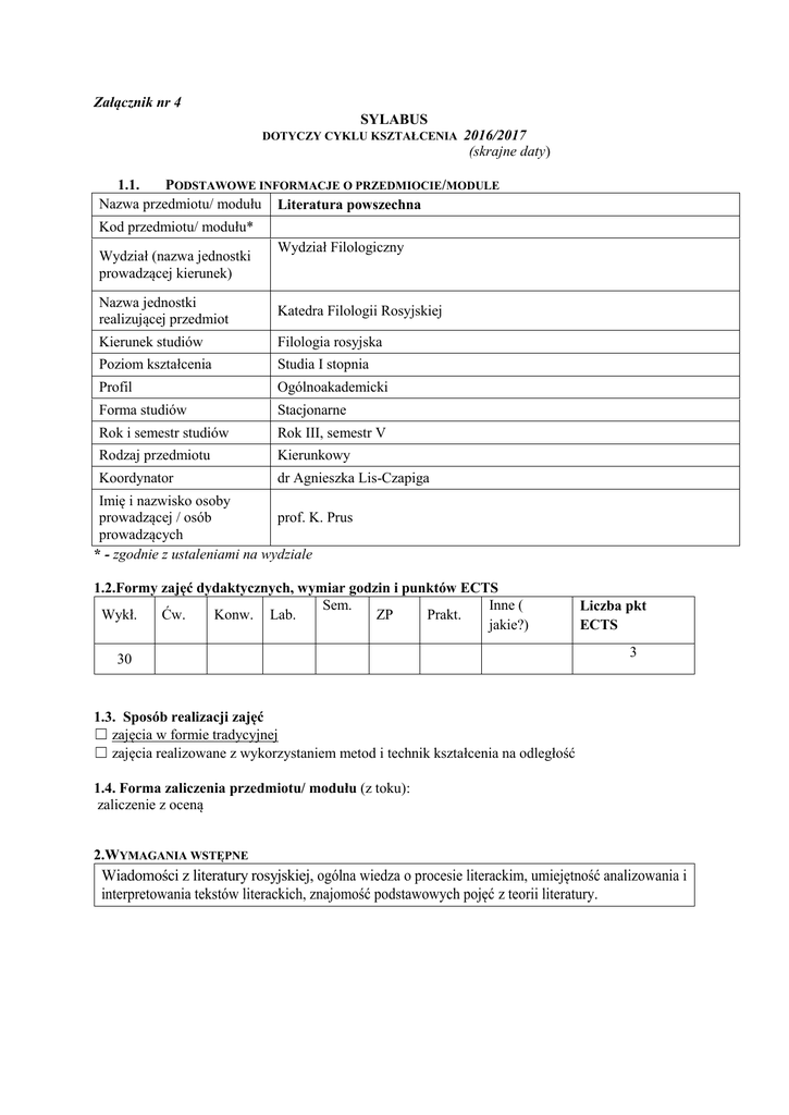Załącznik nr 4 SYLABUS DOTYCZY CYKLU KSZTAŁCENIA 2016/2017 (skrajne daty) 1.1. PODSTAWOWE INFORMACJE O PRZEDMIOCIE/MODULE Nazwa przedmiotu/ modułu Literatura powszechna Kod przedmiotu/ modułu* Wydział (nazwa jednostki prowadzącej kierunek) Wydział Filologiczny Nazwa jednostki realizującej przedmiot Katedra Filologii Rosyjskiej Kierunek studiów Filologia rosyjska Poziom kształcenia Studia I stopnia Profil Ogólnoakademicki Forma studiów Stacjonarne Rok i semestr studiów Rok III, semestr V Rodzaj przedmiotu Kierunkowy Koordynator dr Agnieszka Lis-Czapiga Imię i nazwisko osoby prof. K. Prus prowadzącej / osób prowadzących * - zgodnie z ustaleniami na wydziale 1.2.Formy zajęć dydaktycznych, wymiar godzin i punktów ECTS Sem. Inne ( Wykł. Ćw. Konw. Lab. ZP Prakt. jakie?) 30 Liczba pkt ECTS 3 1.3. Sposób realizacji zajęć ☐ zajęcia w formie tradycyjnej ☐ zajęcia realizowane z wykorzystaniem metod i technik kształcenia na odległość 1.4. Forma zaliczenia przedmiotu/ modułu (z toku): zaliczenie z oceną 2.WYMAGANIA WSTĘPNE Wiadomości z literatury rosyjskiej, ogólna wiedza o procesie literackim, umiejętność analizowania i interpretowania tekstów literackich, znajomość podstawowych pojęć z teorii literatury. 3. CELE, EFEKTY KSZTAŁCENIA , TREŚCI PROGRAMOWE I STOSOWANE METODY DYDAKTYCZNE 3.1. C1 Cele przedmiotu/modułu Zapoznanie studentów z wybranymi zjawiskami literatury powszechnej na przykładzie literatury angielskiej i amerykańskiej. C2 Zapoznanie z twórczością wybitnych przedstawicieli literatury angielskiej i amerykańskiej. C3 Pogłębienie umiejętności samodzielnej analizy utworów literackich, rozpoznawanie ukrytych sensów dzieł literackich. C4 Ukazywanie związków i zależności literatury powszechnej z rosyjską. 3.2 EFEKTY KSZTAŁCENIA DLA PRZEDMIOTU/ MODUŁU EK ( efekt kształcenia) EK_01 EK_02 EK_03 Treść efektu kształcenia zdefiniowanego dla przedmiotu (modułu) Odniesienie do efektów kierunkowych (KEK) K_W01, K_W 02, Wiedza: - student ma uporządkowaną wiedzę z zakresu wybranych K_W03, K_W04, zagadnień z literatury powszechnej K_W_05, K_W06, - student nazywa wybitnych przedstawicieli literatury K_W 07, K_08, powszechnej poszczególnych okresów i ich utwory K_W13, K_W14, - student ma podstawową wiedzę na temat interpretacji K_W 15, K_W 17 tekstów literackich i rozumie podstawowe metody ich interpretacji, - student wyjaśnia problematykę i ocenia utwory - rozpoznaje miejsce dzieł w procesie literackim. Umiejętności: - student klasyfikuje utwory literatury powszechnej w obrębie procesu historycznoliterackiego (prądy literackie, itp.) - student ocenia zjawiska, stosuje narzędzia literaturoznawcze, rozpoznaje problemy teoretyczne i związane z zawartością tekstów, przedstawia w formie ustnej i pisemnej problematykę utworów - posiada podstawową umiejętność posługiwania się pojęciami badawczymi z zakresu literaturoznawstwa - potrafi krytycznie czytać akademickie teksty literaturoznawcze - potrafi wyszukiwać, analizować i użytkować informacje z zakresu literatury powszechnej, wykorzystując różne źródła - umie samodzielnie zdobywać wiedzę. Kompetencja społeczna: - student jest zorientowany na pogłębianie wiedzy zdobytej na zajęciach z literatury powszechnej - student dyskutuje - student zachowuje otwartość na opinie i poglądy innych - student ma świadomość znaczenia literatury angielskiej i amerykańskiej w kulturze europejskiej i światowej. K_U01, K_U02, K_U03, K_U04, K_U07, K_U08, K_U09, K_U11, K_U12, K_U13, K_U14, K_U15, K_U16, K_U19, K_U20, K_U21 K_K01, K_K02, K_K03, K_K04, K_K06, K_K09 3.3 TREŚCI PROGRAMOWE A. Problematyka wykładu Lp. Treści programowe 1. 2. 3.4 L. godz. Periodyzacja literatury, ogólna charakterystyka kultury preceltyckiej, celtyckiej i 15 rzymskiej, literatura staroangielska (449-1154), literatura średnioangielska (11541500), Chaucer, literatura renesansowa (Szekspir i teatr), literatura nowoangielska (Milton), klasycyzm i oświecenie (Defoe, Swift), preromantyzm (Young, Macpherson, Richardson i Gray) i romantyzm (Coleridge, Wordsworth, Scott, Byron, Shelley, Keats), początki realizmu w twórczości Dickensa, Thackereya, modyfikacje realizmu (James, Collins), przełom wieku (Wilde, Show, Eliot, Galsworthy), powieść XX wieku (Auden, Wells, Conrad, Joyce, Wolf, Lawrence, Christie, Forsyth, Snow, Powell, Beckett, Amis, Murdoch, Wilson, Lessing, Golding, Spark, Orwell, Peterkiewicz, Osborne i in. Ważniejsi twórcy literatury amerykańskiej. Początki piśmiennictwa (Franklin, Irving, 15 Cooper, Melville). Romantyzm – Poe, Hawthorne; transcendentalizm: Emerson, Whitman, Dickinson,) złoty wiek – Stowe, Hart, London, Twain, James; twórcy XX w. (Dreiser, Lewis, Fitzgerald, Dos Passos, Pound, Steinbek, Hemingway, Faulkner, Capote); rozwój dramatu amerykańskiego (O, Neill, Miller). METODY DYDAKTYCZNE Wykład problemowy. 4 METODY I KRYTERIA OCENY 4.1 Sposoby weryfikacji efektów kształcenia Symbol efektu EK_ 01 EK_ 02 EK_03 Metody oceny efektów kształcenia ( np.: kolokwium, egzamin ustny, egzamin pisemny, projekt, sprawozdanie, obserwacja w trakcie zajęć) Obserwacja w trakcie zajęć. Kolokwium. Obserwacja w trakcie zajęć. Kolokwium. Obserwacja w trakcie zajęć. Forma zajęć dydaktycznych ( w, ćw., …) wykład wykład wykład 4.2 Warunki zaliczenia przedmiotu (kryteria oceniania) Ocena aktywności studenta na zajęciach, zaliczenie wybranych lektur, kolokwium. 5. Całkowity nakład pracy studenta potrzebny do osiągnięcia założonych efektów w godzinach oraz punktach ECTS Aktywność Liczba godzin/ nakład pracy studenta godziny zajęć wg planu z nauczycielem wykład – 30 przygotowanie do zajęć 10 przygotowanie do kolokwium 10 udział w konsultacjach 5 Inne (jakie?) samodzielna lektura 35 SUMA GODZIN 90 SUMARYCZNA LICZBA PUNKTÓW ECTS 3 6. PRAKTYKI ZAWODOWE W RAMACH PRZEDMIOTU/ MODUŁU wymiar godzinowy zasady i formy odbywania praktyk 