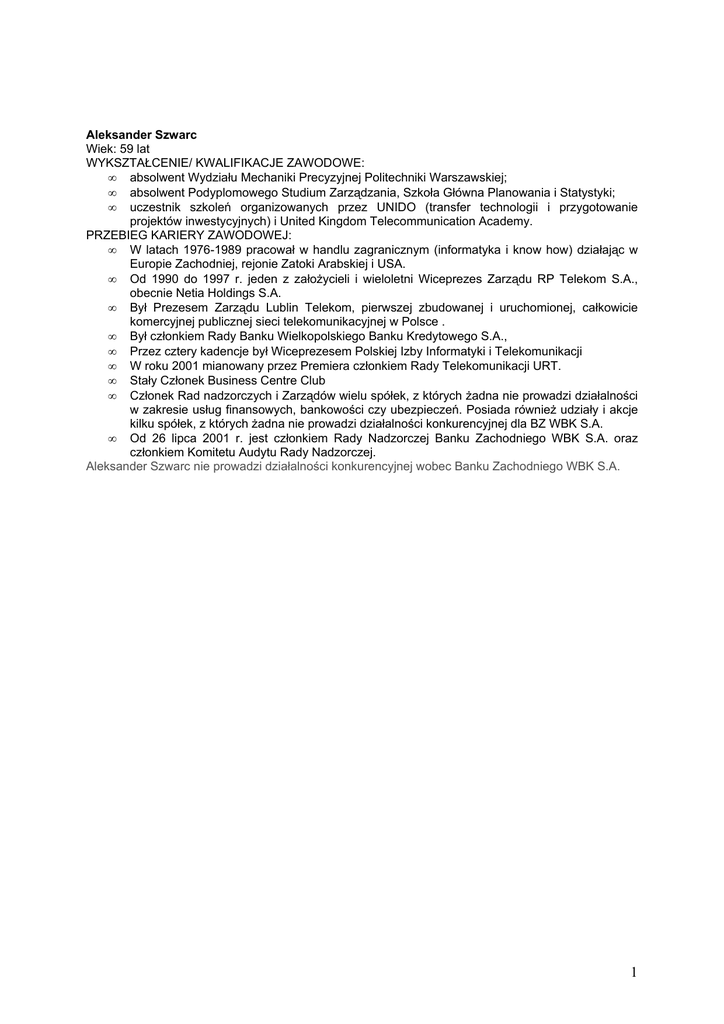 Aleksander Szwarc Wiek: 59 lat WYKSZTAŁCENIE/ KWALIFIKACJE ZAWODOWE: • absolwent Wydziału Mechaniki Precyzyjnej Politechniki Warszawskiej; • absolwent Podyplomowego Studium Zarządzania, Szkoła Główna Planowania i Statystyki; • uczestnik szkoleń organizowanych przez UNIDO (transfer technologii i przygotowanie projektów inwestycyjnych) i United Kingdom Telecommunication Academy. PRZEBIEG KARIERY ZAWODOWEJ: • W latach 1976-1989 pracował w handlu zagranicznym (informatyka i know how) działając w Europie Zachodniej, rejonie Zatoki Arabskiej i USA. • Od 1990 do 1997 r. jeden z założycieli i wieloletni Wiceprezes Zarządu RP Telekom S.A., obecnie Netia Holdings S.A. • Był Prezesem Zarządu Lublin Telekom, pierwszej zbudowanej i uruchomionej, całkowicie komercyjnej publicznej sieci telekomunikacyjnej w Polsce . • Był członkiem Rady Banku Wielkopolskiego Banku Kredytowego S.A., • Przez cztery kadencje był Wiceprezesem Polskiej Izby Informatyki i Telekomunikacji • W roku 2001 mianowany przez Premiera członkiem Rady Telekomunikacji URT. • Stały Członek Business Centre Club • Członek Rad nadzorczych i Zarządów wielu spółek, z których żadna nie prowadzi działalności w zakresie usług finansowych, bankowości czy ubezpieczeń. Posiada również udziały i akcje kilku spółek, z których żadna nie prowadzi działalności konkurencyjnej dla BZ WBK S.A. • Od 26 lipca 2001 r. jest członkiem Rady Nadzorczej Banku Zachodniego WBK S.A. oraz członkiem Komitetu Audytu Rady Nadzorczej. Aleksander Szwarc nie prowadzi działalności konkurencyjnej wobec Banku Zachodniego WBK S.A. 1