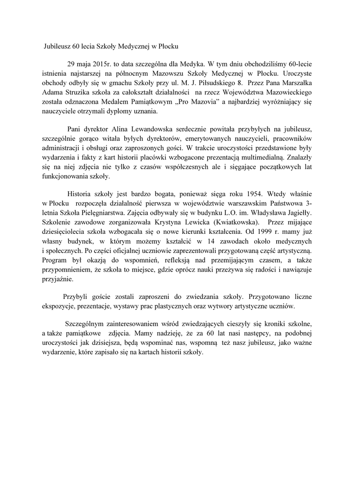 Jubileusz 60 lecia Szkoły Medycznej w Płocku 29 maja 2015r. to data szczególna dla Medyka. W tym dniu obchodziliśmy 60-lecie istnienia najstarszej na północnym Mazowszu Szkoły Medycznej w Płocku. Uroczyste obchody odbyły się w gmachu Szkoły przy ul. M. J. Piłsudskiego 8. Przez Pana Marszałka Adama Struzika szkoła za całokształt działalności na rzecz Województwa Mazowieckiego została odznaczona Medalem Pamiątkowym „Pro Mazovia” a najbardziej wyróżniający się nauczyciele otrzymali dyplomy uznania. Pani dyrektor Alina Lewandowska serdecznie powitała przybyłych na jubileusz, szczególnie gorąco witała byłych dyrektorów, emerytowanych nauczycieli, pracowników administracji i obsługi oraz zaproszonych gości. W trakcie uroczystości przedstawione były wydarzenia i fakty z kart historii placówki wzbogacone prezentacją multimedialną. Znalazły się na niej zdjęcia nie tylko z czasów współczesnych ale i sięgające początkowych lat funkcjonowania szkoły. Historia szkoły jest bardzo bogata, ponieważ sięga roku 1954. Wtedy właśnie w Płocku rozpoczęła działalność pierwsza w województwie warszawskim Państwowa 3letnia Szkoła Pielęgniarstwa. Zajęcia odbywały się w budynku L.O. im. Władysława Jagiełły. Szkolenie zawodowe zorganizowała Krystyna Lewicka (Kwiatkowska). Przez mijające dziesięciolecia szkoła wzbogacała się o nowe kierunki kształcenia. Od 1999 r. mamy już własny budynek, w którym możemy kształcić w 14 zawodach około medycznych i społecznych. Po części oficjalnej uczniowie zaprezentowali przygotowaną część artystyczną. Program był okazją do wspomnień, refleksją nad przemijającym czasem, a także przypomnieniem, że szkoła to miejsce, gdzie oprócz nauki przeżywa się radości i nawiązuje przyjaźnie. Przybyli goście zostali zaproszeni do zwiedzania szkoły. Przygotowano liczne ekspozycje, prezentacje, wystawy prac plastycznych oraz wytwory artystyczne uczniów. Szczególnym zainteresowaniem wśród zwiedzających cieszyły się kroniki szkolne, a także pamiątkowe zdjęcia. Mamy nadzieję, że za 60 lat nasi następcy, na podobnej uroczystości jak dzisiejsza, będą wspominać nas, wspomną też nasz jubileusz, jako ważne wydarzenie, które zapisało się na kartach historii szkoły.