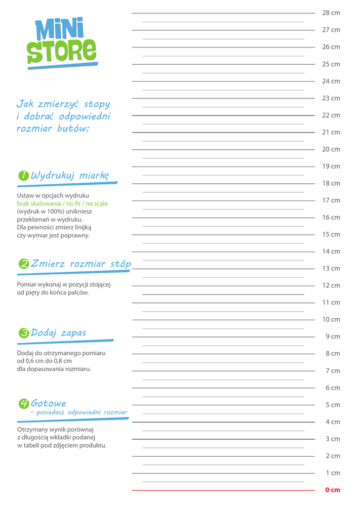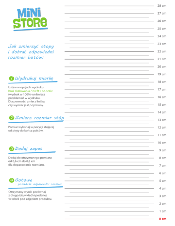 28 cm 27 cm 26 cm 25 cm 24 cm Jak zmierzyć stopy i dobrać odpowiedni rozmiar butów: 23 cm 22 cm 21 cm 20 cm 1 Wydrukuj miarkę Ustaw w opcjach wydruku brak skalowania / no fit / no scale (wydruk w 100%) unikniesz przekłamań w wydruku. Dla pewności zmierz linijką czy wymiar jest poprawny. 19 cm 18 cm 17 cm 16 cm 15 cm 14 cm 2 Zmierz rozmiar stóp Pomiar wykonaj w pozycji stojącej od pięty do końca palców. 13 cm 12 cm 11 cm 10 cm 3 Dodaj zapas Dodaj do otrzymanego pomiaru od 0,6 cm do 0,8 cm dla dopasowania rozmiaru. 9 cm 8 cm 7 cm 6 cm 4 Gotowe - posiadasz odpowiedni rozmiar Otrzymany wynik porównaj z długością wkładki podanej w tabeli pod zdjęciem produktu. 5 cm 4 cm 3 cm 2 cm 1 cm 0 cm