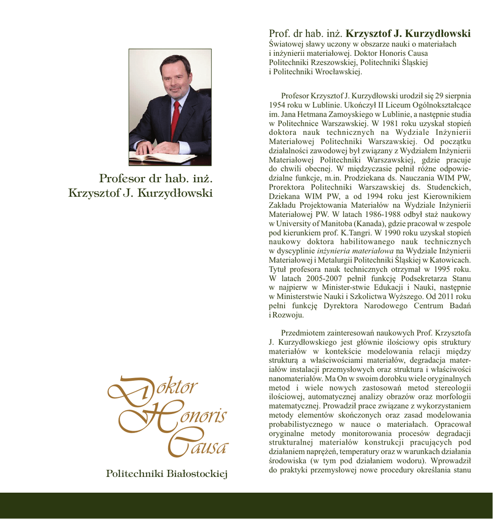 Prof. dr hab. inż. Krzysztof J. Kurzydłowski Światowej sławy uczony w obszarze nauki o materiałach i inżynierii materiałowej. Doktor Honoris Causa Politechniki Rzeszowskiej, Politechniki Śląskiej i Politechniki Wrocławskiej. Profesor dr hab. inż. Krzysztof J. Kurzydłowski D H C oktor onoris ausa Politechniki Białostockiej Profesor Krzysztof J. Kurzydłowski urodził się 29 sierpnia 1954 roku w Lublinie. Ukończył II Liceum Ogólnokształcące im. Jana Hetmana Zamoyskiego w Lublinie, a następnie studia w Politechnice Warszawskiej. W 1981 roku uzyskał stopień doktora nauk technicznych na Wydziale Inżynierii Materiałowej Politechniki Warszawskiej. Od początku działalności zawodowej był związany z Wydziałem Inżynierii Materiałowej Politechniki Warszawskiej, gdzie pracuje do chwili obecnej. W międzyczasie pełnił różne odpowiedzialne funkcje, m.in. Prodziekana ds. Nauczania WIM PW, Prorektora Politechniki Warszawskiej ds. Studenckich, Dziekana WIM PW, a od 1994 roku jest Kierownikiem Zakładu Projektowania Materiałów na Wydziale Inżynierii Materiałowej PW. W latach 1986-1988 odbył staż naukowy w University of Manitoba (Kanada), gdzie pracował w zespole pod kierunkiem prof. K.Tangri. W 1990 roku uzyskał stopień naukowy doktora habilitowanego nauk technicznych w dyscyplinie inżynieria materiałowa na Wydziale Inżynierii Materiałowej i Metalurgii Politechniki Śląskiej w Katowicach. Tytuł profesora nauk technicznych otrzymał w 1995 roku. W latach 2005-2007 pełnił funkcję Podsekretarza Stanu w najpierw w Minister-stwie Edukacji i Nauki, następnie w Ministerstwie Nauki i Szkolictwa Wyższego. Od 2011 roku pełni funkcję Dyrektora Narodowego Centrum Badań i Rozwoju. Przedmiotem zainteresowań naukowych Prof. Krzysztofa J. Kurzydłowskiego jest głównie ilościowy opis struktury materiałów w kontekście modelowania relacji między strukturą a właściwościami materiałów, degradacja materiałów instalacji przemysłowych oraz struktura i właściwości nanomateriałów. Ma On w swoim dorobku wiele oryginalnych metod i wiele nowych zastosowań metod stereologii ilościowej, automatycznej analizy obrazów oraz morfologii matematycznej. Prowadził prace związane z wykorzystaniem metody elementów skończonych oraz zasad modelowania probabilistycznego w nauce o materiałach. Opracował oryginalne metody monitorowania procesów degradacji strukturalnej materiałów konstrukcji pracujących pod działaniem naprężeń, temperatury oraz w warunkach działania środowiska (w tym pod działaniem wodoru). Wprowadził do praktyki przemysłowej nowe procedury określania stanu technicznego urządzeń przemysłowych w kontekście określenia możliwości ich bezpiecznej eksploatacji. W ostatnich latach zajmuje się wytwarzaniem, opisem struktury i właściwości oraz modelowaniem nanometali oraz kompozytów metal-ceramika. Podjął także badania w zakresie materiałów na reaktory do syntezy termojądrowej w ramach programu EUROATOM. Prof. Krzysztof J. Kurzydłowski opublikował ponad 500 recenzowanych prac naukowych. W swoim dorobku ma publikacje w czołowych periodykach o zasięgu międzynarodowym takich jak Scripta Materialia, Acta Materialia, Philosophical Magazine, Materials Science and Engineering, Materials Characterization, Intermetallics oraz Metallurgical Transactions. Jest także współautorem siedmiu monografii. O wartości tych prac świadczy liczba cytowań, która wynosi ponad 4000, co daje indeks Hirscha 31 wg bazy Web of Science. Prof. Krzysztof J. Kurzydłowski pełnił funkcję promotora w 58 zakończonych przewodach doktorskich. Bierze udział w przedsięwzięciach międzynarodowych, był współorganizatorem licznych renomowanych konferencji naukowych o zasięgu międzynarodowym, m.in.: konferencji Europejskiej Federacji Stowarzyszeń Materiałowych EUROMAT, European Materials Research Society, 24 Sympozjum Technologii Termojądrowej SOFT 2006 (Symposium on Fusion Technology). Był członkiem wielu rad naukowych, w tym: International Advisory Board of NIMS (Japan) oraz 3 rad naukowych Polskiej Akademii Nauk. Jest członkiem komitetów redakcyjnych 7 krajowych czasopism naukowych. Jest także członkiem wielu stowarzyszeń naukowych międzynarodowych i krajowych. Na podkreślenie zasługuje szeroka współpraca Prof. Krzysztofa J. Kurzydłowskiego z przemysłem. Prowadził wiele prac na zlecenie partnerów z przemysłu dotyczących oceny stopnia degradacji materiałów konstrukcji pracujących w podwyższonych temperaturach oraz pod działaniem aktywnych środowisk. Jest współautorem ponad 20 patentów. Wykonywał ekspertyzy na rzecz wielu organizacji polskich i międzynarodowych, m.in.: Polski Koncern Naftowy ORLEN S.A., ELEKTRIM, ELEKTRIM MEGADEX, PERN S.A., PZU, IZOTECHNIK, KTI (Holandia), SNAMPROGETTI (Włochy), ATB (Włochy), NUOVO PIGNIONE (Włochy), TECHNIP (Francja), CRAWFORD (Wielka Brytania), PEKOR, MANNESMANN (Niemcy), TNO (Holandia), Fundusz Ochrony Środowiska, UDHE (Niemcy), ANWIL S.A. Prof. Krzysztof J. Kurzydłowski przez szereg lat współpracował z Komitetem Badań Naukowych oraz wieloma agendami rządowymi, m.in. Radą Uzbrojenia MON, Komisją Badań na Rzecz Rozwoju Gospodarki, Komitetu Narodowego ds. Współpracy z Europejską Fundacją Nauki. Ma też istotne doświadczenia we współpracy organizacjami gospodarczymi. W latach 1992-2000 pełnił funkcję dyrektora stowarzyszenia Polskie Forum Akademicko-Gospodarcze. Prof. Krzysztof J. Kurzydłowski brał także udział w licznych programach europejskich, m.in.: Expert Committee in Materials Science and Engineering of European Science Foundation, Executive Committee FUSION FOR ENERGY, Sherpa Group for High Level Group on Key Enabling Technologies. Najwyższą godność akademicką – tytuł Doctora Honoris Causa nadały Mu już trzy uczelnie: Politechnika Rzeszowska (2009), Politechnika Śląska (2012) oraz Politechnika Wrocławska (2015).
