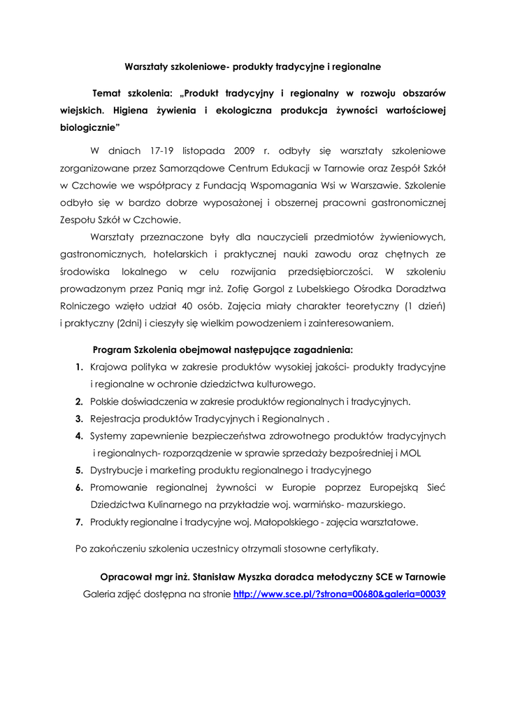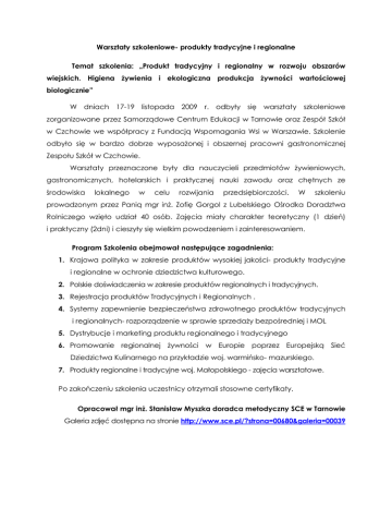Warsztaty szkoleniowe- produkty tradycyjne i regionalne Temat szkolenia: „Produkt tradycyjny i regionalny w rozwoju obszarów wiejskich. Higiena Ŝywienia i ekologiczna produkcja Ŝywności wartościowej biologicznie” W dniach 17-19 listopada 2009 r. odbyły się warsztaty szkoleniowe zorganizowane przez Samorządowe Centrum Edukacji w Tarnowie oraz Zespół Szkół w Czchowie we współpracy z Fundacją Wspomagania Wsi w Warszawie. Szkolenie odbyło się w bardzo dobrze wyposaŜonej i obszernej pracowni gastronomicznej Zespołu Szkół w Czchowie. Warsztaty przeznaczone były dla nauczycieli przedmiotów Ŝywieniowych, gastronomicznych, hotelarskich i praktycznej nauki zawodu oraz chętnych ze środowiska lokalnego w celu rozwijania przedsiębiorczości. W szkoleniu prowadzonym przez Panią mgr inŜ. Zofię Gorgol z Lubelskiego Ośrodka Doradztwa Rolniczego wzięło udział 40 osób. Zajęcia miały charakter teoretyczny (1 dzień) i praktyczny (2dni) i cieszyły się wielkim powodzeniem i zainteresowaniem. Program Szkolenia obejmował następujące zagadnienia: 1. Krajowa polityka w zakresie produktów wysokiej jakości- produkty tradycyjne i regionalne w ochronie dziedzictwa kulturowego. 2. Polskie doświadczenia w zakresie produktów regionalnych i tradycyjnych. 3. Rejestracja produktów Tradycyjnych i Regionalnych . 4. Systemy zapewnienie bezpieczeństwa zdrowotnego produktów tradycyjnych i regionalnych- rozporządzenie w sprawie sprzedaŜy bezpośredniej i MOL 5. Dystrybucje i marketing produktu regionalnego i tradycyjnego 6. Promowanie regionalnej Ŝywności w Europie poprzez Europejską Sieć Dziedzictwa Kulinarnego na przykładzie woj. warmińsko- mazurskiego. 7. Produkty regionalne i tradycyjne woj. Małopolskiego - zajęcia warsztatowe. Po zakończeniu szkolenia uczestnicy otrzymali stosowne certyfikaty. Opracował mgr inŜ. Stanisław Myszka doradca metodyczny SCE w Tarnowie Galeria zdjęć dostępna na stronie http://www.sce.pl/?strona=00680&galeria=00039