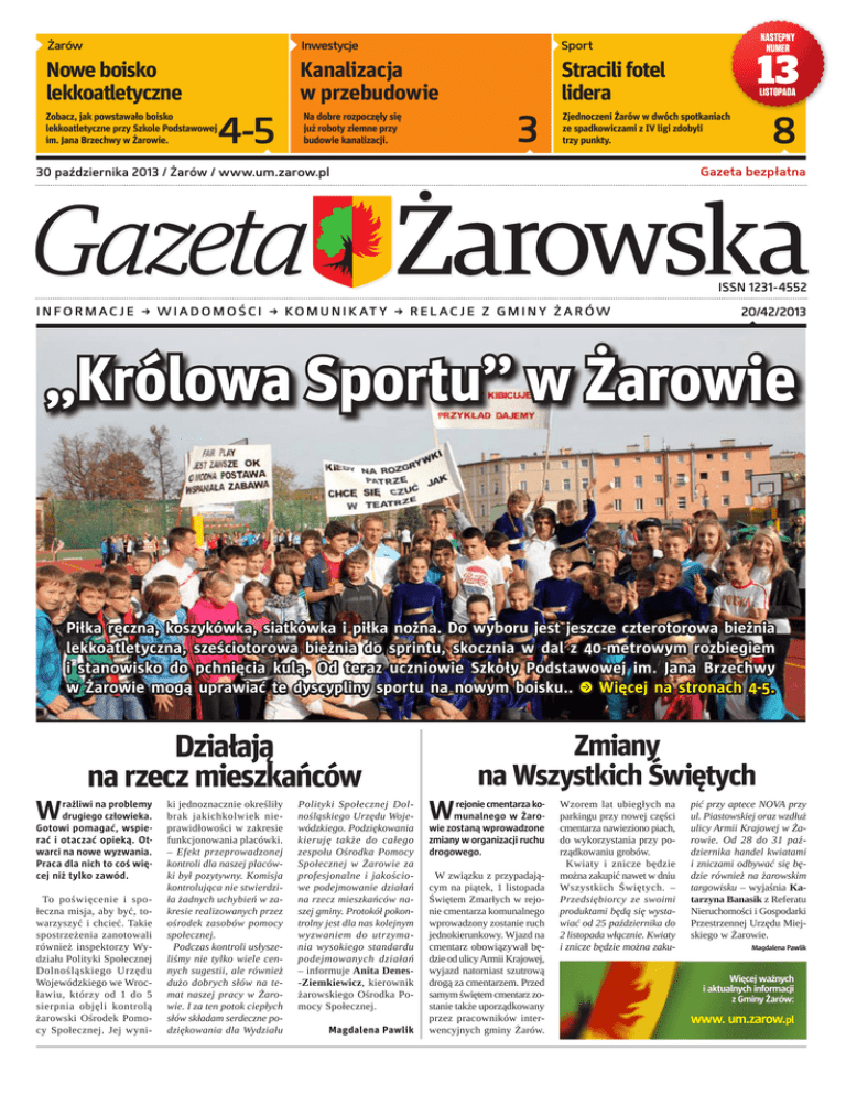 Żarów Inwestycje Sport Nowe boisko lekkoatletyczne Kanalizacja w przebudowie Stracili fotel lidera Zobacz, jak powstawało boisko lekkoatletyczne przy Szkole Podstawowej im. Jana Brzechwy w Żarowie. 4-5 3 Na dobre rozpoczęły się już roboty ziemne przy budowie kanalizacji. NASTĘPNY NUMER 13 LISTOPADA 8 Zjednoczeni Żarów w dwóch spotkaniach ze spadkowiczami z IV ligi zdobyli trzy punkty. Gazeta bezpłatna 30 października 2013 / Żarów / www.um.zarow.pl ISSN 1231-4552 I N F O R M A C J E • W I A D O M O Ś C I • K O M U N I K AT Y • R E L A C J E Z G M I N Y Ż A R Ó W 20/42/2013 „Królowa Sportu” w Żarowie Piłka ręczna, koszykówka, siatkówka i piłka nożna. Do wyboru jest jeszcze czterotorowa bieżnia lekkoatletyczna, sześciotorowa bieżnia do sprintu, skocznia w dal z 40-metrowym rozbiegiem i stanowisko do pchnięcia kulą. Od teraz uczniowie Szkoły Podstawowej im. Jana Brzechwy w Żarowie mogą uprawiać te dyscypliny sportu na nowym boisku.. r Więcej na stronach 4-5. Działają na rzecz mieszkańców W rażliwi na problemy drugiego człowieka. Gotowi pomagać, wspierać i otaczać opieką. Otwarci na nowe wyzwania. Praca dla nich to coś więcej niż tylko zawód. To poświęcenie i społeczna misja, aby być, towarzyszyć i chcieć. Takie spostrzeżenia zanotowali również inspektorzy Wydziału Polityki Społecznej Dolnośląskiego Urzędu Wojewódzkiego we Wrocławiu, którzy od 1 do 5 sierpnia objęli kontrolą żarowski Ośrodek Pomocy Społecznej. Jej wyni- ki jednoznacznie określiły brak jakichkolwiek nieprawidłowości w zakresie funkcjonowania placówki. – Efekt przeprowadzonej kontroli dla naszej placówki był pozytywny. Komisja kontrolująca nie stwierdziła żadnych uchybień w zakresie realizowanych przez ośrodek zasobów pomocy społecznej. Podczas kontroli usłyszeliśmy nie tylko wiele cennych sugestii, ale również dużo dobrych słów na temat naszej pracy w Żarowie. I za ten potok ciepłych słów składam serdeczne podziękowania dla Wydziału Polityki Społecznej Dolnośląskiego Urzędu Wojewódzkiego. Podziękowania kieruję także do całego zespołu Ośrodka Pomocy Społecznej w Żarowie za profesjonalne i jakościowe podejmowanie działań na rzecz mieszkańców naszej gminy. Protokół pokontrolny jest dla nas kolejnym wyzwaniem do utrzymania wysokiego standardu podejmowanych działań – informuje Anita Denes-Ziemkiewicz, kierownik żarowskiego Ośrodka Pomocy Społecznej. Magdalena Pawlik Zmiany na Wszystkich Świętych W rejonie cmentarza komunalnego w Żarowie zostaną wprowadzone zmiany w organizacji ruchu drogowego. W związku z przypadającym na piątek, 1 listopada Świętem Zmarłych w rejonie cmentarza komunalnego wprowadzony zostanie ruch jednokierunkowy. Wjazd na cmentarz obowiązywał będzie od ulicy Armii Krajowej, wyjazd natomiast szutrową drogą za cmentarzem. Przed samym świętem cmentarz zostanie także uporządkowany przez pracowników interwencyjnych gminy Żarów. Wzorem lat ubiegłych na parkingu przy nowej części cmentarza nawieziono piach, do wykorzystania przy porządkowaniu grobów. Kwiaty i znicze będzie można zakupić nawet w dniu Wszystkich Świętych. – Przedsiębiorcy ze swoimi produktami będą się wystawiać od 25 października do 2 listopada włącznie. Kwiaty i znicze będzie można zaku- pić przy aptece NOVA przy ul. Piastowskiej oraz wzdłuż ulicy Armii Krajowej w Żarowie. Od 28 do 31 października handel kwiatami i zniczami odbywać się będzie również na żarowskim targowisku – wyjaśnia Katarzyna Banasik z Referatu Nieruchomości i Gospodarki Przestrzennej Urzędu Miejskiego w Żarowie. Magdalena Pawlik Więcej ważnych i aktualnych informacji z Gminy Żarów: www. um.zarow.pl 2 » A k t ua l ności www.um.zarow.pl Głosuj na Żarów! Kronika Policyjna Znieważyli policjantów Jeden, 23-letni mieszkaniec Żarowa znieważył funkcjonariuszy żarowskiej policji, a drugi 22-letni kierował do nich groźby słowne. Obu grozi kara pozbawienia wolności. Pierwszemu do roku czasu, a drugi za wystosowane groźby podlegać będzie karze do dwóch lat pozbawienia wolności. Na „gazie” za kierownicą Za kierownicą samochodu czy roweru. Z promilami wsiadają do pojazdów i stwarzają niebezpieczeństwo dla innych użytkowników ruchu drogowego. – W ostatnim czasie odnotowaliśmy dużo takich przypadków. Do kontroli zatrzymywano mieszkańców w Przyłęgowie, Mrowinach, Mikoszowej i Żarowie. Wszyscy za kierownicę pojazdów wsiadali po wypiciu alkoholu. Za czyn taki obligatoryjnie grozi im zatrzymanie prawa jazdy i kara do dwóch lat pozbawienia wolności – wyjaśnia Izabela Basztura, komendant żarowskiego komisariatu policji. Wszystkiemu winna matka? Znęcała się nad nimi fizycznie i psychicznie. W końcu, jedno z nich nie wytrzymało i targnęło się na własne życie. Trójka dorosłych już dzieci mieszkanki Żarowa przeżywała prawdziwy koszmar. Za znęcanie się nad rodziną ze szczególnym okrucieństwem kobiecie grozi do 12 lat więzienia. – Sprawą obecnie zajmuje się Prokuratura Rejonowa w Świdnicy, jednak już dziś wiadomo, że kobieta została tymczasowo aresztowana i obecnie czeka na proces. Rodzina ta była pod stałym nadzorem żarowskiego Ośrodka Pomocy Społecznej, ofiary założone miały tzw. „Niebieskie karty”, które zakłada się w przypadku stosowania wobec nich przemocy fizycznej. Stale jednak odmawiały składania zeznań bądź zmieniały je, żeby chronić swoją matkę. Dopiero po próbie samobójczej, dziewczyna zdecydowała się zeznawać przeciwko niej. Na szczęście rana, która powstała na skutek ugodzenia nożem okazała się na tyle niegroźna, że nie wymagała dłuższej hospitalizacji. Na chwilę obecną wiemy, że dziewczyna wróciła już do domu i została objęta pomocą psychologa. Działania ze strony żarowskich instytucji w przypadku tej rodziny były nieustannie podejmowane. Niestety, jak to często b
