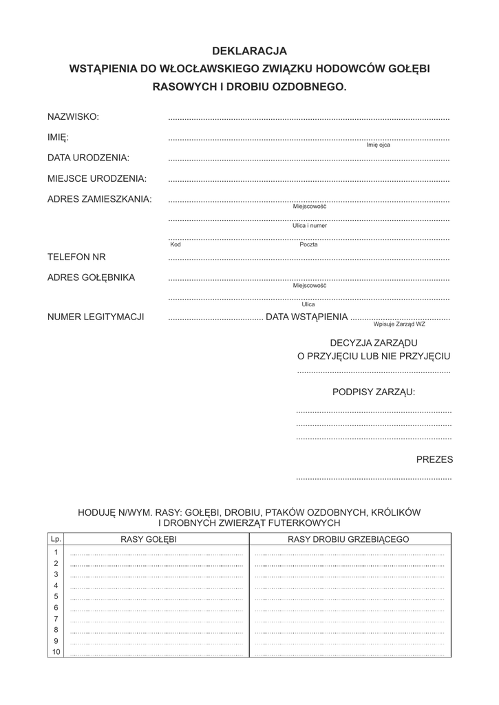 DEKLARACJA WSTĄPIENIA DO WŁOCŁAWSKlEGO ZWIĄZKU HODOWCÓW GOŁĘBI RASOWYCH I DROBIU OZDOBNEGO. NAZWISKO: ......................................................................................................................... IMIĘ: ......................................................................................................................... Imię ojca DATA URODZENIA: ......................................................................................................................... MIEJSCE URODZENIA: ......................................................................................................................... ADRES ZAMIESZKANIA: ......................................................................................................................... Miejscowość ......................................................................................................................... Ulica i numer ......................................................................................................................... Kod Poczta TELEFON NR ......................................................................................................................... ADRES GOŁĘBNIKA ......................................................................................................................... Miejscowość ......................................................................................................................... Ulica NUMER LEGITYMACJI ......................................... DATA WSTĄPIENIA ........................................... Wpisuje Zarząd WZ DECYZJA ZARZĄDU O PRZYJĘCIU LUB NIE PRZYJĘCIU .................................................................. PODPISY ZARZĄU: ................................................................... ................................................................... ................................................................... PREZES ................................................................... HODUJĘ N/WYM. RASY: GOŁĘBI, DROBIU, PTAKÓW OZDOBNYCH, KRÓLIKÓW I DROBNYCH ZWIERZĄT FUTERKOWYCH Lp. 1 2 3 4 5 6 7 8 9 10 RASY GOŁĘBI RASY DROBIU GRZEBIĄCEGO Lp. RASY PTAKÓW OZDOBNYCH RASY DROBIU WODNEGO RASY KRÓLIKÓW RASY DROBNYCH ZWIERZĄT FUTERKOWYCH 1 2 3 4 5 6 7 8 9 10 Lp. 1 2 3 4 5 6 7 8 9 10 PRAWA I OBOWIĄZKI CZŁONKA 1. CZŁONKOWIE ZWIĄZKU MAJĄ PRAWO: a) wybierać i być wybierani do władz Związku, b) uczestniczyć w zebraniach Związku, c) korzystać z porad i pomocy w sprawach związanych z hodowlą gołębi rasowych i drobiu ozdobnego, Członkowie zwyczajni i wspierający, działają w Związku poprzez swoich przedstawicieli. 2. CZŁONKOWJE ZWIĄZKU MAJĄ OBOWIĄZEK: a) hodować gołębie rasowe i drób ozdobny oraz brać udział w wystawach organizowanych przez Związek, b) brać czynny udział w pracach Związku, c) przestrzegać postanowień statutu, regulaminu i uchwał Związku, d) regularnie opłacać świadczenia członkowskie, e) dbać o dobre imię Związku. 3. CZŁONKOSTWO W ZWIĄZKU WYGASA W PRZYPADKU: a) dobrowolnego wystąpienia złożonego na piśmie Zarządowi, b) skreślenia przez Zarząd z powodu nie opłacania składki członkowskiej z góry za dany rok do końca I kwartału (tj. do 31 marca) roku następnego, c) rozwiązania stowarzyszenia lub oddziału, d) wykluczenia ze Związku prawomocną uchwałą Zarządu za czyny naruszające autorytet Związku lub uporczywe naruszanie postanowień statutu i nie wykonywanie uchwał władz Związku. Skreślony lub wykluczony może w ciągu 14 dni od dnia otrzymania uchwały Zarządu odwołać się do głównego Sądu Koleżeńskiego, a odwołanie powinno być rozpatrzone w ciągu 30 dni od daty jego wpływu. O uwzględnieniu lub Decyzja Głównego Sądu Koleżeńskiego jest ostateczna. ZOBOWIĄZUJĘ SIĘ PRZESTRZEGAĆ REGULAMIN l STATUT WZHGRiDO, CO POTWIERDZAM WŁASNORĘCZNYM PODPISEM Włocławek, dnia ................................................