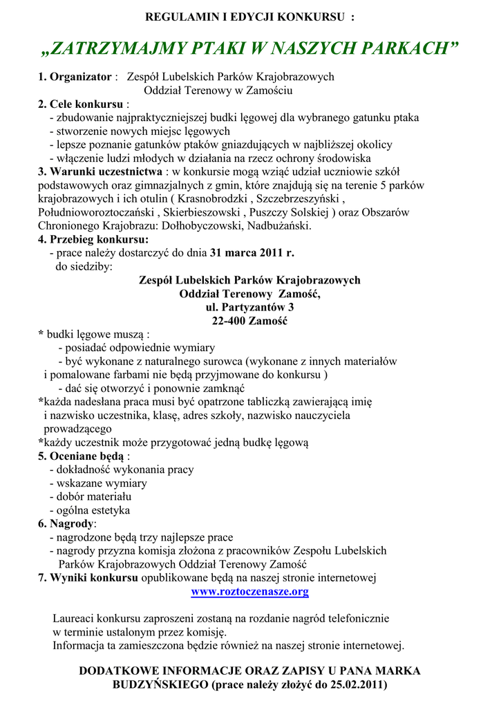 REGULAMIN I EDYCJI KONKURSU : „ZATRZYMAJMY PTAKI W NASZYCH PARKACH” 1. Organizator : Zespół Lubelskich Parków Krajobrazowych Oddział Terenowy w Zamościu 2. Cele konkursu : - zbudowanie najpraktyczniejszej budki lęgowej dla wybranego gatunku ptaka - stworzenie nowych miejsc lęgowych - lepsze poznanie gatunków ptaków gniazdujących w najbliższej okolicy - włączenie ludzi młodych w działania na rzecz ochrony środowiska 3. Warunki uczestnictwa : w konkursie mogą wziąć udział uczniowie szkół podstawowych oraz gimnazjalnych z gmin, które znajdują się na terenie 5 parków krajobrazowych i ich otulin ( Krasnobrodzki , Szczebrzeszyński , Południoworoztoczański , Skierbieszowski , Puszczy Solskiej ) oraz Obszarów Chronionego Krajobrazu: Dołhobyczowski, Nadbużański. 4. Przebieg konkursu: - prace należy dostarczyć do dnia 31 marca 2011 r. do siedziby: Zespół Lubelskich Parków Krajobrazowych Oddział Terenowy Zamość, ul. Partyzantów 3 22-400 Zamość * budki lęgowe muszą : - posiadać odpowiednie wymiary - być wykonane z naturalnego surowca (wykonane z innych materiałów i pomalowane farbami nie będą przyjmowane do konkursu ) - dać się otworzyć i ponownie zamknąć *każda nadesłana praca musi być opatrzone tabliczką zawierającą imię i nazwisko uczestnika, klasę, adres szkoły, nazwisko nauczyciela prowadzącego *każdy uczestnik może przygotować jedną budkę lęgową 5. Oceniane będą : - dokładność wykonania pracy - wskazane wymiary - dobór materiału - ogólna estetyka 6. Nagrody: - nagrodzone będą trzy najlepsze prace - nagrody przyzna komisja złożona z pracowników Zespołu Lubelskich Parków Krajobrazowych Oddział Terenowy Zamość 7. Wyniki konkursu opublikowane będą na naszej stronie internetowej www.roztoczenasze.org Laureaci konkursu zaproszeni zostaną na rozdanie nagród telefonicznie w terminie ustalonym przez komisję. Informacja ta zamieszczona będzie również na naszej stronie internetowej. DODATKOWE INFORMACJE ORAZ ZAPISY U PANA MARKA BUDZYŃSKIEGO (prace należy złożyć do 25.02.2011) ---------------------------------------------------------------------------------------------------------- ZGŁOSZENIE I EDYCJA KONKURSU „ZATRZYMAJMY PTAKI W NASZYCH PARKACH” PROSIMY WYPEŁNIĆ DRUKOWANYMI LITERAMI I ODESŁAĆ FORMULARZ NA ADRES: ZESPÓŁ LUBELSKICH PARKÓW KRAJOBRAZOWYCH ODDZIAŁ TERENOWY ZAMOŚĆ UL. PARTYZANTÓW 3 22-400 ZAMOŚĆ lub faxem: 84 639 22 09 do 31 marca 2011 roku IMIĘ I NAZWISKO UCZESTNIKA…………………………………………………………………………………. NAZWA I ADRES SZKOŁY……………………………………………………………………………………………. TELEFON/FAX………………………………………………………………………………………………………………. E-MAIL………………………………………………………………………………………………………………………….. GMINA NA TERENIE KTÓREJ ZNAJDUJE SIĘ SZKOŁA………………………………………………… LICZBA UCZESTNIKÓW………………………………………………………………………………............... IMIĘ I NAZWISKO NAUCZYCIELA PROWADZĄCEGO………………………………………………….