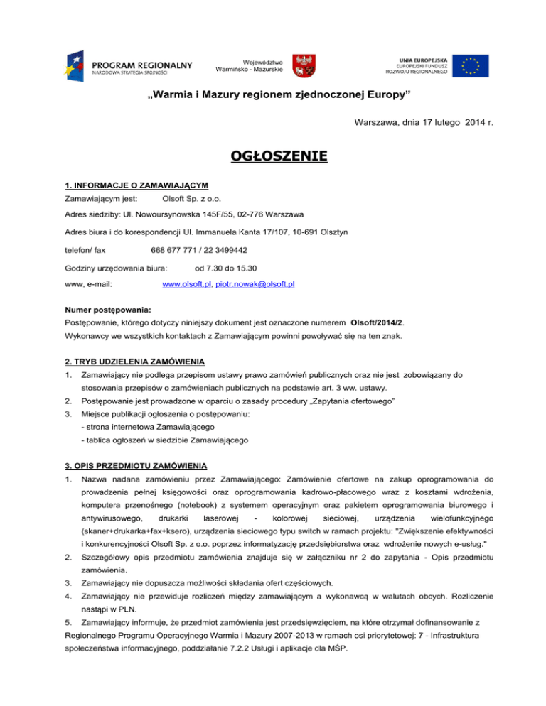 Województwo Warmińsko - Mazurskie „Warmia i Mazury regionem zjednoczonej Europy” Warszawa, dnia 17 lutego 2014 r. OGŁOSZENIE 1. INFORMACJE O ZAMAWIAJĄCYM Zamawiającym jest: Olsoft Sp. z o.o. Adres siedziby: Ul. Nowoursynowska 145F/55, 02-776 Warszawa Adres biura i do korespondencji Ul. Immanuela Kanta 17/107, 10-691 Olsztyn telefon/ fax 668 677 771 / 22 3499442 Godziny urzędowania biura: www, e-mail: od 7.30 do 15.30 www.olsoft.pl, [email protected] Numer postępowania: Postępowanie, którego dotyczy niniejszy dokument jest oznaczone numerem Olsoft/2014/2. Wykonawcy we wszystkich kontaktach z Zamawiającym powinni powoływać się na ten znak. 2. TRYB UDZIELENIA ZAMÓWIENIA 1. Zamawiający nie podlega przepisom ustawy prawo zamówień publicznych oraz nie jest zobowiązany do stosowania przepisów o zamówieniach publicznych na podstawie art. 3 ww. ustawy. 2. Postępowanie jest prowadzone w oparciu o zasady procedury „Zapytania ofertowego” 3. Miejsce publikacji ogłoszenia o postępowaniu: - strona internetowa Zamawiającego - tablica ogłoszeń w siedzibie Zamawiającego 3. OPIS PRZEDMIOTU ZAMÓWIENIA 1. Nazwa nadana zamówieniu przez Zamawiającego: Zamówienie ofertowe na zakup oprogramowania do prowadzenia pełnej księgowości oraz oprogramowania kadrowo-płacowego wraz z kosztami wdrożenia, komputera przenośnego (notebook) z systemem operacyjnym oraz pakietem oprogramowania biurowego i antywirusowego, drukarki laserowej - kolorowej sieciowej, urządzenia wielofunkcyjnego (skaner+drukarka+fax+ksero), urządzenia sieciowego typu switch w ramach projektu: "Zwiększenie efektywności i konkurencyjności Olsoft Sp. z o.o. poprzez informatyzację przedsiębiorstwa oraz wdrożenie nowych e-usług." 2. Szczegółowy opis przedmiotu zamówienia znajduje się w załączniku nr 2 do zapytania - Opis przedmiotu zamówienia. 3. Zamawiający nie dopuszcza możliwości składania ofert częściowych. 4. Zamawiający nie przewiduje rozliczeń między zamawiającym a wykonawcą w walutach obcych. Rozliczenie nastąpi w PLN. 5. Zamawiający informuje, że przedmiot zamówienia jest przedsięwzięciem, na które otrzymał dofinansowanie z Regionalnego Programu Operacyjnego Warmia i Mazury 2007-2013 w ramach osi priorytetowej: 7 - Infrastruktura społeczeństwa informacyjnego, poddziałanie 7.2.2 Usługi i aplikacje dla MŚP. 4. TERMIN REALIZACJI ZAMÓWIENIA Termin wykonania zamówienia: 20 marca 2014 r 5. OSOBY UPRAWNIONE DO KONTAKTÓW W WYKONAWCAMI SPRAWACH FORMALNYCH W sprawach formalnych: Piotr Nowak – Prezes Zarządu, w godzinach pracy biura – poniedziałek - piątek w godz. 7.30 – 15.30 6. MIEJSCE, TERMIN i SPOSÓB SKŁADANIA OFERT 1. Termin składania ofert: do dnia 27.02.2014 r. do godz.15.00. 2. Oferty należy przekazać osobiście, lub przesyłać na adres: Olsoft Sp. z o.o. Ul. Immanuela Kanta 17/107 10-691 Olsztyn 7. MIEJSCE I TERMIN WYBORU OFERT 1. Termin wyboru ofert: dnia 27.02.2014 r. 2. Miejsce: Ul. Immanuela Kanta 17/107, 10-691 Olsztyn 3. Zamawiający zastrzega sobie prawo do unieważnienia postępowania bez podania przyczyny. 8. KRYTERIA WYBORU OFERTY 1. Zamawiający dokona wyboru najkorzystniejszej oferty spośród ofert niepodlegających odrzuceniu z zastosowaniem następujących kryteriów oceny: LP 1 3 Cena netto Zgodność technologiczna oraz funkcjonalna przedmiotu zamówienia ze specyfikacją Doświadczenie 4 Aktualizacje oprogramowania 2 2. Nazwa kryterium oceny oferty Wartość punktowa wagi w % 40 40 10 10 Ocena będzie dokonywana według skali punktowej, przy założeniu, że maksymalna punktacja wynosi 500 punktów (wartość punktowa oferty x wartość punktowa wagi), w sposób określony w zapytaniu ofertowym. 3. Punkty będą liczone z dokładnością do dwóch miejsc po przecinku. 4. Za ofertę najkorzystniejszą będzie uznana oferta, która przy uwzględnieniu powyższych kryteriów i ich wag otrzyma najwyższą punktację. Jeśli nie będzie można dokonać wyboru oferty najkorzystniejszej ze względu na to, że dwie lub więcej ofert otrzyma taką samą punktację, Zamawiający spośród tych ofert wybierze ofertę z najniższą ceną. Więcej szczegółów w zapytaniu ofertowym, dostępnym też na: www.olsoft.pl „Projekt dofinansowany ze środków Europejskiego Funduszu Rozwoju Regionalnego w ramach Regionalnego Programu Operacyjnego Warmia i Mazury na lata 2007-2013” -2-