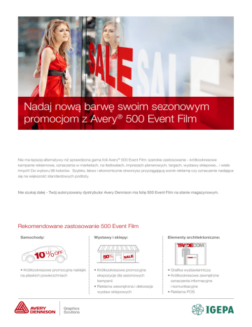 Nadaj nową barwę swoim sezonowym promocjom z Avery® 500 Event Film Nie ma lepszej alternatywy niż sprawdzona gama folii Avery® 500 Event Film: szerokie zastosowanie - krótkookresowe kampanie reklamowe, oznaczenia w marketach, na festiwalach, imprezach plenerowych, targach, wystawy sklepowe... i wiele innych! Do wyboru 96 kolorów. Szybko, łatwo i ekonomicznie stworzysz przyciągającą wzrok reklamę czy oznaczenie nadające się na większość standardowych podłoży. Nie szukaj dalej - Twój autoryzowany dystrybutor Avery Dennison ma folię 500 Event Film na stanie magazynowym. Rekomendowane zastosowanie 500 Event Film Samochody: Wystawy i sklepy: Elementy architektoniczne: • Krótkookresowe promocyjne naklejki na płaskich powierzchniach • Krótkookresowe promocyjne ekspozycje dla sezonowych kampanii • Reklama wewnętrzna i dekoracje wystaw sklepowych • Grafika wystawiennicza • Krótkookresowe zewnętrzne oznaczenia informacyjne i komunikacyjne • Reklama POS Paleta kolorów Stone Yellow Avery 526 Cobalt Blue Avery 540 Grass Green Avery 518 Butter Yellow Avery 527 Dark Blue Avery 512 Light Green Avery 517 Primrose Yellow Avery 504 Vivid Blue Avery 528 Lime Avery 531 Bright yellow Avery 525 Ultramarine Blue Avery 520 White Avery 501 Light Orange Avery 516 Reflex Blue Avery 539 Mist Grey Avery 544 Orange Avery 509 Blue Avery 505 Light Grey Avery 529 Poppy Red Avery 514 Intense Blue Avery 521 Grey Avery 508 Medium Red Avery 523 Bright Blue Avery 510 Dove Grey Avery 545 Cherry Red Avery 511 Gentian Blue Avery 538 Dark Grey Avery 530 Geranium Red Avery 503 Light Blue Avery 537 Black Avery 502 Red Avery 519 Turquoise Avery 534 Silver Avery 546 Dark Red Avery 515 Teal Avery 535 Gold Avery 547 Burgundy Avery 513 Mint Avery 536 Ivory Avery 542 Magenta Avery 524 Forest Green Avery 533 Beige Avery 543 Pink Avery 541 Kelly Green Avery 532 Brown Avery 507 Violet Avery 522 Cactus Green Avery 506 Nut Brown Avery 548 Wydrukowane kolory mogą różnić się od palety barw Avery 500 Film - poproś o kartę kolorów. Charakterystyka folii 500 Event Film: > 96 standardowych kolorów dostępnych z magazynu > Przeznaczone do użycia na płaskich powierzchniach > Klasa palności B1/M1- świetnie nadają się do zastosowania w czasie imprez plenerowych, jak i odbywających się w pomieszczeniach, EN13501-01 > Trwały akrylowy klej > 5-letnia, 70-mikronowa, monomeryczna folia kalandrowana > Doskonały współczynnik ceny do jakości dla krótkookresowych zastosowań > Idealne do wycinania ploterem tnącym Rekomendowane zastosowanie: > Krótkookresowe zastosowanie na samochodach osobowych, ciężarówkach, autobusach > Krótkookresowe grafiki promocyjne na płaskich powierzchniach pojazdów > Elementy wystaw sklepowych – zewnętrzne i wewnętrzne > Sezonowe kampanie promocyjne oraz rozwiązania POS > Aplikacje architektoniczne > Grafika wystawiennicza oraz eventowa > Krótkookresowe oznaczenia informacyjne i komunikacyjne (zewnętrzne i wewnętrzne) Odwiedź stronę www.europe.averygraphics.com lub www.igepa.pl aby uzyskać pełne informacje o produktach lub skontaktuj się telefonicznie z BOK Igepa Viscom. Distributed by Biuro Obsługi Klienta tel. +48 664 104 105, +48 (12) 639 24 40; fax +48 (12) 639 24 39; [email protected], www.igepa.pl KRAKÓW Igepa Polska Sp. z o.o. 31-588 Kraków ul. Siwka 11 tel. 012 639 24 00 fax 012 639 24 39 [email protected] WARSZAWA Igepa Polska Sp. z o.o. Moszna Parcela 29 05-840 Brwinów tel. 022 738 39 50 fax 022 738 39 60 [email protected] POZNAŃ Igepa Polska Sp. z o.o. Sady k/Poznania 62-080 Tarnowo Podgórne ul. Za Motelem 2d tel. 061 657 10 00 fax 061 657 10 10 [email protected] WROCŁAW Igepa Polska Sp. z o.o. Wojkowice 55-020 Żórawina ul. Wrocławska 36 tel. 071 363 86 47 fax 071 367 03 46 [email protected] Inspired Brands. Intelligent Wo ŁÓDŹ Igepa Polska Sp. z o.o. 92-404 Łódź ul. Zakładowa 90-92 Wydrukowano na papierze Profi Silk (środek 150gsm, okładka 300gsm). które dotyczą folii Avery 500 Event Film, znajdują się na stronie internetowej: Informacje na temat warunków gwarancji, ograniczeń w stosowaniu, www.europe.averygraphics.com. Wszystkie stwierdzenia, informacje techniczne i zalecenia dotyczące produktów Avery Dennison są oparte na wynikach badań i wiarygodnych informacjach, lecz nie stanowią gwarancji ani rękojmi. Wszystkie produkty Avery Dennison sprzedawane są z zastrzeżeniem, iż Zamawiający samodzielnie oceni przydatność danego produktu do swoich określonych celów. 2013-02_14592_500-EN © Avery Dennison Corporation Inspired Brands. Intelligent World.TM