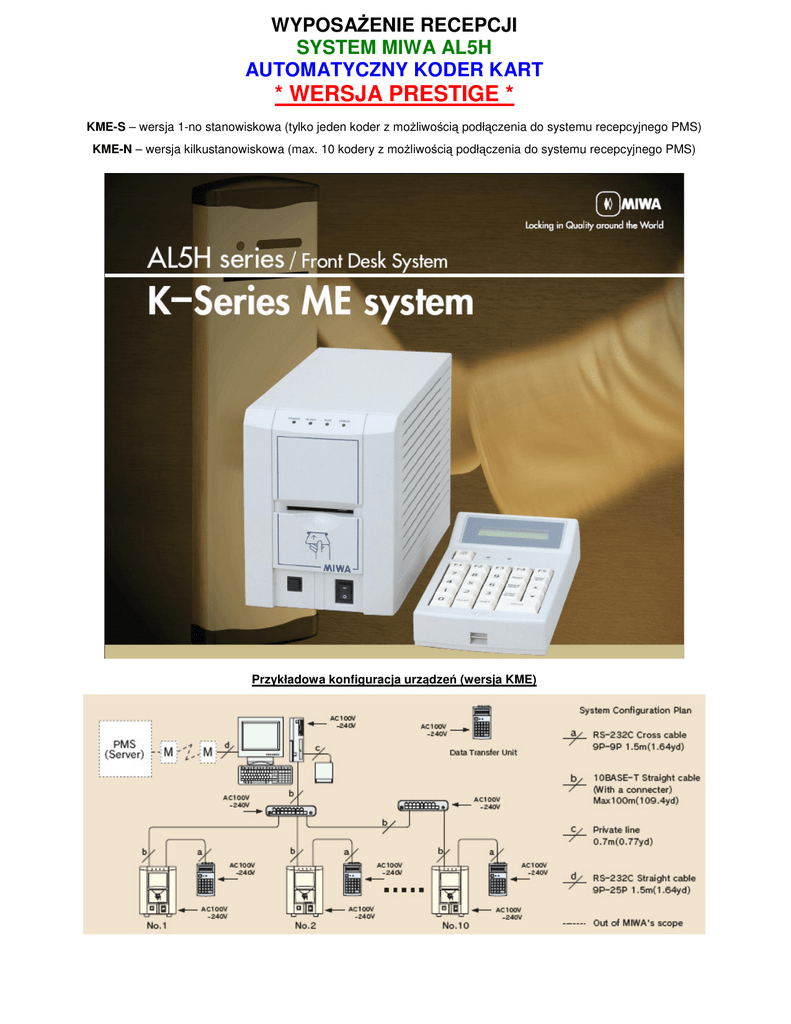 WYPOSAŻENIE RECEPCJI SYSTEM MIWA AL5H AUTOMATYCZNY KODER KART * WERSJA PRESTIGE * KME-S – wersja 1-no stanowiskowa (tylko jeden koder z możliwością podłączenia do systemu recepcyjnego PMS) KME-N – wersja kilkustanowiskowa (max. 10 kodery z możliwością podłączenia do systemu recepcyjnego PMS) Przykładowa konfiguracja urządzeń (wersja KME) Konfiguracja cenowa oraz opis urządzeń Wersja 1-no stanowiskowa (KME-S) Oprogramowanie do systemu MIWA AL5H jest zainstalowane na oddzielnym komputerze PC (z Win XP). Do komputera podłączone są kodery, pracujące w systemie. Dzięki zastosowaniu koderów automatycznych, na karcie magnetycznej, zakodować dostęp do poszczególnych pomieszczeń w Hotelu oraz dodatkowe usługi (np. darmowe drinki, kredyt hotelowy, etc.). Jest to tzw. opcja POS, która jest realizowana niezależnie od systemu zamków MIWA, przez system recepcyjny PMS. W chwili kodowania karty, na drugiej ścieżce paska magnetycznego, można zakodować informację do systemu POS, „wysłaną” przez system recepcyjny PMS. Dodatkowo, kodery automatyczne, można wyposażyć w specjalna klawiaturę (KDU), dzięki której w sytuacji, gdy komputer systemowy ulegnie awarii, możemy na koderze (połączonym z taka klawiaturą) wydać maksymalnie 1000 nowych kart dla gości. Po usunięciu awarii, koder automatycznie przesyła dane o wydanych kartach do komputera. Komputer, można podłączyć do hotelowego systemu recepcyjnego PMS (kabel oraz interface połączeniowy dostarcza firma PMS). Koszt kodera KME-S: 13.000,- PLN netto + 22% VAT Koszt kodera kart chipowych: 650,- PLN netto + 22% VAT Koszt programatora zamków DTU: 5.500,- PLN netto + 22% VAT Koszt klawiatury KDU: 4.500,- PLN netto + 22% VAT - opcja Komputer do systemu z ekranem 17”: 3700,- PLN netto + 22% VAT (może dostarczyć Hotel) Czas dostawy: około 4-6 tygodni Okres gwarancji: 12 miesięcy Wersja kilkustanowiskowa stanowiskowa (KME-N) Jest to rozbudowana wersja systemu KME-S. Maksymalnie, możemy tutaj wykorzystać 10 koderów kart magnetycznych na recepcji (każdy połączony z osobnym terminalem PMS). Komputer MIWA AL5H, można podłączyć do hotelowego systemu recepcyjnego PMS (kabel oraz interface połączeniowy dostarcza firma PMS). Koszt kodera KME-N - Master: 14.250,- PLN netto + 22% VAT Koszt kodera KME-N - Slave: 13.650,- PLN netto + 22% VAT Koszt kodera kart chipowych: 650,- PLN netto + 22% VAT Koszt programatora zamków DTU: 5.500,- PLN netto + 22% VAT Koszt klawiatury KDU: 4.500,- PLN netto + 22% VAT - opcja Komputer do systemu z ekranem 17”: 3700,- PLN netto + 22% VAT (może dostarczyć Hotel) Czas dostawy: około 4-6 tygodni Okres gwarancji: 12 miesięcy