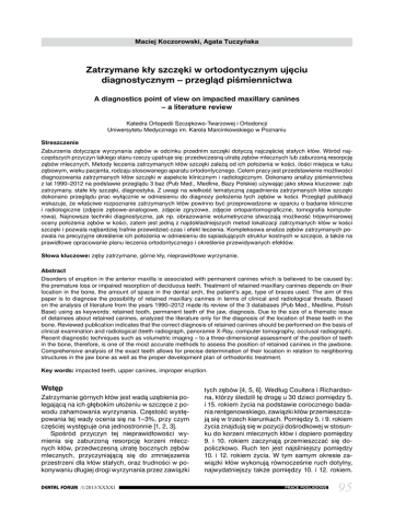 Maciej Koczorowski, Agata Tuczyńska Zatrzymane kły szczęki w ortodontycznym ujęciu diagnostycznym – przegląd piśmiennictwa A diagnostics point of view on impacted maxillary canines – a literature review Katedra Ortopedii Szczękowo-Twarzowej i Ortodoncji Uniwersytetu Medycznego im. Karola Marcinkowskiego w Poznaniu Streszczenie Zaburzenia dotyczące wyrzynania zębów w odcinku przednim szczęki dotyczą najczęściej stałych kłów. Wśród najczęstszych przyczyn takiego stanu rzeczy upatruje się: przedwczesną utratę zębów mlecznych lub zaburzoną resorpcję zębów mlecznych. Metody leczenia zatrzymanych kłów szczęki zależą od ich położenia w kości, ilości miejsca w łuku zębowym, wieku pacjenta, rodzaju stosowanego aparatu ortodontycznego. Celem pracy jest przedstawienie możliwości diagnozowania zatrzymanych kłów szczęki w aspekcie klinicznym i radiologicznym. Dokonano analizy piśmiennictwa z lat 1990–2012 na podstawie przeglądu 3 baz (Pub Med., Medline, Bazy Polskie) używając jako słowa kluczowe: ząb zatrzymany, stałe kły szczęki, diagnostyka. Z uwagi na wielkość tematyczną zagadnienia zatrzymanych kłów szczęki dokonano przeglądu prac wyłącznie w odniesieniu do diagnozy położenia tych zębów w kości. Przegląd publikacji wskazuje, że właściwe rozpoznanie zatrzymanych kłów powinno być przeprowadzone w oparciu o badanie kliniczne i radiologiczne (zdjęcie zębowe-analogowe, zdjęcie zgryzowe, zdjęcie ortopantomograficzne, tomografia komputerowa). Najnowsze techniki diagnostyczne, jak np. obrazowanie wolumetryczne stwarzają możliwość trójwymiarowej oceny położenia zębów w kości, zatem jest jedną z najdokładniejszych metod lokalizacji zatrzymanych kłów w kości szczęki i pozwala najbardziej trafnie przewidzieć czas i efekt leczenia. Kompleksowa analiza zębów zatrzymanych pozwala na precyzyjne określenie ich położenia w odniesieniu do sąsiadujących struktur kostnych w szczęce, a także na prawidłowe opracowanie planu leczenia ortodontycznego i określenie przewidywanych efektów. Słowa kluczowe: zęby zatrzymane, górne kły, nieprawidłowe wyrzynanie. Abstract Disorders of eruption in the anterior maxilla is associated with permanent canines which is believed to be caused by: the premature loss or impaired resorption of deciduous teeth. Treatment of retained maxillary canines depends on their location in the bone, the amount of space in the dental arch, the patient's age, type of braces used. The aim of this paper is to diagnose the possibility of retained maxillary canines in terms of clinical and radiological threats. Based on the analysis of literature from the years 1990–2012 made its review of the 3 databases (Pub Med., Medline, Polish Base) using as keywords: retained tooth, permanent teeth of the jaw, diagnosis. Due to the size of a thematic issue of detainees about retained canines, analyzed the literature only for the diagnosis of the location of these teeth in the bone. Reviewed publication indicates that the correct diagnosis of retained canines should be performed on the basis of clinical examination and radiological (teeth radiograph, panoramie X-Ray, computer tomography, occlusal radiograph). Recent diagnostic techniques such as volumetric imaging – to a three-dimensional assessment of the position of teeth in the bone, therefore, is one of the most accurate methods to assess the position of retained canines in the jawbone. Comprehensive analysis of the exact teeth allows for precise determination of their location in relation to neighboring structures in the jaw bone as well as the proper development plan of orthodontic treatment. Key words: impacted teeth, upper canines, improper eruption. Wstęp Zatrzymanie górnych kłów jest wadą uzębienia polegającą na ich głębokim ułożeniu w szczęce z powodu zahamowania wyrzynania. Częstość występowania tej wady ocenia się na 1–3%, przy czym częściej występuje ona jednostronnie [1, 2, 3]. Spośród przyczyn tej nieprawidłowości wymienia się zaburzoną resorpcję korzeni mlecznych kłów, przedwczesną utratę bocznych zębów mlecznych, przyczyniającą się do zmniejszenia przestrzeni dla kłów stałych, oraz trudności w pokonywaniu długiej drogi wyrzynania przez zawiązki DENTAL FORUM /1/2013/XXXXI tych zębów [4, 5, 6]. Według Coultera i Richardsona, którzy śledzili tę drogę u 30 dzieci pomiędzy 5. i 15. rokiem życia na podstawie corocznego badania rentgenowskiego, zawiązki kłów przemieszczają się w trzech kierunkach. Pomiędzy 5. i 9. rokiem życia znajdują się w pozycji dośrodkowej w stosunku do korzeni mlecznych kłów i dopiero pomiędzy 9. i 10. rokiem zaczynają przemieszczać się dopoliczkowo. Ruch ten jest najsilniejszy pomiędzy 10. i 12. rokiem życia. W tym samym okresie zawiązki kłów wykonują równocześnie ruch dotylny, najwydatniejszy także pomiędzy 10. i 12. rokiem. PRACE POGLĄDOWE 95 Maciej Koczorowski, Agata Tuczyńska Natomiast pionowy ruch kłów trwa nieprzerwanie od 5. roku życia, z wyraźnym nasileniem pomiędzy 9. i 12. rokiem, kiedy to zęby te przemieszczają się pomiędzy bocznym siekaczem i pierwszym przedtrzonowcem w kierunku wnętrza jamy ustnej. Ogółem pomiędzy 5. i 15. rokiem życia kły górne przemierzają w kości drogę, wynoszącą około 22 mm [7]. W rzadkich przypadkach obserwowano zaskakująco odmienne kierunki wędrówek tych zębów, trudne do wyjaśnienia [8, 9, 10]. Częściej, mimo ukończonego rozwoju, kły pozostają na stałe w szczęce, przeważnie po jej stronie podniebiennej. Przyczyny takiego zaburzenia nie są do tej pory w pełni wyjaśnione. Przypuszcza się, że, obok wymienionych już czynników przyczynowych, pewien wpływ mogą mieć na to zarówno struktura tkanki kostnej, jak i pierwotnie nieprawidłowa pozycja korony tworzącego się zawiązka kła. [5, 6, 20]. Na szczególną uwagę zasługuje fakt, że do zatrzymania górny
