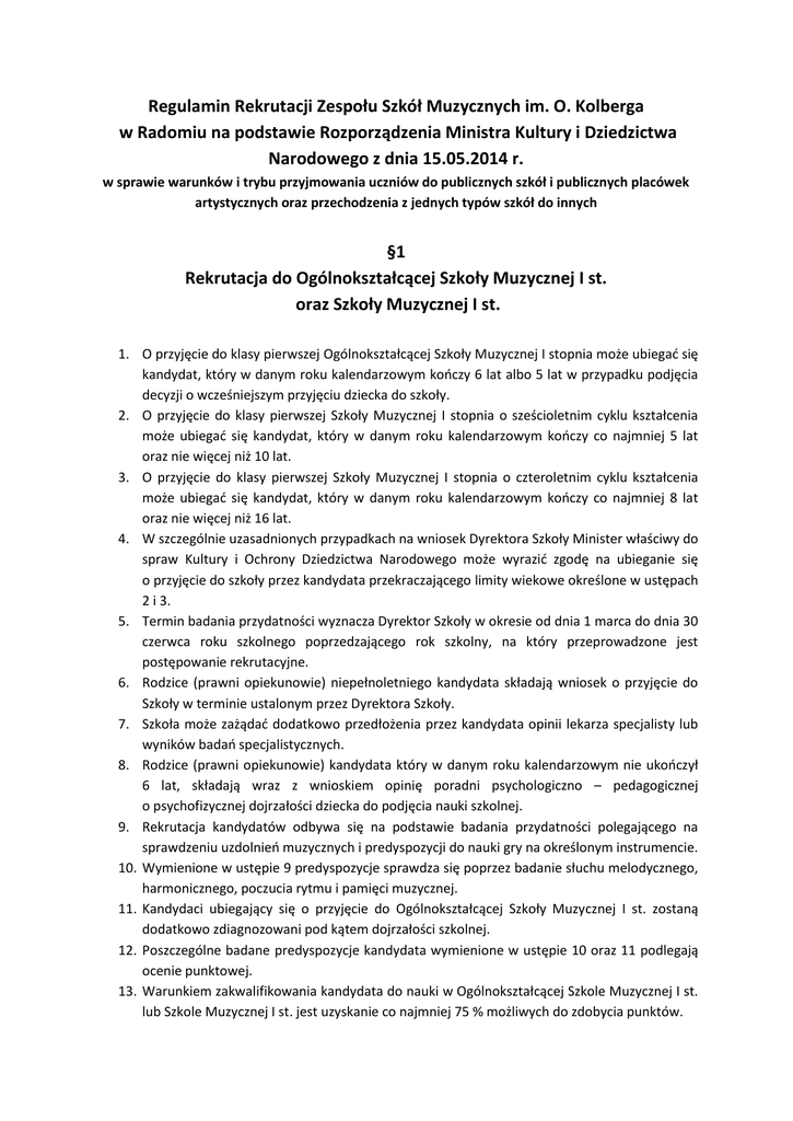 Regulamin Rekrutacji Zespołu Szkół Muzycznych im. O. Kolberga w Radomiu na podstawie Rozporządzenia Ministra Kultury i Dziedzictwa Narodowego z dnia 15.05.2014 r. w sprawie warunków i trybu przyjmowania uczniów do publicznych szkół i publicznych placówek artystycznych oraz przechodzenia z jednych typów szkół do innych §1 Rekrutacja do Ogólnokształcącej Szkoły Muzycznej I st. oraz Szkoły Muzycznej I st. 1. O przyjęcie do klasy pierwszej Ogólnokształcącej Szkoły Muzycznej I stopnia może ubiegad się kandydat, który w danym roku kalendarzowym kooczy 6 lat albo 5 lat w przypadku podjęcia decyzji o wcześniejszym przyjęciu dziecka do szkoły. 2. O przyjęcie do klasy pierwszej Szkoły Muzycznej I stopnia o sześcioletnim cyklu kształcenia może ubiegad się kandydat, który w danym roku kalendarzowym kooczy co najmniej 5 lat oraz nie więcej niż 10 lat. 3. O przyjęcie do klasy pierwszej Szkoły Muzycznej I stopnia o czteroletnim cyklu kształcenia może ubiegad się kandydat, który w danym roku kalendarzowym kooczy co najmniej 8 lat oraz nie więcej niż 16 lat. 4. W szczególnie uzasadnionych przypadkach na wniosek Dyrektora Szkoły Minister właściwy do spraw Kultury i Ochrony Dziedzictwa Narodowego może wyrazid zgodę na ubieganie się o przyjęcie do szkoły przez kandydata przekraczającego limity wiekowe określone w ustępach 2 i 3. 5. Termin badania przydatności wyznacza Dyrektor Szkoły w okresie od dnia 1 marca do dnia 30 czerwca roku szkolnego poprzedzającego rok szkolny, na który przeprowadzone jest postępowanie rekrutacyjne. 6. Rodzice (prawni opiekunowie) niepełnoletniego kandydata składają wniosek o przyjęcie do Szkoły w terminie ustalonym przez Dyrektora Szkoły. 7. Szkoła może zażądad dodatkowo przedłożenia przez kandydata opinii lekarza specjalisty lub wyników badao specjalistycznych. 8. Rodzice (prawni opiekunowie) kandydata który w danym roku kalendarzowym nie ukooczył 6 lat, składają wraz z wnioskiem opinię poradni psychologiczno – pedagogicznej o psychofizycznej dojrzałości dziecka do podjęcia nauki szkolnej. 9. Rekrutacja kandydatów odbywa się na podstawie badania przydatności polegającego na sprawdzeniu uzdolnieo muzycznych i predyspozycji do nauki gry na określonym instrumencie. 10. Wymienione w ustępie 9 predyspozycje sprawdza się poprzez badanie słuchu melodycznego, harmonicznego, poczucia rytmu i pamięci muzycznej. 11. Kandydaci ubiegający się o przyjęcie do Ogólnokształcącej Szkoły Muzycznej I st. zostaną dodatkowo zdiagnozowani pod kątem dojrzałości szkolnej. 12. Poszczególne badane predyspozycje kandydata wymienione w ustępie 10 oraz 11 podlegają ocenie punktowej. 13. Warunkiem zakwalifikowania kandydata do nauki w Ogólnokształcącej Szkole Muzycznej I st. lub Szkole Muzycznej I st. jest uzyskanie co najmniej 75 % możliwych do zdobycia punktów. §2 Rekrutacja do Ogólnokształcącej Szkoły Muzycznej II st. oraz Szkoły Muzycznej II st. 1. O przyjęcie do klasy pierwszej Szkoły Muzycznej II stopnia może ubiegad się kandydat, który w danym roku kalendarzowym kooczy co najmniej 10 oraz nie więcej 23 lata. 2. O przyjęcie do klasy pierwszej Ogólnokształcącej Szkoły Muzycznej II stopnia może ubiegad się kandydat, który w danym roku kalendarzowym kooczy nie więcej niż 14 lat. 3. W szczególnie uzasadnionych przypadkach na wniosek Dyrektora Szkoły Minister właściwy do spraw Kultury i i Ochrony Dziedzictwa Narodowego może wyrazid zgodę na ubieganie się o przyjęcie do szkoły przez kandydata przekraczającego limity wiekowe określone w ustępie 1. 4. Termin egzaminu wstępnego wyznacza Dyrektor Szkoły w okresie od dnia 1 marca do dnia 30 czerwca roku szkolnego poprzedzającego rok szkolny, na który przeprowadzone jest postępowanie rekrutacyjne. 5. Kandydaci, a w przypadku kandydatów niepełnoletnich ich rodzice lub prawni opiekunowie, składają wniosek o przyjęcie do Szkoły w terminie ustalonym przez Dyrektora Szkoły. 6. Do wniosku kandydaci albo rodzice lub prawni opiekunowie niepełnoletniego kandydata ubiegającego się o przyjęcie do Ogólnokształcącej Szkoły Muzycznej II st. powinni dołączyd: zaświadczenie o uczęszczaniu do klasy szóstej szkoły podstawowej lub klasy szóstej ogólnokształcącej szkoły muzycznej I st. 7. Do wniosku kandydaci albo rodzice lub opiekunowie prawni niepełnoletniego kandydata ubiegającego się o przyjęcie do Ogólnokształcącej Szkoły Muzycznej II st. oraz Szkoły Muzycznej II st. na wydział instrumentalny w specjalności instrumentów dętych drewnianych i blaszanych powinni dołączyd: zaświadczenie lekarskie o braku przeciwwskazao zdrowotnych do podjęcia kształcenia wydane przez lekarza specjalistę z zakresu pulmonologii. 8. Do wniosku kandydaci albo rodzice lub opiekunowie prawni niepełnoletniego kandydata ubiegającego się o przyjęcie do szkoły muzycznej II st. na wydział wokalny powinni dołączyd: zaświadczenie lekarskie o braku przeciwwskazao zdrowotnych do podjęcia kształcenia na wydziale wokalnym wydane przez lekarza specjalistę z zakresu audiologii i foniatrii. 9. Rekrutacja kandydatów odbywa się na podstawie egzaminu wstępnego, który obejmuje: 1) egzamin praktyczny z przygotowanych przez kandydata utworów muzycznych (wydział instrumentalny), badanie predyspozycji ruchowych oraz egzamin praktyczny z fortepianu (wydział rytmiki), sprawdzenie predyspozycji głosowych (wydział wokalny), 2) test pisemny z kształcenia słuchu przy czym kandydaci po niepełnym cyklu kształcenia muzycznego w szkole muzycznej I st. zdają egzamin ustny, 3) test pisemny z wiedzy ogólnomuzycznej. 10. Zakres wymagao poszczególnych egzaminów wymienionych w ustępie 9 jest podawany do publicznej wiadomości najpóźniej 30 dni przed terminem w/w egzaminów, poprzez publikację na stronie internetowej szkoły. 11. Każdy egzamin wymieniony w ustępie 9 oceniany jest w skali od 1 do 25 punktów. 12. Oc