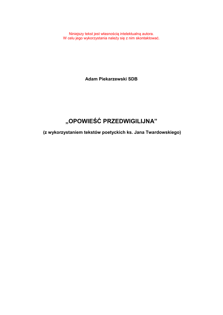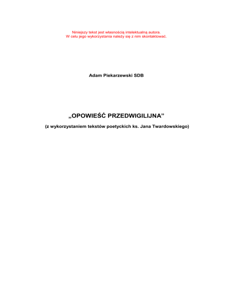 Niniejszy tekst jest własnością intelektualną autora. W celu jego wykorzystania należy się z nim skontaktować. Adam Piekarzewski SDB „OPOWIEŚĆ PRZEDWIGILIJNA” (z wykorzystaniem tekstów poetyckich ks. Jana Twardowskiego) Adam Piekarzewski SDB „Opowieść przedwigilijna” (z wykorzystaniem tekstów poetyckich ks. Jana Twardowskiego) Osoby: Tycjan – artysta, u którego w domu rozgrywa się akcja Wiktor – przyjaciel Tycjana Proboszcz – ksiądz zaprzyjaźniony z Tycjanem i Wiktorem Anioł – tajemniczy posłaniec AKCJA: (pukanie do drzwi) Tycjan: - Nie wchodzić, nie ma mnie w domu… (wchodzi Wiktor) Wiktor: - Czołem, panie Tycjanku kochany! Zwyczajnie w dobrym humorze, jak widzę! Jak tam przygotowania? T: - Do czego? W: - Do świąt, naturalnie. Słyszałem kiedyś od ojca, Ŝe artyści tracą często kontakt z rzeczywistością… Czy pan w ogóle kojarzy, jaki mamy miesiąc? T: - Zimny, panie Wiktorze, zimny! W: - Nie o tym mowa, panie Tycjanie… Wśród nocnej ciszy… Bóg się rodzi, moc truchleje… Pójdźmy wszyscy… T: - Przyjacielu, nie obraź się, ale ja juŜ wyrosłem z tej całej ospałej tradycji… W: - Zdaje mi się, Ŝeś zapomniał, jak to zawsze pan Tycjan, szanowany bądź co bądź artysta, i znany teŜ przez świat, łamał opłatek z przyjacielem Wiktorem; jak wzdychał na myśl o BoŜym Narodzeniu… T: - …o tym, jak naprawdę było; (ironicznie) i modlił się do świętej rewolucji z Betlejem, od której czas liczymy. Kiedy znowu zaczął merdać puszysty ogon tradycji, wprosiła się choinka, elegancko ubrana, mlaskały kluski z makiem, kura po wigilii spieszyła się na rosół… (nagle ogarnia go przygnębienie) Potem milczenie większe niŜ Ŝal… Wydawało mu się, Ŝe słowo ciałem się stało… W: - …i mieszkało… T: - …poza nami. Nawet słyszałem, Ŝe za oknem przyszedł Pan Jezus, prosty jak kościół z jedną tylko malwą, obdarty ze śniegu i polskich kolęd. Za wcześnie, za późno, nie w porę… Nacisnął dzwonek, dzwonek był nieczynny… (mocne pukanie do drzwi) W: - Proszę wejść, jeśli w dobrych zamiarach. (wchodzi Proboszcz) Proboszcz: - W dobrych, dobrych. Trochę Kościoła wam przynoszę. Dzwonek był nieczynny! T: - Co sprowadza księdza proboszcza w moje skromne progi? P: - Opłatki roznoszę i pomyślałem, Ŝe wstąpię do szanownego pana artysty i podpytam o wigilię… T: - (stanowczo) W tym roku wigilii tu nie będzie! (Proboszcz zerka na Wiktora, który tylko wzrusza ramionami) P: - (z duŜym zdziwieniem) AleŜ, panie Tycjanie, u pana, co roku była najpiękniejsza kolacja… I kolędy były, i Ŝyczenia teŜ pamiętam – te, co na choince wisiały, bo lekkie, i te cięŜkie pod stołem… SkądŜe taka zmiana? T: - W tym roku nie będzie! MoŜe trzeba by odpocząć; na nowo nabrać sił i odwagi? Wigilia jest co roku… Czy nie sądzi ksiądz, Ŝe stała się juŜ ona tylko kwestią przyzwyczajenia? Co ksiądz na to? P: - Gdyby ktoś powiedział przed wojną, Ŝe Wrocław będzie polskim miastem, Polak zostanie papieŜem, a komuniści postawią pomnik Prymasowi, nikt by w to nie uwierzył… A wszystko to się stało – mówił wół w Betlejem osiołkowi. Jaki będzie wiek dwudziesty pierwszy? – pytają pastuszkowie, co uklękli w śpiewie i trzej mędrcy. Nawet Jezus tak maleńki, Ŝe nie wie… (pukanie do drzwi) W: - A kogo to znowu niesie? (wchodzi Anioł) Anioł: - Przepraszam za łomoty, ale dzwonek był nieczynny! Jest nadzieja, proszę państwa, i szanownego księdza proboszcza! Jest nadzieja! Stale narzekamy: na dziurę w moście, na piąte koło u wozu, na dwa grzyby w barszczu, na kropkę bez „i”, P: - na piłkę, co ciągle łamie kwiaty przed plebanią, T: - na szczęście bez dalszego ciągu, W: - na to, Ŝe nas nie widać, i Ŝe wszyscy umierają, a nie tylko niektórzy, A: - na to, jak bardzo wystarczy kochać, Ŝeby siebie zniszczyć, ale stale potrzeba tego, co niepotrzebne… (oŜywiony wyciąga walizkę) Mam tu coś dla was wszystkich. Prosto od Szefa! (zaczyna wyciągać i zapalać świece; podaje je po kolei Proboszczowi, Wiktorowi i Tycjanowi) W: - Szanowny panie, czy pozwoli pan, Ŝe zapytam o imię i cel tej nieoczekiwanej wizyty w mieszkaniu pana Tycjana? A: - Jestem tylko posłańcem. Rozumie pan? Wchodzę, przekazuję, co trzeba i wychodzę. (wychodzi) P: - (patrzy na świecę) Ale co to jest? W: - Pobiegnę zapytać… (wychodzi) P: - Idę z panem. MoŜe nasz nieznajomy weźmie trochę opłatka… (wychodzi) T: - (krzyczy za nimi) Ja wiem, co to! (sam do siebie) To nadzieja… Sam przecieŜ mówił… (siada przy pianinie i gra) Nie boję się dętej orkiestry przy końcu świata; biblijnego tupania… Boję się Twojej miłości, Ŝe kochasz zupełnie inaczej, tak bliski i inny… Nie patrzysz moimi oczyma. Ludzi do ludzi zbliŜasz (wchodzi po cichu Proboszcz) i stale uczysz odchodzić. Mówisz zbyt często do Ŝywych… P: - …umarli to wytłumaczą… T: - Boję się Twojej miłości – tej najprawdziwszej i innej… P: - (patrzy na świeczkę) To nadzieja. Bóg, który przychodzi, Ŝeby była wiosna… T: - Tak wiem… Ona budzi moją miłość, tę, co tak głęboko utknęła w sercu… Budzi ją, choć to wbrew naturze, bo przecieŜ zima… (wchodzi Wiktor) P: - W tę noc, co nie wiedziała jeszcze, Ŝe jest święta, nie pochlebcy, urzędnicy, spryciarze, W: - chwalipięty Ŝe „tam byłem pierwszy”, nie reporterzy z telewizji ani dziennikarze, T: - ale najbliŜsi… P: - najbliŜsi, zawsze sobie krewni, W: - analfabeci z bijącym sercem i mędrcy – bo szukają, biegli niespokojni (wchodzi Anioł z zapaloną świecą) A: - Kiedy rozsądni się gorszyli, Bóg wszechmogący stał się ludzkim dzieckiem z wyciągniętymi bezradnie rękami… T: - …i świat się wcale nie zawalił… A: - zgarbiony uśmiechnął się i zaczął prostować… (wspólny śpiew kolędy) KONIEC