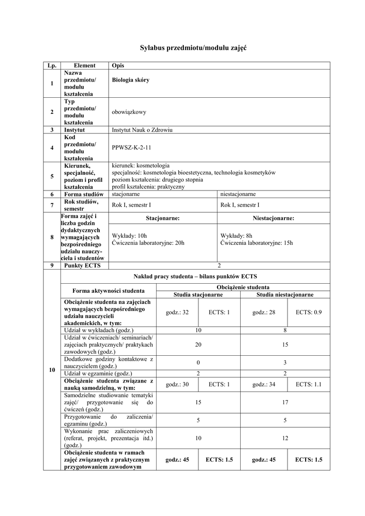 Sylabus przedmiotu/modułu zajęć Lp. 1 2 3 4 5 6 7 8 9 Element Nazwa przedmiotu/ modułu kształcenia Typ przedmiotu/ modułu kształcenia Instytut Kod przedmiotu/ modułu kształcenia Kierunek, specjalność, poziom i profil kształcenia Forma studiów Rok studiów, semestr Forma zajęć i liczba godzin dydaktycznych wymagających bezpośredniego udziału nauczyciela i studentów Punkty ECTS Opis Biologia skóry obowiązkowy Instytut Nauk o Zdrowiu PPWSZ-K-2-11 kierunek: kosmetologia specjalność: kosmetologia bioestetyczna, technologia kosmetyków poziom kształcenia: drugiego stopnia profil kształcenia: praktyczny stacjonarne niestacjonarne Rok I, semestr I Rok I, semestr I Stacjonarne: Niestacjonarne: Wykłady: 10h Ćwiczenia laboratoryjne: 20h Wykłady: 8h Ćwiczenia laboratoryjne: 15h 2 Nakład pracy studenta – bilans punktów ECTS Forma aktywności studenta 10 Obciążenie studenta na zajęciach wymagających bezpośredniego udziału nauczycieli akademickich, w tym: Udział w wykładach (godz.) Udział w ćwiczeniach/ seminariach/ zajęciach praktycznych/ praktykach zawodowych (godz.) Dodatkowe godziny kontaktowe z nauczycielem (godz.) Udział w egzaminie (godz.) Obciążenie studenta związane z nauką samodzielną, w tym: Samodzielne studiowanie tematyki zajęć/ przygotowanie się do ćwiczeń (godz.) Przygotowanie do zaliczenia/ egzaminu (godz.) Wykonanie prac zaliczeniowych (referat, projekt, prezentacja itd.) (godz.) Obciążenie studenta w ramach zajęć związanych z praktycznym przygotowaniem zawodowym Obciążenie studenta Studia stacjonarne Studia niestacjonarne godz.: 32 ECTS: 1 ECTS: 0.9 10 8 20 15 0 3 2 2 godz.: 30 godz.: 45 godz.: 28 ECTS: 1 godz.: 34 ECTS: 1.1 15 17 5 5 10 12 ECTS: 1.5 godz.: 45 ECTS: 1.5 11 12 13 14 Suma Nauczyciel akademicki odpowiedzialny za przedmiot/ moduł (egzaminujący) Nauczyciele akademiccy prowadzący przedmiot/ moduł Wymagania (kompetencje) wstępne Założenia i cele przedmiotu godz.: 62 ECTS: 2 godz.: 62 ECTS: 2 Dr hab. Zofia Rogóż Dr hab. Zofia Rogóż Odbyte kursy w zakresie biologii i histologii na studiach I stopnia Zapoznanie studentów z tematyką biologii skóry, procesami zachodzącymi w skórze w warunkach fizjologicznych oraz patologicznych. Przedstawienie możliwości inżynierii tkankowej w zakresie medycyny regeneracyjnej. Opis efektów kształcenia w zakresie: Odniesienie do kierunkowych efektów kształcenia Odniesienie do efektów kształcenia dla obszaru WIEDZY W1 W2 W3 15 Efekty kształcenia U1 U2 U3 16 Treści kształcenia Zna budowę skóry i procesy zachodzące w skórze i zaburzenia rozwojowe skóry, . Zna podstawowe cechy zmian i chorób skóry: obraz makroskopowy i mikroskopowy w wybranych dermopatologiach człowieka Zna schorzenia skóry współistniejące z chorobami układu krwionośnego, przewodu pokarmowego, chorobami tarczycy, cukrzycą i innymi. UMIEJĘTNOŚCI Analizuje funkcje skóry i znaczenie dla prawidłowego funkcjonowania oraz zmiany zachodzące na różnych etapach życia człowieka Łączy objawy starzenia z procesami zachodzącymi w organizmie Rozpoznaje w obrazie mikroskopowym zdrowe komórki skóry i komórki zmienione chorobowo K2_W01 K2_W02 M2_W02 M2_W03 M2_W03 K2_W02 M2_W03 K2_U24 M2_U03 M2_U05 K2_U24 M2_U03 M2_U05 K2_U01 M2_U03 KOMPETENCJI SPOŁECZNYCH Zna źródła branżowej literatury, potrafi do K1 K2_K04 M2_K07 nich dotrzeć oraz wykorzystać Ma świadomość potrzeby ciągłego K2 K2_K07 M2_K01 kształcenia się Wykłady: Budowa skóry , receptorów skóry i tkanki podskórnej. Cykl komórkowy i apoptoza w komórkach skóry Typy skóry. Plaszcz hydrolipidowy Skóra dziecka , kobieca i męska – charakterystyka Zmiany w skórze w różnych etapach ontogenezy ( dojrzewania . cyklu płciowym. ciąży) Czynniki wpływające na kondycje skóry Starzenie się skóry. Rola wolnych rodników Metody inżynierii tkankowej wykorzystywane w zapobieganiu starzenia się skóry Ćwiczenia: 1. Najczęstsze dermopatologie człowieka 2. Udział różnych typów komórek (skóry, krwi, limfocytów, makrofagów) w mechanizmach obronnych organizmu. 3. Światło w etiologii i patogenezie chorób skóry 4. 5. 6. 7. Melanogeneza Zaburzenia barwnikowe skóry. Schorzenia skóry współistniejące z zaburzeniami układu pokarmowego, krwionośnego, oddechowego, moczowego. Wygląd i kondycja skóry w niedoborze mikro- i makroelementów Zmiany skórne, jako markery chorób gruczołów dokrewnych. Zmiany skórne w cukrzycy i chorobach tarczycy. Wpływ hormonów płciowych na zmiany skóry i owłosienia. Obsewacje mikroskopowe skóry zdrowej i zmienionej chorobowo. 8. . Wykład informacyjny z wybranymi problemami w postaci prezentacji multimedialnej. 17 Stosowane metody dydaktyczne Ćwiczenia elementami prezentacji multimedialnych rozwiązywanie problemów w grupach i dyskusja. Obserwacje mikroskopowe. na wybrane tematy, Efekt Sposób weryfikacji efektów kształcenia kształcenia Metody W1 Zaliczenie na ocenę w postaci testu wielokrotnego wyboru weryfikacji W2 Wypowiedź ustna na zadany temat. efektów Pisemne sprawdziany wiedzy. W3 18 kształcenia U1 Wypowiedź ustna na zadany temat. Analiza obrazu mikroskopowego (w odniesieniu do U2 skóry , dokumentacja w postaci rysunku z obserwacji mikroskopowej poszczególnych U3 efektów) K1 Obserwacja postawy i zaangażowania studenta w trakcie trwania zajęć. K2 Kryteria oceny Kryteria dla testu wiadomości: osiągniętych 19 51-60% dst; 61-70% +dst; 71-80% db; 81-90% +db; 91-100% bdb efektów kształcenia Forma i warunki Forma zakończenia: zaliczenie z oceną. 1. Uzyskanie zaliczenia z ćwiczeń na podstawie ustnych sprawdzianów wiedzy zaliczenia przedmiotu/ na zadany temat oraz pracy studenta w trakcie trwania zajęć. modułu, w tym 20 zasady dopu2. Test wiadomości szczenia do egzaminu / zaliczenia z oceną 1.M. Zawadzki, R. Szafraniec, E. Murawska-Ciałowicz, Fizjologia człowieka - podręcznik dla studentów wydziałów kosmetologii, Górnicki Wydawni