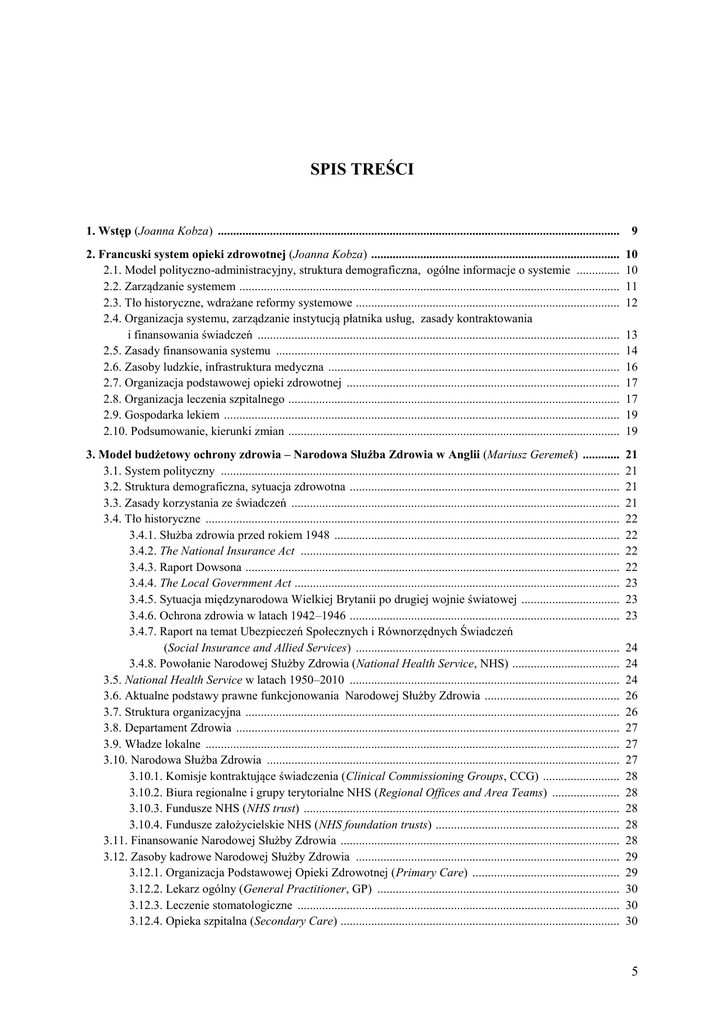 SPIS TREŚCI 1. Wstęp (Joanna Kobza) ................................................................................................................................... 9 2. Francuski system opieki zdrowotnej (Joanna Kobza) ................................................................................. 2.1. Model polityczno-administracyjny, struktura demograficzna, ogólne informacje o systemie .............. 2.2. Zarządzanie systemem ............................................................................................................................ 2.3. Tło historyczne, wdrażane reformy systemowe ...................................................................................... 2.4. Organizacja systemu, zarządzanie instytucją płatnika usług, zasady kontraktowania i finansowania świadczeń ...................................................................................................................... 2.5. Zasady finansowania systemu ................................................................................................................ 2.6. Zasoby ludzkie, infrastruktura medyczna ............................................................................................... 2.7. Organizacja podstawowej opieki zdrowotnej ......................................................................................... 2.8. Organizacja leczenia szpitalnego ............................................................................................................ 2.9. Gospodarka lekiem ................................................................................................................................. 2.10. Podsumowanie, kierunki zmian ............................................................................................................ 10 10 11 12 3. Model budżetowy ochrony zdrowia – Narodowa Służba Zdrowia w Anglii (Mariusz Geremek) ............ 3.1. System polityczny .................................................................................................................................. 3.2. Struktura demograficzna, sytuacja zdrowotna ........................................................................................ 3.3. Zasady korzystania ze świadczeń ........................................................................................................... 3.4. Tło historyczne ....................................................................................................................................... 3.4.1. Służba zdrowia przed rokiem 1948 ............................................................................................. 3.4.2. The National Insurance Act ........................................................................................................ 3.4.3. Raport Dowsona .......................................................................................................................... 3.4.4. The Local Government Act .......................................................................................................... 3.4.5. Sytuacja międzynarodowa Wielkiej Brytanii po drugiej wojnie światowej ................................ 3.4.6. Ochrona zdrowia w latach 1942–1946 ........................................................................................ 3.4.7. Raport na temat Ubezpieczeń Społecznych i Równorzędnych Świadczeń (Social Insurance and Allied Services) ...................................................................................... 3.4.8. Powołanie Narodowej Służby Zdrowia (National Health Service, NHS) ................................... 3.5. National Health Service w latach 1950–2010 ........................................................................................ 3.6. Aktualne podstawy prawne funkcjonowania Narodowej Służby Zdrowia ............................................ 3.7. Struktura organizacyjna .......................................................................................................................... 3.8. Departament Zdrowia ............................................................................................................................. 3.9. Władze lokalne ....................................................................................................................................... 3.10. Narodowa Służba Zdrowia ................................................................................................................... 3.10.1. Komisje kontraktujące świadczenia (Clinical Commissioning Groups, CCG) ......................... 3.10.2. Biura regionalne i grupy terytorialne NHS (Regional Offices and Area Teams) ...................... 3.10.3. Fundusze NHS (NHS trust) ....................................................................................................... 3.10.4. Fundusze założycielskie NHS (NHS foundation trusts) ............................................................ 3.11. Finansowanie Narodowej Służby Zdrowia ........................................................................................... 3.12. Zasoby kadrowe Narodowej Służby Zdrowia ...................................................................................... 3.12.1. Organizacja Podstawowej Opieki Zdrowotnej (Primary Care) ................................................ 3.12.2. Lekarz ogólny (General Practitioner, GP) ............................................................................... 3.12.3. Leczenie stomatologiczne ......................................................................................................... 3.12.4. Opieka szpitalna (Secondary Care) ........................................................................................... 21 21 21 21 22 22 22 22 23 23 23 13 14 16 17 17 19 19 24 24 24 26 26 27 27 27 28 28 28 28 28 29 29 30 30 30 5 3.13. Gospodarka lekiem ...........................................................................................