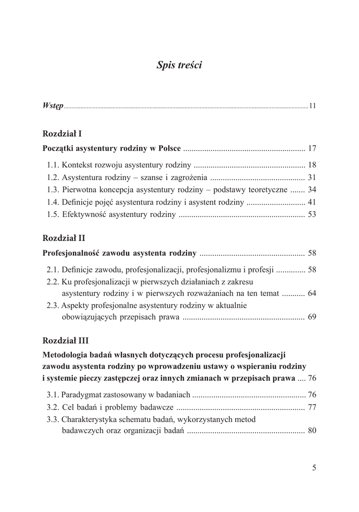 Spis treści Wstęp ................................................................................................................................................................ 11 Rozdział I Początki asystentury rodziny w Polsce .......................................................... 17 1.1. Kontekst rozwoju asystentury rodziny ..................................................... 18 1.2. Asystentura rodziny – szanse i zagrożenia ............................................. 31 1.3. Pierwotna koncepcja asystentury rodziny – podstawy teoretyczne ....... 34 1.4. Definicje pojęć asystentura rodziny i asystent rodziny ............................ 41 1.5. Efektywność asystentury rodziny ............................................................ 53 Rozdział II Profesjonalność zawodu asystenta rodziny .................................................. 58 2.1. Definicje zawodu, profesjonalizacji, profesjonalizmu i profesji .............. 58 2.2. Ku profesjonalizacji w pierwszych działaniach z zakresu asystentury rodziny i w pierwszych rozważaniach na ten temat ........... 64 2.3. Aspekty profesjonalne asystentury rodziny w aktualnie obowiązujących przepisach prawa .......................................................... 69 Rozdział III Metodologia badań własnych dotyczących procesu profesjonalizacji zawodu asystenta rodziny po wprowadzeniu ustawy o wspieraniu rodziny i systemie pieczy zastępczej oraz innych zmianach w przepisach prawa .... 76 3.1. Paradygmat zastosowany w badaniach ...................................................... 76 3.2. Cel badań i problemy badawcze ............................................................. 77 3.3. Charakterystyka schematu badań, wykorzystanych metod badawczych oraz organizacji badań ........................................................ 80 5 Rozdział IV Idea asystentury rodziny ................................................................................ 89 4.1. Rozumienie pojęcia asystent rodziny oraz nakreślenie jego roli przez osoby wykonujące ten zawód ........................................................ 90 4.2. Definiowanie pojęcia asystentura rodziny oraz nakreślenie roli asystenta rodziny w standardach świadczenia asysty rodzinnej ............ 96 4.3. Realizacja idei asystentury rodziny po wprowadzeniu ustawy w opinii osób uczestniczących w badaniach .......................................... 103 4.4. Czynniki utrudniające realizację asystentury zgodnie z jej pierwotnym rozumieniem .................................................................... 108 4.5. Proces tworzenia się tożsamości zawodowej ........................................ 114 Rozdział V Kwalifikacje, motywacje i predyspozycje do wykonywania zawodu asystenta rodziny ........................................................................................... 120 5.1. Kwalifikacje asystenta rodziny ............................................................. 120 5.2. Motywy wyboru zawodu asystenta rodziny ............................................ 125 5.3. Predyspozycje do wykonywania zawodu asystenta rodziny ................. 133 5.4. Powody rezygnacji z zatrudnienia w zawodzie asystent rodziny ....... 137 5.5. Samoocena asystenta rodziny dotycząca poziomu realizacji zadań profesji oraz rozwoju zawodowego ..................................................... 142 Rozdział VI Rodzina z wieloma problemami – odbiorca wsparcia asystenta rodziny ... 151 6.1. Charakterystyka rodzin wspieranych przez asystenta rodziny ............ 151 6.2. Rodzina jak źródło zasobów ................................................................. 160 6.3. Oczekiwania osób wspieranych wobec asystenta rodziny oraz stopień ich realizacji w opinii i deklaracjach asystentów rodziny biorących udział w badaniu ..................................................................................... 166 6 Rozdział VII Funkcje, zakres obowiązków i obszar działania asystenta rodziny w kontekście zadań innych służb społecznych pracujących z rodziną i na jej rzecz .................................................................................................. 172 7.1. Zadania asystenta rodziny .................................................................... 7.2. Asystent rodziny a pracownik socjalny ................................................ 7.3. Interwencja w sytuacji zagrożenia bezpieczeństwa dzieci i innych członków rodziny ................................................................................... 7.4. Asystent rodziny a kurator sądowy ...................................................... 7.5. Asystent rodziny a opiekunka .............................................................. 7.6. Asystent rodziny a psychoterapeuta ..................................................... 7.7. Asystent rodziny a koordynator pieczy zastępczej ............................ 7.8. Katalog usług asystenta rodziny .......................................................... 7.9. Łączenie ról zawodowych .................................................................... 7.10. Współpraca z innymi służbami społecznymi ..................................... 172 176 187 197 199 200 202 203 207 209 Rozdział VIII Metodyka pracy asystenta rodziny ............................................................. 215 8.1. Modele pracy socjalno-wychowawczej z elementami terapii ............. 8.2. Etapy udzielania asysty rodzinnej ......................................................... 8.3. Metody i techniki pracy z rodziną ....................................................... 8.4. Zmiany we własnym metodycznym działaniu deklarowane przez asystentów rodziny ............................................................................... 215 219 222 228 Rozdział IX Organizacja pracy asystenta rodziny ......................................................... 245 9.1. Asystentura rodziny w ośrodku pomocy społecznej a w or