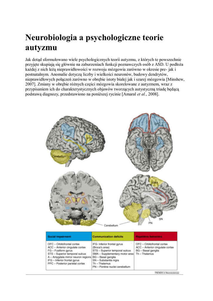Neurobiologia a psychologiczne teorie autyzmu Jak dotąd sformułowano wiele psychologicznych teorii autyzmu, z których te powszechnie przyjęte skupiają się głównie na zaburzeniach funkcji poznawczych osób z ASD. U podłoża każdej z nich leżą nieprawidłowości w rozwoju mózgowia zarówno w okresie pre- jak i postnatalnym. Anomalie dotyczą liczby i wielkości neuronów, budowy dendrytów, nieprawidłowych połączeń zarówno w obrębie istoty białej jak i szarej mózgowia [Minshew, 2007]. Zmiany w obrębie różnych części mózgowia skorelowane z autyzmem, wraz z przypisaniem ich do charakterystycznych objawów tworzących autystyczną triadę będącą podstawą diagnozy, przedstawiono na poniższej rycinie [Amaral et al., 2008]. Psychologiczne teorie autyzmu Poniżej wymieniono z nazw kilka głównych teorii psychologicznych, tłumaczących deficyty występujące u pacjentów z grupy autystycznego spektrum. Teoria Umysłu mówi o wrodzonych, lokalizowanych w płatach czołowych zaburzeniach tworzenia reprezentacji umysłowych odnoszących się do stanów umysłu i emocji innych ludzi [Pisula, 2002; Volkmar et al., 2005]. Teoria Centralnej Koherencji mówi o zaburzeniach integracji informacji i odczytywania ich znaczenia z kontekstu [Pisula, 2002; Volkmar et al., 2005]. Teoria Deficytów Funkcji Wykonawczych, czyli adekwatnych planów czynności w celu osiągnięcia celu, które objawiają się sztywnością zachowania, perseweracjami, koncentracją na detalach, trudnościami w przenoszeniu uwagi i wykorzystywaniu informacji zwrotnych oraz ignorowania informacji nieistotnej, impulsywnością tudzież trudnościami w planowaniu i realizacji planu. Teoria polisensoryczna Delacato mówi o zaburzeniach integracji sensorycznej u osób z autyzmem. Sensoryzmy, czyli przejawy tych zaburzeń, mogą wynikać z nadwrażliwości sensorycznej, niedowrażliwości danego zmysłu bądź tzw. białego szumu, czyli powstawania wrażeń zmysłowych bez udziału bodźców ze środowiska [Delacato, 1999]. Wczesne oznaki 8-10 miesiąc życia - brak reakcji na imię 12 miesiąc - brak wskazywania 12 miesiąc - brak tworzenia wspólnego pola uwagi 12 miesiąc - zaburzona synchronia emocjonalna z rodzicami 12 miesiąc - zaburzony kontakt wzrokowy 12 miesiąc - brak właściwej mimiki 12 miesiąc - krótki czas patrzenia na ludzi 12 miesiąc - brak uśmiechu w sytuacjach społecznych 12 miesiąc - niewłaściwe reakcje emocjonalne 12 miesiąc - pasywność w czasie interakcji Dziedziczenie Autyzm (MIM 209850) to zaburzenie o nieznanym mechanizmie patogenezy i złożonej, wieloczynnikowej etiologii [Volkmar et al., 2005]. Na heterogenny charakter przyczyn autyzmu wskazuje również bardzo duże kliniczne zróżnicowanie pacjentów. Nie wyodrębniono dotychczas żadnego biologicznego markera autyzmu, który ułatwiałby lub determinował diagnozę. Szereg badań bliźniąt (twin studies) oraz rodzin (family studies) wykazały znaczący udział czynników genetycznych w etiologii autyzmu. Współwystępowanie autyzmu u bliźniąt monozygotycznych występuje na poziomie ok. 64%, u dizygotycznych na poziomie ok. 5-8% , natomiast u rodzeństwa wynosi ok. 3% [Volkmar et al., 2005], czyli zdecydowanie częściej niż w populacji (0,1%). Wyznaczono również tzw. ,,broader phenotype’’, który polega na występowaniu u członków rodziny (u ok. 12-20% [Volkmar et al., 2005]) niektórych deficytów związanych z autyzmem (głównie społecznych i poznawczych), które nie tworzą pełnego zaburzenia [Schellenberg et al., 2006]. Klasyfikacja ICD-10 ICD-10 (International Classification of Diseases) to Międzynarodowa Statystyczna Klasyfikacja Chorób i Problemów Zdrowotnych. Zaburzenia autystycznego spektrum znajdują się w podgrupie Całościowych zaburzeń rozwojowych grupy Zaburzeń rozwoju psychicznego. F84 Całościowe zaburzenia rozwojowe F84.0 Autyzm dziecięcy F84.1 Autyzm atypowy F84.2 Zespół Retta F84.3 Inne dziecięce zaburzenia dezintegracyjne F84.4 Zaburzenie hiperkinetyczne z towarzyszącym upośledzeniem umysłowym i ruchami stereotypowymi F84.5 Zespół Aspergera F84.8 Inne całościowe zaburzenia rozwojowe F84.9 Całościowe zaburzenia rozwojowe, nieokreślone Źródło WWW.autyzm.wum.edu.pl