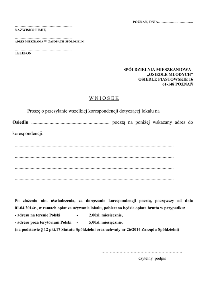 POZNAŃ, DNIA……………. ………….. ………………………………………….. NAZWISKO I IMIĘ ………………………………………….. ADRES MIESZKANIA W ZASOBACH SPÓŁDZIELNI …………………………………………. TELEFON SPÓŁDZIELNIA MIESZKANIOWA „OSIEDLE MŁODYCH” OSIEDLE PIASTOWSKIE 16 61-148 POZNAŃ WNIOSEK Proszę o przesyłanie wszelkiej korespondencji dotyczącej lokalu na Osiedlu ................................................................ pocztą na poniżej wskazany adres do korespondencji. .................................................................................................................................. .................................................................................................................................. .................................................................................................................................. .................................................................................................................................. Po złożeniu nin. oświadczenia, za doręczanie korespondencji pocztą, począwszy od dnia 01.04.2014r., w ramach opłat za używanie lokalu, pobierana będzie opłata brutto w przypadku: - adresu na terenie Polski - 2,00zł. miesięcznie, - adresu poza terytorium Polski - 5,00zł. miesięcznie. (na podstawie § 12 pkt.17 Statutu Spółdzielni oraz uchwały nr 26/2014 Zarządu Spółdzielni) …………………………………………………. czytelny podpis