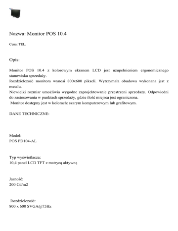 Nazwa: Monitor POS 10.4 Cena: TEL. Opis: Monitor POS 10.4 z kolorowym ekranem LCD jest uzupełnieniem ergonomicznego stanowiska sprzedaży. Rozdzielczość monitora wynosi 800x600 pikseli. Wytrzymała obudowa wykonana jest z metalu. Niewielki rozmiar umożliwia wygodne zaprojektowanie przestrzeni sprzedaży. Odpowiedni do zastosowania w punktach sprzedaży, gdzie ilość miejsca jest ograniczona. Monitor dostępny jest w kolorach: szarym komputerowym lub grafitowym. DANE TECHNICZNE: Model: POS PD104-AL Typ wyświetlacza: 10,4 panel LCD TFT z matrycą aktywną Jasność: 200 Cd/m2 Rozdzielczość: 800 x 600 SVGA@75Hz Kontrast: 200:1 Rozmiar plamki: 0.264 mm pozioma × 0.264 mm pionowa Podświetlenie: system krawędziowy CCFL Interfejs: analogowy RGB 0.7V Peak to Peak 15 Pin Mini D-sub Regulacja cyfrowa (OSD): tak Pobór mocy: 20W Zasilanie: zasilacz zewnętrzny 36 W Wymiary: głębokość: 143 mm, szerokość: 234 mm, wysokość: 274 mm Waga: 2,3 kg Mocowanie: wspornik ścienny (VESA 75), ramię sztywne, ramię regulowane Bezpieczeństwo: zgodny z normami CE, FCC, TUV-GS, UL Gwarancja: 12 miesięcy Wszystkie podane ceny, są cenami netto do których należy doliczyć podatek VAT. Cennik nie stanowi oferty handlowej w rozumieniu art. 66 par.1 Kodeksu Cywilnego
