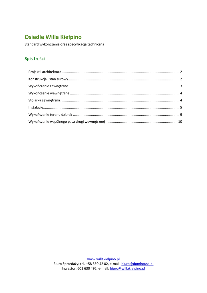 Osiedle Willa Kiełpino Standard wykończenia oraz specyfikacja techniczna Spis treści Projekt i architektura........................................................................................................................... 2 Konstrukcja i stan surowy.................................................................................................................... 2 Wykończenie zewnętrzne.................................................................................................................... 3 Wykończenie wewnętrzne .................................................................................................................. 4 Stolarka zewnętrzna ............................................................................................................................ 4 Instalacje.............................................................................................................................................. 5 Wykończenie terenu działek ............................................................................................................... 9 Wykończenie wspólnego pasa drogi wewnętrznej ........................................................................... 10 www.willakielpino.pl Biuro Sprzedaży: tel. +58 550 42 02, e-mail: [email protected] Inwestor: 601 630 492, e-mail: [email protected] PROJEKT I ARCHITEKTURA Domy osiedla „Willa Kiełpino” zaprojektowane zostały przez doświadczonych architektów z pracowni CKK Architekci w Gdyni. Została opracowana i złożona, dokładna dokumentacja architektoniczna i wykonawcza każdego z szesnastu domów wraz z wizualizacjami elewacji, rzutami poziomymi. Zastosowane rozwiązania są przemyślane, ponadczasowe i gwarantują Państwu komfortowe warunki zamieszkania przy niskich kosztach użytkowania. Na wyjątkowość projektów składa się: atrakcyjna i nowoczesna architektura z pełnej wysokości kondygnacją I piętra (bez ścian kolankowych i skosów), poddasze są nieużytkowe, ale z możliwością zagospodarowania, komfortowe, dwu lub trzykondygnacyjne wille (w zależności od ukształtowania terenu), o powierzchni użytkowej od 280 do 300 m2, dwa wygodne stanowiska w garażu, instalacja kominkowa umożliwiająca aranżację kominka wewnętrznego i zewnętrznego, duże, wygodne tarasy i podcienie, duże przestronne działki, powyżej 1250 m2, usytuowane w przepięknej okolicy bezpośrednio przy lesie, wykończona i dobrze zagospodarowana przestrzeń wspólna osiedla, zastosowanie materiałów wykończeniowych i urządzeń technicznych najwyższej jakości, ogrodzenia posesji od strony ulicy wewnętrznej pokryte klinkierem i kamieniem z ażurowymi metalowymi wypełnieniami. KONSTRUKCJA I STAN SUROWY Zastosowane technologie budowy gwarantują najwyższą jakość i komfort użytkowania domów: sprawdzona, tradycyjna technologią budowy ścian zewnętrznych i wewnętrznych z bloczków klasy YTONG ocieplanych styropianem i wełną w technologii ściany trójwarstwowej, stopy i ławy fundamentowe żelbetowe monolityczne, wylewane na miejscu budowy, ściany zewnętrzne do wysokości 35cm nad poziomem gruntu wymurowane z bloczków betonowych grubości 24 cm z izolacją przeciwwodną oraz ocieplone styropianem XPS 30 o grubości 10 cm, ściany zewnętrzne z gazobetonu o grubości 24 cm na zaprawie cementowo – wapiennej ocieplone ponadstandardowo styropianem o grubości 16 cm pod płytkami klinkierowymi i tynkiem, 12 cm pod okładziną kamienną oraz wełną mineralną o grubości 12 cm pod drewnem elewacyjnym, kominy systemowe firmy Shiedel, www.willakielpino.pl Biuro Sprzedaży: tel. +58 550 42 02, e-mail: [email protected] Inwestor: 601 630 492, e-mail: [email protected] izolacja termiczna stropu (poddasze nieużytkowe) nad kondygnacją użytkową – wełna mineralna 15cm, ściany wewnętrzne nośne z gazobetonu 24cm na zaprawie cementowo – wapiennej, ściany wewnętrzne działowe z gazobetonu 12 cm na zaprawie cementowo – wapiennej, dach wielospadowy o kącie nachylenia połaci 25°, o konstrukcji drewnianej, pokryty płytą OSB oraz folią. WYKOŃCZENIE ZEWNĘTRZNE Wykończenie elewacji wszystkich budynków: tynk silikatowo-silikonowy CT 174 2,0 mm firmy Ceresit-Henkel, kolor SV1 – gwarancja firmy Henkel – 8 lat, płytki klinkierowe holenderskiej firmy Elastolith, cokoły, słupy, słupki na tarasach oraz fragmenty ścian wykończone kamieniem elewacyjnym, wysokiej jakości drewno elewacyjne, parapety zewnętrzne podokienne oraz parapety elewacyjne (odcinające różne materiały elewacyjne), czapy na słupach i murkach wykonane są z granitu polerowanego Tiger Skin Yellow o grubości 3 cm. Dach: dachówka betonowa firmy BRASS w kolorze grafitowym o podwyższonej jakości i gładkości (technologia CISAR), opierzenia i obróbki blacharskie z blachy ocynkowanej powlekanej, orynnowanie renomowanej firmy LINDAB: o rynny Ø120mm, o rury spustowe Ø100mm. Schody zewnętrzne w domach trójkondygnacyjnych: konstrukcja żelbetonowa, stopnie obłożone granitem o grubości 3 cm, podstopnie obłożone granitem o grubości 2 cm. Wykończenie tarasów zewnętrznych na piętrze i na gruncie oraz spoczników schodów zewnętrznych: zbrojone i izolowane płyty posadzkowe, obłożenie płytami granitowymi Padang Light o grubości 1 cm, tarasy na piętrze wykończone są obróbką blacharską systemową z aluminium. www.willakielpino.pl Biuro Sprzedaży: tel. +58 550 42 02, e-mail: [email protected] Inwestor: 601 630 492, e-mail: [email protected] Balustrady tarasowe i schodowe zewnętrzne: wykonane ze stali ocynkowanej trzykrotnie malowanej, drewniane pochwyty. Oświetlenie zewnętrzne domów: każdy z typów domów posiada oświetlenie zewnętrzne - w zależności od typu domu jest to od 8 do 12 lamp tarasowych lub elewacyjnych, wszystkie lampy są energooszczędne i wyposażone w wyłącznik zmierzchowy. WYKOŃCZENIE WEWNĘTRZNE w pomieszczeniach mieszkalnych ściany i sufity pokryte