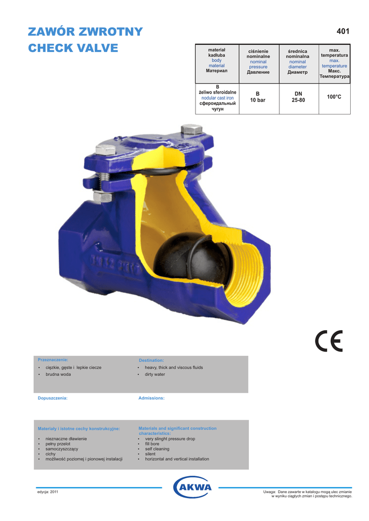 ZAWÓR ZWROTNY CHECK VALVE Przeznaczenie: 401 materiał kadłuba body material Материал ciśnienie nominalne nominal pressure Давление średnica nominalna nominal diameter Диаметр max. temperatura max. temperature Макс. Температура B żeliwo sferoidalne nodular cast iron сфероидальный чугун B 10 bar DN 25-80 100°C Destination: · cięzkie, gęste i lepkie ciecze · heavy, thick and viscous fluids · brudna woda · dirty water Назначение: Dopuszczenia: Admissions: Допущено: Materiały i istotne cechy konstrukcyjne: Materials and significant construction characteristics: · very slinght pressure drop · fill bore · self cleaning · silent · horizontal and vertical installation Maтериалы и констуктивные особенности: · · · · · nieznaczne dławienie pełny przelot samoczyszczący cichy możliwość poziomej i pionowej instalacji edycja: 2011 Uwaga: Dane zawarte w katalogu mogą ulec zmianie w wyniku ciągłych zmian i postępu technicznego. 401 MATERIAŁY / MATERIALS / МАТЕРИАЛЫ 5 2 4 3 1 materiał kadłuba / body material / Материал wykonanie / type / Исполнение B 55 1 kadłub/ body / корпус EN- GJS- 400-15 JS 1030 2 pokrywa/ cover / крышка EN- GJS- 400-15 JS 1030 3 kula / ball 4 pierścień / O - ring 5 śruba / bolt aluminium pokryte NBR aluminium NBR covered NBR AISI 304 max. temperatura/ max. temperature / макс. температура * na zapytanie/ on request / по запросу 100oC max. temperatura/ max. temperature / макс. температура 120°C Zakład Produkcyjny Armatury Przemysłowej AKWA Sp. z o.o. Uwaga: Dane zawarte w katalogu mogą ulec zmianie w wyniku ciągłych zmian i postępu technicznego. 401 WYMIARY / DIMENSIONS / РАЗМЕРЫ DN A B C mm E Kvs kg mm 25 48 100 101 118 - 1,5 32 50 107 105 135 24 2,0 40 60 112 120 142 54 2,7 50 70 140 132 175 70 3,5 65 90 170 157 195 115 5,0 80 105 197 180 238 185 7,6 Zakład Produkcyjny Armatury Przemysłowej AKWA Sp. z o.o. Uwaga: Dane zawarte w katalogu mogą ulec zmianie w wyniku ciągłych zmian i postępu technicznego. 401 WYKONANIA / TYPES / ИСПОЛНЕНИЯ materiał kadłuba body material Материал корпуса figura figure Фигура średnica nominalna nominal diameter Диаметр DN B żeliwo sferoidalne nodular cast iron сфероидальный чугун EN-GJS-400-15 401 ciśnienie nominalne nominal pressure Давление PN wykonanie type Исполнение 55 25-80 B mm 16bar Tmax 100 °C kula stalowa gumowana zamkniecie NBR/żeliwo epoksydowane metal NBR covered ball metal/NBR seat epoxy paint 401 ZAMAWIANIE / ORDERING / ЗАКАЗ Uprasza się o zamawianie produktu wg indeksu To place an order please use our product number (index) Чтобы сделать заказ используйте наше обозначения figura figure Фигура materiał kadłuba body material Материал корпуса średnica nominalna nominal diameter Диаметр DN ciśnienie nominalne nominal pressure Давление PN wykonanie type Исполнение 401 B 032 B 55 PRZYKŁAD ZAMÓWIENIA / ORDER EXAMPLE / ПРИМЕР ЗАКАЗА zawór zwrotny, przyłącze gwintowane, kształt skośny / check valves, ends threaded, form Y-type żeliwo sferoidalne / nodular cast iron EN-GJS-400-15 średnica nominalna / nominal diameter DN32 ciśnienie nominalne / nominal pressure PN10 kula stalowa gumowana zamknięcie żeliwo/NBR metal NBR covered ball metal/NBR seat Zakład Produkcyjny Armatury Przemysłowej AKWA Sp. z o.o. 401 B 032 B 55 401 B 032 B 55 Uwaga: Dane zawarte w katalogu mogą ulec zmianie w wyniku ciągłych zmian i postępu technicznego.