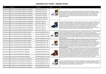 ŻARÓWKI EXO TERRA - ZMIANA NAZW symbol stara nazwa nowa nazwa 100-722100-00 SUN-GLO T10/15W ŻARÓWKA DZIENNA DO TERRARIÓW DAYTIME HEAT LAMP 15W 100-722102-00 SUN-GLO T10/25W ŻARÓWKA DZIENNA DO TERRARIÓW DAYTIME HEAT LAMP 25W 100-722104-00 SUN-GLO T10/40W ŻARÓWKA DZIENNA DO TERRARIÓW DAYTIME HEAT LAMP 40W 100-722110-00 SUN-GLO A19/60W ŻARÓWKA DZIENNA DO TERRARIÓW DAYTIME HEAT LAMP 60W 100-722112-00 SUN-GLO A21/100W ŻARÓWKA DZIENNA DO TERRARIÓW DAYTIME HEAT LAMP 100W 100-722114-00 SUN-GLO A21/150W ŻARÓWKA DZIENNA DO TERRARIÓW DAYTIME HEAT LAMP 150W 100-722120-00 NIGHT-GLO T10/15W ŻARÓWKA NOCNA DO TERRARIÓW NIGHT HEAT LAMP 15W 100-722122-00 NIGHT-GLO T10/25W ŻARÓWKA NOCNA DO TERRARIÓW NIGHT HEAT LAMP 25W 100-722124-00 NIGHT-GLO T10/40W ŻARÓWKA NOCNA DO TERRARIÓW NIGHT HEAT LAMP 40W 100-722126-00 NIGHT-GLO A19/50W ŻARÓWKA NOCNA DO TERRARIÓW NIGHT HEAT LAMP 50W 100-722130-00 NIGHT-GLO A19/75W ŻARÓWKA NOCNA DO TERRARIÓW NIGHT HEAT LAMP 75W 100-722131-00 SUN-GLO NEODYMIUM R20/50W-ŻARÓWKA DZIENNA DAYLIGHT BASKING SPOT 50W 100-722132-00 SUN-GLO NEODYMIUM R20/75W ŻARÓWKA DZIENNA DAYLIGHT BASKING SPOT 75W 100-722133-00 SUN-GLO NEODYMIUM R25/100W ŻARÓWKA DZIENNA DAYLIGHT BASKING SPOT 100W 100-722134-00 SUN-GLO NEODYMIUM R30/150W ŻARÓWKA DZIENNA DAYLIGHT BASKING SPOT 150W 100-722135-00 SUN-GLO TIGHT BEAM S20/50W ŻARÓWKA DZIENNA INTENSE BASKING SPOT 50W 100-722136-00 SUN-GLO TIGHT BEAM S20/75W ŻARÓWKA DZIENNA INTENSE BASKING SPOT 75W 100-722138-00 SUN-GLO TIGHT BEAM S25/100W ŻARÓWKA DZIENNA INTENSE BASKING SPOT 100W 100-722140-00 SUN-GLO TIGHT BEAM S30/150W ŻARÓWKA DZIENNA INTENSE BASKING SPOT 150W 100-722141-00 HEAT-GLO R20/50W ŻARÓWKA DO TERRARIÓW INFRARES BASKING SPOT 50W 100-722142-00 HEAT-GLO R20/75W ŻARÓWKA DO TERRARIÓW INFRARES BASKING SPOT 75W 100-722144-00 HEAT-GLO R25/100W ŻARÓWKA DO TERRARIÓW INFRARES BASKING SPOT 100W 100-722146-00 HEAT-GLO R30/150W ŻARÓWKA DO TERRARIÓW INFRARES BASKING SPOT 150W 100-722180-00 EXO TERRA SUN GLO 35W-ŻARÓWKA HALOGENOWA HALOGEN BASKING SPOT 35W 100-722181-00 EXO TERRA SUN GLO 50W-ŻARÓWKA HALOGENOWA HALOGEN BASKING SPOT 50W 100-722182-00 EXO TERRA SUN GLO 75W-ŻARÓWKA HALOGENOWA HALOGEN BASKING SPOT 75W 100-722183-00 EXO TERRA SUN GLO 100W-ŻARÓWKA HALOGENOWA HALOGEN BASKING SPOT 100W 100-722184-00 EXO TERRA SUN GLO 150W-ŻARÓWKA HALOGENOWA HALOGEN BASKING SPOT 150W zdjęcie opis Dzienna żarówka do terrarium, o szerokim spektrum światła - Kreuje ciepło dla termoregulacji - Podnosi temperaturę powietrza - Stymuluje naturalne zachowanie dzięki promieniom UVA - Może zostać połączona z żarówką Night Heat Lamp (Night Glo) lub Intense Basking Spot (Heat Glo) o dla 24-godzinnego cyklu Dzienna żarówka z tuleją z neodymem. Spektrum jest idealne dla fotosyntezy roślin, a promienie UVA zapewniają dobre samopoczucie gadów. Ciepło emitowane przez tą żarówkę pozwala na zwiększenie temperatury w terrarium. Stymuluje naturalne światło księżyca - Idealna dla obserwacji terrarium w nocy - Zapewnia tropikalne nocne temperatury - Stymuluje zachowania rozrodcze u gadów i płazów - Może zostać połączona z żarówką Repti Glo lub lub Day Glo dla 24-godzinnego cyklu Żarówka symuluje naturalne światło księżyca, dzięki czemu możliwa jest obserwacja mieszkańców terrarium nocą, bez zakłócania ich dziennego i nocnego cyklu. Emitowane światło jest niebieskawe dzięki użyciu do produkcji żarówki niebieskiego szkła. Ciepło generowane przez żarówkę jest minimalne, jednak wystarczające do zapewnienia tropikalnych temperatur nocnych. Mniejsza moc w watach nie koliduje z naturalnymi spadkami temperatur w nocy. Dzienna Żarówka z grzejącym reflektorem punktowym - Dzienna żarówka do terrarium, o szerokim spektrum światła - Podnosi temperaturę powietrza - Tworzy podgrzewane miejsca ważne dla termoregulacji Stymuluje zachowania rozrodcze u gadów dzięki promieniom UVA - Może zostać połączona z żarówką Night Heat Lamp (Night Glo) lub Intense Basking Spot (Heat Glo) dla 24-godzinnego cyklu Dzienna żarówka z neodymem, o szerokim spektrum działania. Spektrum jest idealne dla fotosyntezy roślin, a promienie UVA zapewniają dobre samopoczucie gadów. Reflektor punktowy pozwala na skierowanie oświetlenia na wybrane miejsce w terrarium. Dzienna Żarówka z grzejącym reflektorem punktowym i skupionym promieniem - 35% wzrost poziomu światła i ciepła w promieniu - Tworzy podgrzewane miejsca ważne dla termoregulacji - Stymuluje zachowania rozrodcze u gadów dzięki promieniom UVA - Może zostać połączona z żarówką Night Heat Lamp (Night Glo) lub Intense Basking Spot (Heat Glo) dla 24-godzinnego cyklu Lampa ta została specjalnie zaprojektowana jako lampa z grzejącym światłem punktowym. Skupiony promień może zostać skierowany dokładnie na określoną powierzchnię. Poziom światła i ciepła został zwiększony o 35%, by umożliwić większą odległość pomiędzy żarówką a miejsce wygrzewania. Promienie UVA zapewniają dobre samopoczucie gadów. Żarówka grzejąca z podczerwienią - Emituje grzejące fale podczerwieni - Doskonałe źródło 24-godzinnego promieniowania ciepła - Podwyższa temperaturę w całym terrarium - Dostarcza ciepła niezbędnego dla aktywności i trawienia - Nie zakłóci normalnego cyklu aktywności - Idealna do obserwacji terrarium w nocy Może zostać połączona z żarówką Repti Glo lub lub Day Glo dla 24-godzinnego cyklu Żarówka emituje grzejące fale podczerwieni i jest typową lampą grzejącą. Ma specjalnie wbudowany reflektor, aby możliwe było skierowanie ciepła w dowolnym kierunku w terrarium. Czerwone szkło przekazuje fale podczerwieni, które wytwarzane są przez specjalne żarnik żarówki. Czerwonawe światło nie zakłóci, ani nocą ani w ciągu dnia, naturalnej aktywności gadów, dzięki czemu stanowi doskonałe źródło ciepła na 24 godziny. wysoce - wydajna energetyczna żarówka o spe