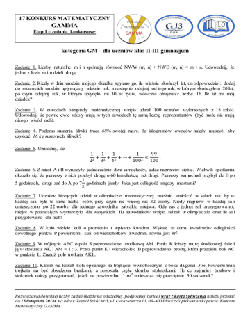 17 KONKURS MATEMATYCZNY GAMMA Etap I – zadania konkursowe kategoria GM – dla uczniów klas II-III gimnazjum Zadanie 1. Liczby naturalne m i n spełniają równość NWW (m, n) + NWD (m, n) = m + n. Udowodnij, że jedna z liczb m i n dzieli drugą. Zadanie 2. Kiedy w dniu urodzin mojego dziadka spytano go, ile właśnie skończył lat, on odpowiedział: dodaj do roku moich urodzin upływający właśnie rok, a następnie odejmij od tego rok, w którym skończyłem 20 lat, po czym odejmij rok, w którym upłynęło mi 30 lat życia, wówczas otrzymasz liczbę 16. Ile lat ma mój dziadek? Zadanie 3. W zawodach olimpiady matematycznej wzięło udział 100 uczniów wyłonionych z 15 szkół. Udowodnij, że pewne dwie szkoły mają w tych zawodach tę samą liczbę reprezentantów (być może nie mają nikogo wśród nich). Zadanie 4. Podczas suszenia śliwki tracą 68% swojej masy. Ile kilogramów owoców należy ususzyć, aby uzyskać 16 kg suszonych śliwek? Zadanie 5. Uzasadnij, że 1 1 1 1 99 + + + ⋯ + < . 22 32 42 1002 100 Zadanie 6. Z miast A i B wyruszyły jednocześnie dwa samochody, jadąc naprzeciw siebie. W chwili spotkania okazało się, że pierwszy z nich przebył drogę o 60 km dłuższą niż drugi. Pierwszy samochód przybył do B po 1 5 godzinach, drugi zaś do A po 7 godzinach jazdy. Jaka jest odległość między miastami? 2 Zadanie 7. Uczniów biorących udział w olimpiadzie matematycznej należało umieścić w salach tak, by w każdej sali była ta sama liczba osób, przy czym nie więcej niż 32 osoby. Kiedy najpierw w każdej sali umieszczono po 22 osoby, dla jednego zawodnika zabrakło miejsca. Gdy zaś z jednej sali zrezygnowa no, miejsc w pozostałych wystarczyło dla wszystkich. Ilu zawodników wzięło udział w olimpiadzie oraz ile sal przygotowano dla nich? Zadanie 8. W koło wielkie kuli o promieniu r wpisano kwadrat. Wykaż, że suma kwadratów odległośc i dowolnego punktu P powierzchni kuli od wierzchołków kwadratu równa jest 8r 2 . Zadanie 9. W trójkącie ABC o polu S poprowadzono środkową AM. Punkt K leżący na tej środkowej dzieli ją w stosunku AK : AM = 1 : 3. Przez punkt K i wierzchołek B poprowadzono prostą, która przecięła bok AC w punkcie L. Znajdź pole trójkąta AKL. Zadanie 10. Klomb ma kształt koła opisanego na trójkącie równobocznym o boku długości 3 m. Powierzchnia trójkąta ma być obsadzona bratkami, a pozostała część klombu stokrotkami. Ile co najmniej bratków i stokrotek należy przygotować, jeżeli na powierzchni 1 𝑚2 umieszcza się przeciętnie 30 sadzonek? Rozwiązania dowolnej liczby zadań (każde na oddzielnej, podpisanej kartce) wraz z kartą zgłoszenia należy przysłać do 15 listopada 2016r. na adres: Zespół Szkół Nr 3, ul. Łukasiewicza 11, 09-400 Płock z dopiskiem na kopercie: Konkurs Matematyczny GAMMA 17 KONKURS MATEMATYCZNY GAMMA Etap I – zadania konkursowe kategoria LO – dla uczniów klas I-II szkół ponadgimnazjalnych Zadanie 1. Technik drogowy przeprowadzający inspekcję torów Elektrycznej Kolei Dojazdowej (EKD) między Warszawą a Włochami, spostrzegł że pociągi nadchodzące z tyłu mijają go co 15 minut, a nadchodzące z przodu co 5 minut. Obliczyć co ile minut wychodzą pociągi ze swoich stacji końcowych i jaka jest ich średnia prędkość. Przyjąć, że zarówno pociągi EKD, jak i technik, poruszali się ruchem jednostajnym. Zadanie 2. Oblicz 3𝑎 𝑎 +𝑏 , jeśli wiesz, że 𝑎 +𝑏 𝑏 1 = 4. Zadanie 3. Udowodnij, że jeżeli liczby a, b, c są dodatnie oraz ab+bc+ca > a+b+c, to a+b+c > 3. Zadanie 4. Marysia i Janek są rodzeństwem. Marysia ma trzy razy więcej braci niż sióstr, a Janek ma o dwóch braci więcej niż sióstr. Ile jest dzieci w tej rodzinie? Zadanie 5. W zatoce jeziora są wbite dwa pale. Jeden pal wystaje nad wodę na wysokość 2 𝑚, drugi na wysokość 1𝑚. Odległość między palami wynosi 10 𝑚. Na każdym palu siedzi ptak czatujący na rybę. Prędkość lotu ptaka siedzącego na wyższym palu jest dwukrotnie większa od prędkości lotu ptaka siedzącego na niższym palu. Gdy na linii łączącej pale plusnęła ryba, ptaki zobaczyły ją jednocześnie i jednocześnie rzuciły się po zdobycz. W którym miejscu plusnęła ryba, jeżeli obydwa ptaki dopadły ją jednocześnie? Zadanie 6. Zbiornik na deszczówkę ma kształt walca o średnicy długości 90 cm. Właściciel zbiornika, aby chronić napełnioną beczkę przed zanieczyszczeniami, kupił płaską pokrywę w kształcie sześciokąta foremnego o boku długości 45 cm. Oceń, czy pokrywa była odpowiednia. Odpowiedź uzasadnij. Zadanie 7. Z naczynia o pojemności 64 litrów odlano część spirytusu i dodano tyleż wody, następnie odlano tyle samo litrów roztworu i w naczyniu pozostał roztwór o zawartości 49 litrów spirytusu. Ile litrów płynu odlano z naczynia za każdym razem? Zadanie 8. Z banku wzięto kredyt 15 000 zł przy stopie procentowej 30% w skali roku. Oblicz kwotę, jaką należy oddać do banku za 5 miesięcy, przyjmując, że kredyt ma być spłacony jednorazowo. Zadanie 9. Wyznacz wszystkie liczby całkowite 𝑛, dla których liczba 𝑛5 +3 𝑛2 +1 jest całkowita. Zadanie 10. Rozstrzygnij, czy liczba 322 + 5 ∙ 310 + 1 jest liczbą pierwszą. Rozwiązania dowolnej liczby zadań (każde na oddzielnej, podpisanej kartce) wraz z kartą zgłoszenia należy przysłać do 15 listopada 2016r. na adres: Zespół Szkół Nr 3, ul. Łukasiewicza 11, 09-400 Płock z dopiskiem na kopercie: Konkurs Matematyczny GAMMA