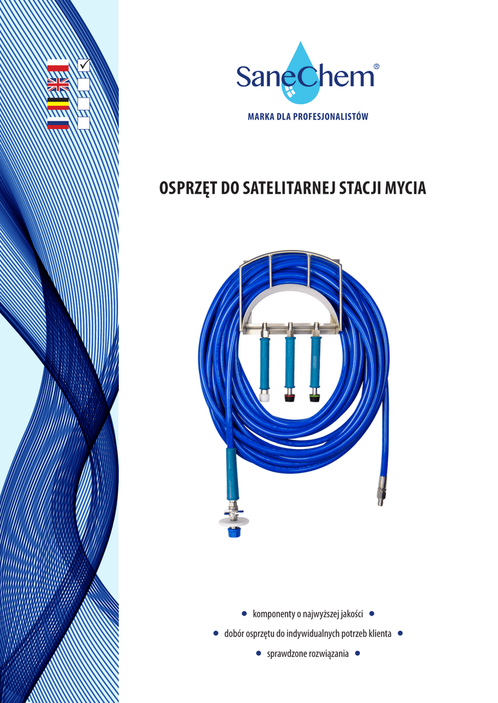 MARKA DLA PROFESJONALISTÓW OSPRZĘT DO SATELITARNEJ STACJI MYCIA komponenty o najwyższej jakości dobór osprzętu do indywidualnych potrzeb klienta sprawdzone rozwiązania Osprzęt do satelitarnej stacji mycia AKCESORIA SPECYFIKACJA 1 wąż ciśnieniowy PCV • 1/2”, ciśnienie pracy do 40 barów, temperatura do 70ºC • standard długości: 15 mb, 20 mb, 25 mb 2 przyłącze lancy • mocowanie ciśnieniowe z wężem i lancami za pomocą szybkozłącza • kołpak ochronny zabezpieczający przed uderzeniami • ręczny zawór odcinający (kulowy) 3 lance • Dostępne trzy rodzaje lanc: pianujące, dezynfekcyjne, płuczące • Osłona dyszy, w zależności od rodzaju zastosowania i parametrów, posiada znaczniki w odróżniających się kolorach • Standard długości lanc: 800 mm, 500 mm, 250 mm, 75 mm • Możliwość umieszczenia lanc na wieszakach gwarantuje uporządkowanie miejsca pracy • Możliwość wykonania na indywidualne zamówienie klienta, lanc o różnych długościach, wydajnościach oraz geometriach strumienia • Wykonane ze stali kwasoodpornej 4 wieszak na wąż i lance • montaż naścienny • wykonany ze stali kwasoodpornej 5 wieszak na lance • montaż naścienny • wykonany ze stali kwasoodpornej 6 wieszak na kanister 25 kg • montaż naścienny • wykonany ze stali kwasoodpornej 7 wieszak na kanister 5 kg • montaż naścienny • wykonany ze stali kwasoodpornej 8 uzbrojenie rurociągu do satelity mobilnego • mocowania ciśnieniowe z wężami przyłączeniowymi za pomocą szybkozłączy (szybkozłącze do rurociągu wodnego i powietrznego) 9 automatyczny zwijacz węża Nederman 886 • max. długość nawinięcia węża ciśnieniowego 25 mb • montaż naścienny • wykonany ze stali kwasoodpornej 10 automatyczny zwijacz węża S300 • max. długość nawinięcia węża ciśnieniowego 25 mb • montaż naścienny • wykonany ze stali kwasoodpornej ZDJĘCIE KUCHNIE ŚWIATA S.A. 01-708 Warszawa, ul. Słodowiec 10/10 Biuro Handlowe: 05-152 Czosnów, Łomna, ul. Gdańska 34 tel. +48(22)785-95-60, tel./fax +48(22)785-95-61 [email protected], [email protected] www.sanechem.com.pl