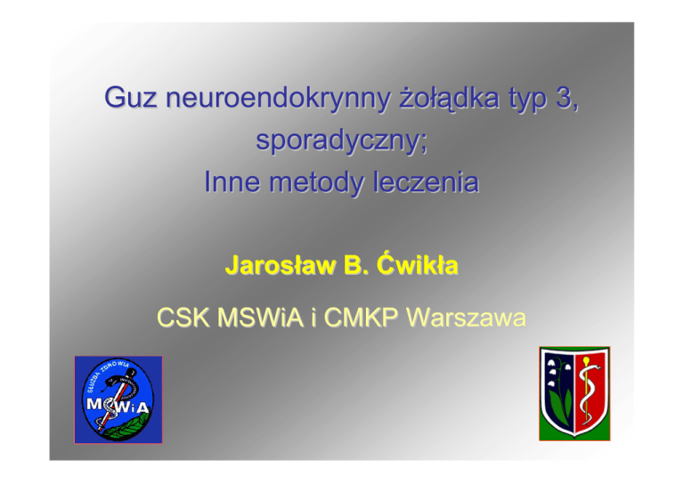 Guz neuroendokrynny żołądka typ 3, sporadyczny; Inne metody leczenia Jarosław B. Ćwikła CSK MSWiA i CMKP Warszawa Chemioterapia w rakach neuroendokrynnych żołądka Wskazania • Nieradykalność zabiegu operacyjnego; • Wznowa nowotworu po wcześniejszym leczeniu; • Wyjściowo zaawansowane stadium nowotworu; • Progresja (kliniczna i/lub biochemiczna, i/lub obrazowa); • Niepowodzenie lub nietolerancja innych metod terapii (analogi somatostatyny, terapia radioizotopowa, interferon α, embolizacja, ablacja RF, alkoholizacja, etc). Plöckinger U et al. Neuroendocrinology 2004;80:394-424 2 Chemioterapia - żołądek • Raki wysoko dojrzałe (WHO 2): – STZ + 5FU; – STZ + 5FU i/lub Adr; • Raki nisko zróżnicowane (WHO 3 i 4); – CDDP/Paraplatyna + VP-16 – Indywidualny schemat; • może być łączona z leczeniem objawowym, np. analogami SST w przypadku receptorowo dodatnich raków (wymagane dodatnie badanie SRS). Ramage JK et al. Gut 2005;54:1-16 3 Analogi SST – działanie kliniczne • Poprawa objawów klinicznych w zespole rakowiaka 3085% przypadków; • Brak danych co do skuteczności terapii w atypowym zespole rakowiaka; • Kontrola napadowych zaczerwienień skóry - „flush”; • Zmniejszenie częstości sekrecyjnych biegunek; • Obniżenie stężeń markerów guza (CgA) w ok. 50%; • Regresja wielkości wymiarów guza 5 -10%; • Stabilizacja wzrostu guza u 30-60% chorych; Oberg K et al. Acta Oncologica. 2004;43:617 4 Skuteczność chemioterapii • Żołądek typ 3, (WHO grupa 2, 3 i 4) – brak danych; • Dwunastnica (WHO grupa 2 i 3) – brak danych; • „Gastrinoma” (WHO grupa 2) – 30-50% PR; • „Insulinoma” (WHO grupa 2) – 60% PR; • Trzustka (niesekrecyjny, WHO grupa 2) - 20-39% PR; De Herder W et al. Neuroendocrinology. 2006:84:151-216 Plöckinger U et al. Neuroendocrinology 2004;80:394-424 5 Obserwacje własne • 12 chorych (5%) średnia wieku 60,6 lat (rozpiętość wieku 43-80); • 5 chorych (2%) z rakami wysoko dojrzałymi (WHO 2); • 7 chorych (3%) z rakami nisko zróżnicowanymi (WHO 3 i 4); • Mediana przeżycia: – WHO 2 32 m-ce; – WHO 3 i 4 13 m-cy; • Raki dobrze zróżnicowane - 3 chorych żyje - 60%; • Raki nisko zróżnicowane – 2 chorych żyje - 29%. 6 Terapia skojarzona Stosowane schematy leczenia: • Raki wysokodojrzałe WHO 2 (5 chorych); – Adr + 5FU + Stz 1 chory; – Analogi SST 2 chorych; – Celowana terapia radioizotopowa (90Y DOTA TATE) 2* chorych; • Raki nisko zróżnicowane WHO 3 i 4 (6/7 chorych); – Adr + 5FU 2 chorych; – VCR + Adr 1 chorych; – CDDP + VP-16 2 chorych; – Celowana terapia radioizotopowa (90Y DOTA Lanreotyd) 1 chora. 7 Leczenie radioizotopowe • Wskazania do leczenia radioizotopowego (zachowane aktywne gromadzenie radiofarmaceutyku w zmianach): – brak możliwości leczenia chirurgicznego; – nieskuteczności lub brak tolerancji na standardowe leczenie, np. chemioterapia, INF α (?); – w procesach zaawansowanych; – przy progresji choroby (klinicznej, biochemicznej i/lub obrazowej); – przy braku kontroli choroby za pomocą „zimnych” analogów receptora SST (głównie raki dobrze zróżnicowane, WHO 2). 8 Celowana terapia analogami SST • Zachowana ekspresja receptora SST2,3,5 – dodatnie badanie SRS z użyciem 99mTc TOC lub 99mTc TATE, wykorzystanie 90Y i/lub 177Lu DOTA TATE); – dodatnie badanie SRS z użyciem 99mTc NeoSPECT wykorzystanie 90Y i/lub 177Lu DOTA LAN (lanreotyd); • Często spotykana heterogenna ekspresja SSTR2,3,5; • Internalizacja receptora nie jest konieczna (użycie β emiterów); • Trudności dozymetryczne przy użyciu β emiterów; Bombardieri E et al. Q J Nucl Med Mol Imaging. 2004;48:150-63 9 Kryteria włączenia do leczenia 90Y-DOTA TATE i 90Y-DOTA LAN • Progresja choroby w badaniach obrazowych i/lub w CgA; • Jeśli brak cech progresji w badaniach obrazowych, chorzy są objawowi, pomimo standardowego leczenia; • Brak odpowiedzi i/lub tolerancji na standardowe leczenie; • Parametry guza muszą być do obiektywnego oszacowania (wymiar guza, poziom markerów, np. CgA, 5-HIAA, etc); • Chory powinien wyrazić świadomą zgodę na leczenie. 10 Przypadek 2; I. Sz. lat 82 SRS – 99mTc Depreotide - SPECT Badanie poterapueutyczne, 90Y-[DOTA LAN] 850MBq 11