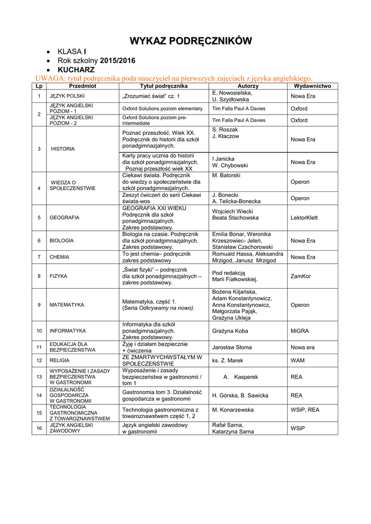 WYKAZ PODRĘCZNIKÓW KLASA I Rok szkolny 2015/2016 KUCHARZ UWAGA: tytuł podręcznika poda nauczyciel na pierwszych zajęciach z języka angielskiego. Lp Przedmiot 1 JĘZYK POLSKI 2 JĘZYK ANGIELSKI POZIOM - 1 JĘZYK ANGIELSKI POZIOM - 2 3 4 HISTORIA WIEDZA O SPOŁECZEŃSTWIE Tytuł podręcznika „Zrozumieć świat” cz. 1 Autorzy E. Nowosielska, U. Szydłowska Wydawnictwo Nowa Era Oxford Solutions poziom elementary Tim Falla Paul A Davies Oxford Oxford Solutions poziom preintermediate Tim Falla Paul A Davies Oxford Poznać przeszłość. Wiek XX. Podręcznik do historii dla szkół ponadgimnazjalnych. Karty pracy ucznia do historii dla szkół ponadgimnazjalnych. Poznaj przeszłość wiek XX Ciekawi świata. Podręcznik do wiedzy o społeczeństwie dla szkół ponadgimnazjalnych. Zeszyt ćwiczeń do serii Ciekawi świata-wos GEOGRAFIA XXI WIEKU Podręcznik dla szkół ponadgimnazjalnych. Zakres podstawowy. Biologia na czasie. Podręcznik dla szkół ponadgimnazjalnych. Zakres podstawowy. To jest chemia– podręcznik zakres podstawowy S. Roszak J. Kłaczow I Janicka W. Chybowski Nowa Era Nowa Era M. Batorski Operon J. Bonecki A. Telicka-Bonecka Wojciech Wiecki Beata Stachowska Operon LektorKlett 5 GEOGRAFIA 6 BIOLOGIA 7 CHEMIA 8 FIZYKA „Świat fizyki” – podręcznik dla szkół ponadgimnazjalnych – zakres podstawowy. Pod redakcją Marii Fiałkowskiej. ZamKor 9 MATEMATYKA Matematyka, część 1. (Seria Odkrywamy na nowo). Bożena Kiljańska, Adam Konstantynowicz, Anna Konstantynowicz, Małgorzata Pająk, Grażyna Ukleja Operon 10 INFORMATYKA Grażyna Koba MiGRA 11 EDUKACJA DLA BEZPIECZEŃSTWA Jarosław Słoma Nowa era 12 RELIGIA ks. Z. Marek WAM 13 14 15 16 WYPOSAŻENIE I ZASADY BEZPIECZEŃSTWA W GASTRONOMII DZIAŁALNOŚĆ GOSPODARCZA W GASTRONOMII TECHNOLOGIA GASTRONOMICZNA Z TOWAROZNAWSTWEM JĘZYK ANGIELSKI ZAWODOWY Informatyka dla szkół ponadgimnazjalnych. Zakres podstawowy. Żyję i działam bezpiecznie + ćwiczenia ZE ZMARTWYCHWSTAŁYM W SPOŁECZEŃSTWIE Wyposażenie i zasady bezpieczeństwa w gastronomii / tom 1 Emilia Bonar, Weronika Krzeszowiec- Jeleń, Stanisław Czachorowski Romuald Hassa, Aleksandra Mrzigod, Janusz Mrzigod Nowa Era Nowa Era A. Kasperek REA H. Górska, B. Sawicka REA Technologia gastronomiczna z towaroznawstwem część 1, 2 M. Konarzewska WSiP, REA Język angielski zawodowy w gastronomii Rafał Sarna, Katarzyna Sarna WSiP Gastronomia tom 3. Działalność gospodarcza w gastronomii WYKAZ PODRĘCZNIKÓW Lp 1 KLASA II Rok szkolny 2015/2016 KUCHARZ Przedmiot JĘZYK POLSKI JĘZYK ANGIELSKI POZIOM - 1 2 JĘZYK ANGIELSKI POZIOM - 2 3 4 HISTORIA PODSTAWY PRZEDSIĘBIORCZOŚCI 5 MATEMATYKA 6 RELIGIA 7 8 JĘZYK ANGIELSKI ZAWODOWY PODSTAWY PRZEDSIĘBIORCZOŚCI Tytuł podręcznika „Zrozumieć świat” cz.2 Oxford Solutions poziom elementary Oxford Solutions poziom elementary Poznać przeszłość. Wiek XX. Podręcznik do historii dla szkół ponadgimnazjalnych. Autorzy E. Nowosielska, U. Szydłowska Tim Falla, Paul A Davies Tim Falla, Paul A Davies S. Roszak J. Kłaczow Wydawnictwo Nowa Era Oxford Oxford Nowa Era Karty pracy ucznia do historii dla szkół ponadgimnazjalnych. Poznaj przeszłość wiek XX I Janicka W. Chybowski Nowa Era Krok w przedsiębiorczość Makieła/Rachwał Nowa Era Matematyka, część 2. (Seria Odkrywamy na nowo). Bożena Kiljańska, Adam Konstantynowicz, Anna Konstantynowicz, Małgorzata Pająk, Grażyna Ukleja Operon ks. Z. Marek WAM Rafał Sarna, Katarzyna Sarna WSiP Krok w przedsiębiorczość Zbigniew Makieła Nowa Era ZE ZMARTWYCHWSTAŁYM W RODZINIE Język angielski zawodowy w gastronomii 9 PODSTAWY ŻYWIENIA Zasady żywienia Ewa Superczyńska, REA 10 WYPOSAŻENIE ZAKŁADÓW GASTRONOMICZNYCH Wyposażenie zakładów gastronomicznych Agnieszka Kasperek REA 12 DZIAŁALNOŚĆ GOSPODARCZA W GASTRONOMII Gastronomia tom 3. Działalność gospodarcza w gastronomii H. Górska, B. Sawicka REA 13 TECHNOLOGIA GASTRONOMICZNA Z TOWAROZNAWSTWEM Technologia gastronomiczna z towaroznawstwem część 1, 2 M. Konarzewska WSiP, REA WYKAZ PODRĘCZNIKÓW Lp 1 KLASA III Rok szkolny 2015/2016 KUCHARZ Przedmiot JĘZYK POLSKI 2 JĘZYK ANGIELSKI 3 MATEMATYKA 4 WIEDZA O SPOŁECZEŃSTWIE Tytuł podręcznika „Zrozumieć świat” cz.3 New Matura Solutions poziom elementary Matematyka, część 2. (Seria Odkrywamy na nowo). Ciekawi świata. Podręcznik do wiedzy o społeczeństwie dla szkół ponadgimnazjalnych. Zeszyt ćwiczeń do serii Ciekawi świata-wos 5 DZIAŁALNOŚĆ GOSPODARCZA W GASTRONOMII Gastronomia tom 3. Działalność gospodarcza w gastronomii 6 TECHNOLOGIA GASTRONOMICZNA Z TOWAROZNAWSTWEM Technologia gastronomiczna z towaroznawstwem część 1, 2 7 PRACOWNIA GASTRONOMICZNA 8 JĘZYK ANGIELSKI ZAWODOWY Zeszyt ćwiczeń z technologii gastronomicznej z towaroznawstwem Język angielski zawodowy w gastronomii 15 RELIGIA W rodzinie Autorzy E. Nowosielska, U. Szydłowska Tim Falla, Paul A Davies Bożena Kiljańska, Adam Konstantynowicz, Anna Konstantynowicz, Małgorzata Pająk, Grażyna Ukleja M. Batorski Wydawnictwo Nowa Era Oxford Operon Operon J. Bonecki A. Telicka-Bonecka Operon H. Górska, B. Sawicka REA M. Konarzewska WSiP, REA Ewa Superczyńska eMPI 2 Rafał Sarna, Katarzyna Sarna WSiP ks. Z. Marek WAM